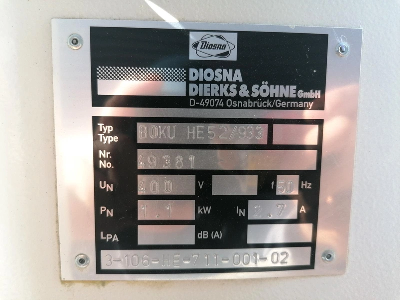 Diosna Dierks & Sohne GmbH steel lifter for mixing bowls, model: BOKU HE52/933, serial number: 49381, 400 V, 50Hz, 1.1 kW, 2.7 A, dimensions: 2000 mm x 1400 mm x 2500 mm.
