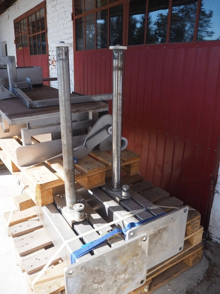 2 s/s Itec lifters for 200 liter meat bins, elevating height: 4150 mm, total dimensions: 5200 mm x 1250 mm x 1550 mm.