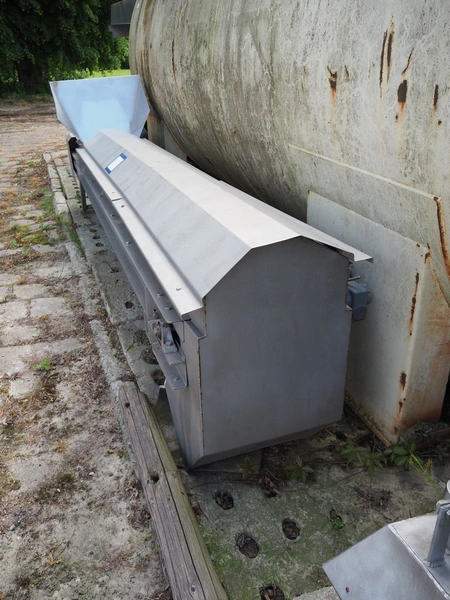 Elevating belt, plastic belt with dividers, belt width: 450 mm, divider height: 50 mm, distance between dividers: 255 mm, total dimensions: 4320 mm x 800 mm x 1250 mm. Missing legs.