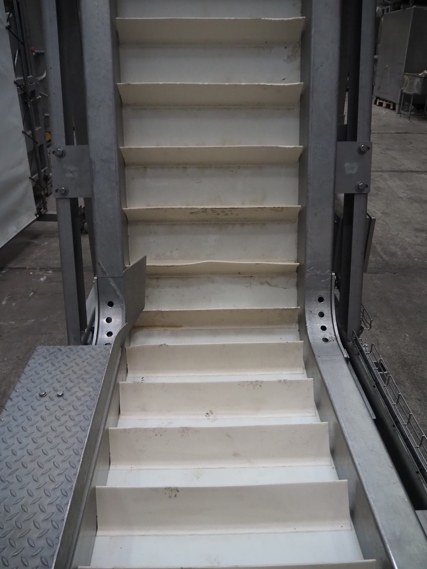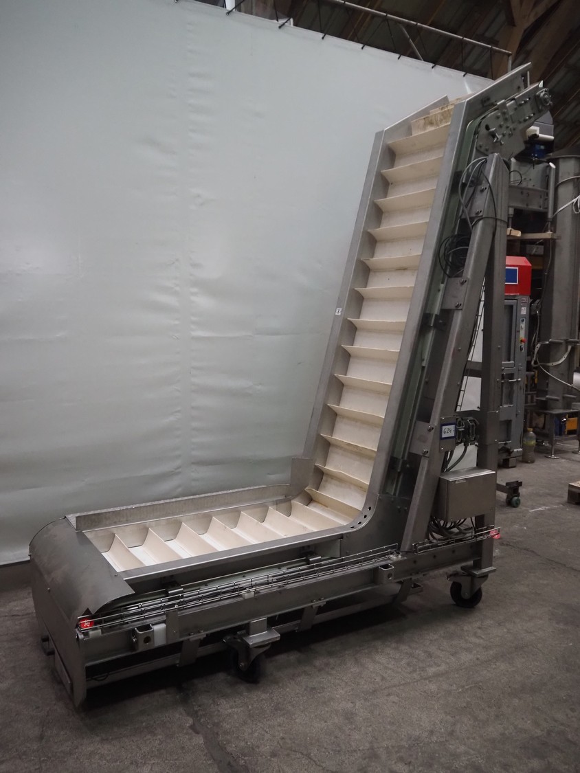 Mobile gooseneck elevating belt, plastic belt width dividers, belt width: 510 mm, divider height: 80 mm, distance between dividers: 160 mm, elevating height: 2500 mm, total dimensions: 2580 mm x 1030 mm x 2550 mm.