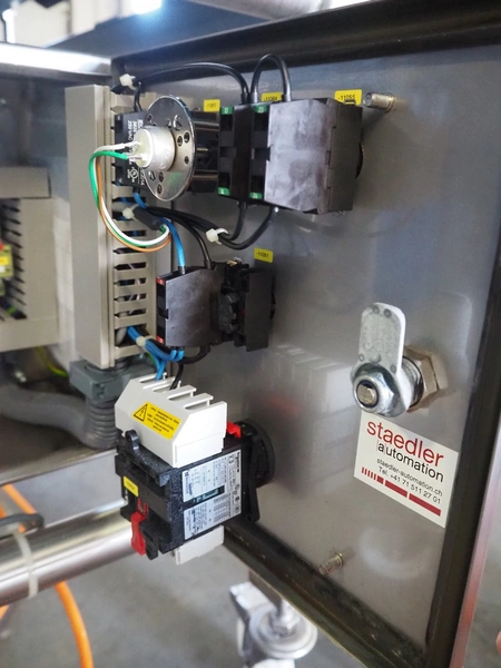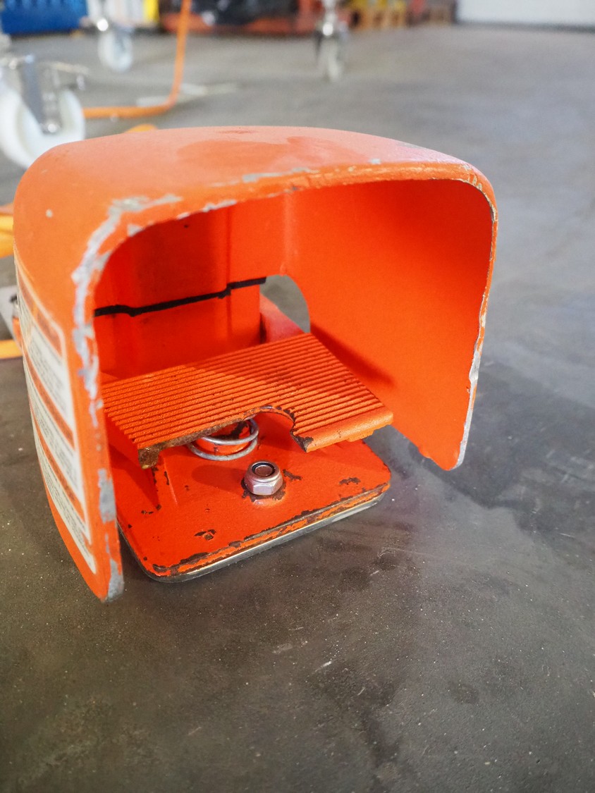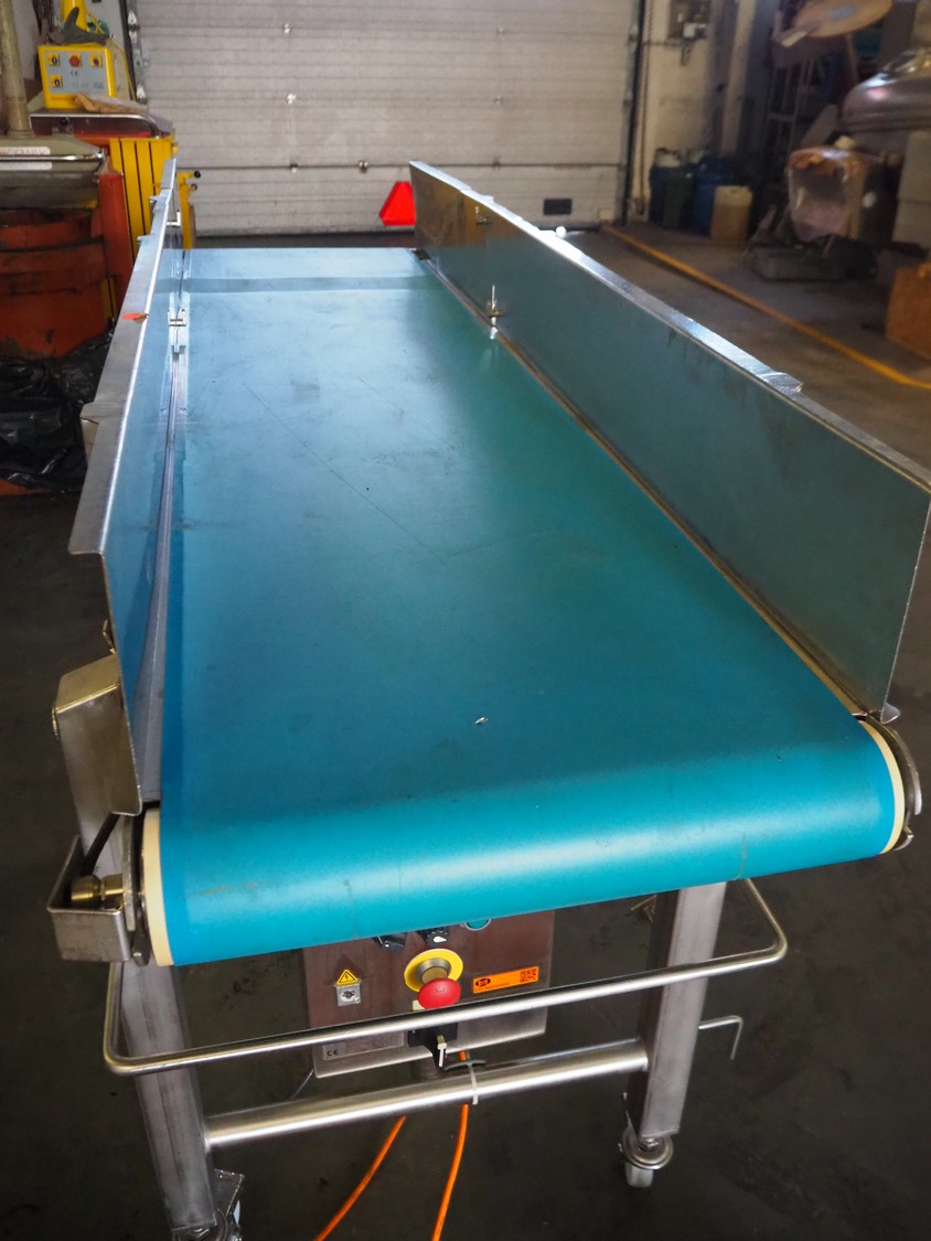 Fördertechnik GmbH mobile transport belt, type: Übergabeband L4, serial number: 03177, year of construction: 2015, s/s frame, plastic belt, belt width: 580 mm, foot control, total dimensions: 2330 mm x 730 mm x 1200 mm.