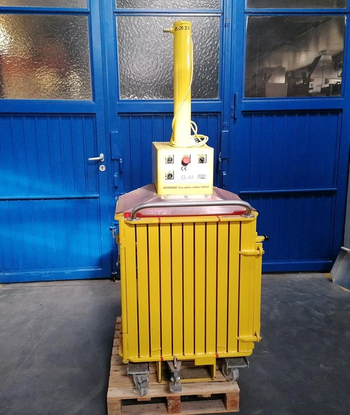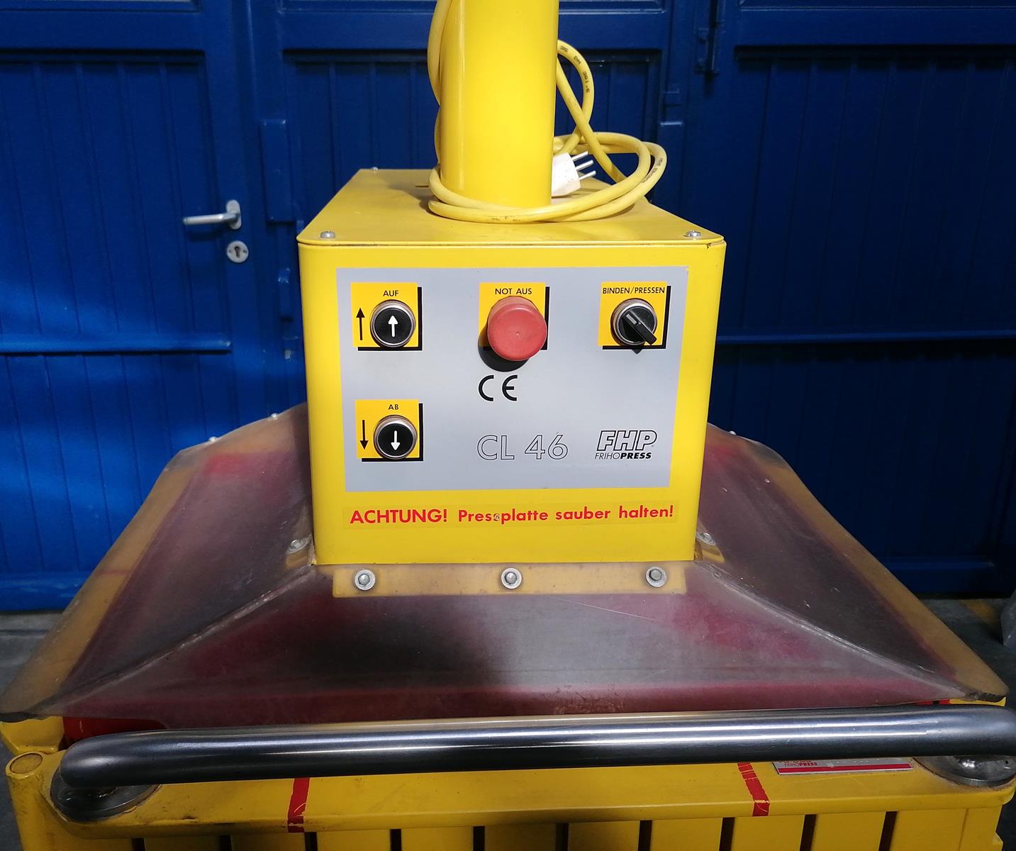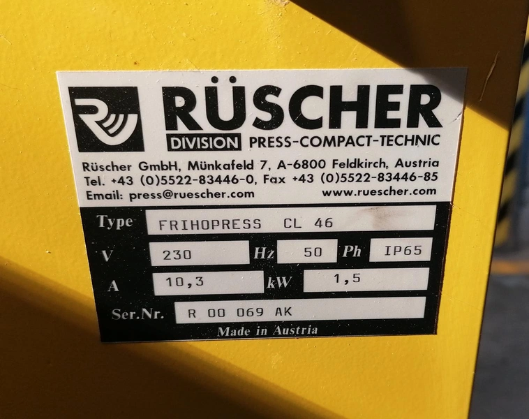 Ruscher GmbH waste baler, type: FRIHOPRESS CL 46, serial number: R 00 069 AK, 230 V, 50 Hz, IP 65, 10.3 A, 1.5 kW, dimensions: 1000 mm x 900 mm x 1950 mm.