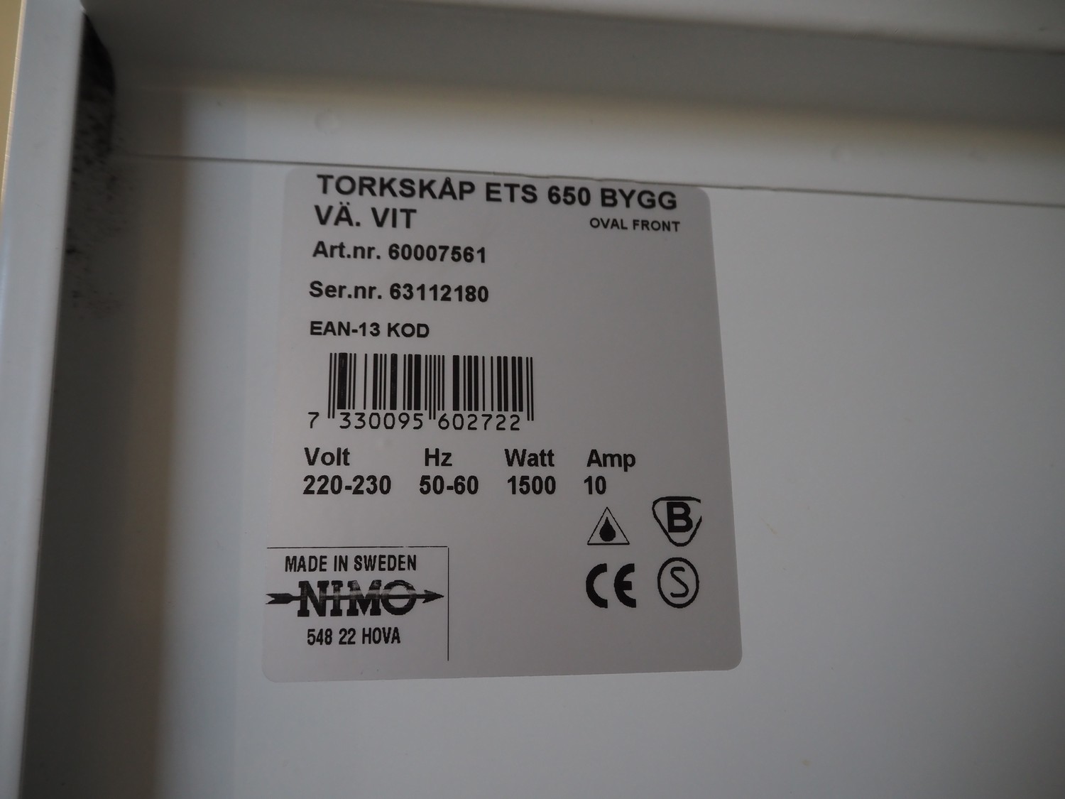 Torkskåp dryer, model: ETS 650 BYGG, serial number: 63112180, 220-230 V, 50-60 Hz, 1500 W, 10 A, dimensions: 600 mm x 600 mm x 1900 mm.