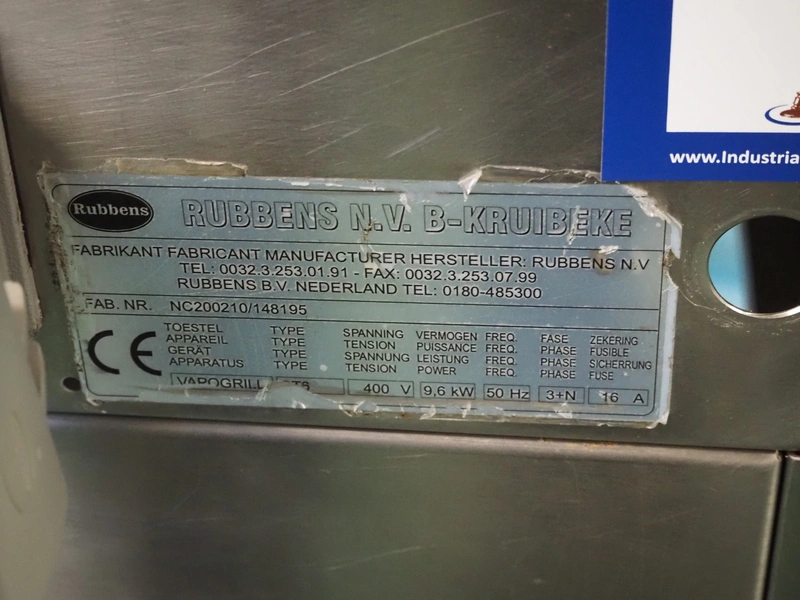 Rubbens grill, fabrication number: NC200210/148195, 400 V, 3 Ph, 50 Hz, 16 A, 9.6 kW, dimensions: 1000 mm x 700 mm x 1000 mm.