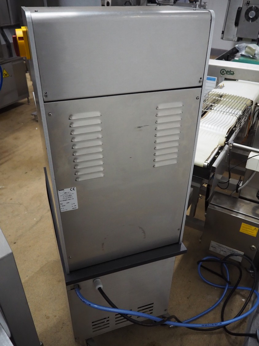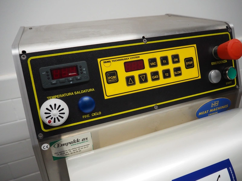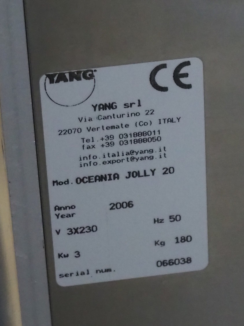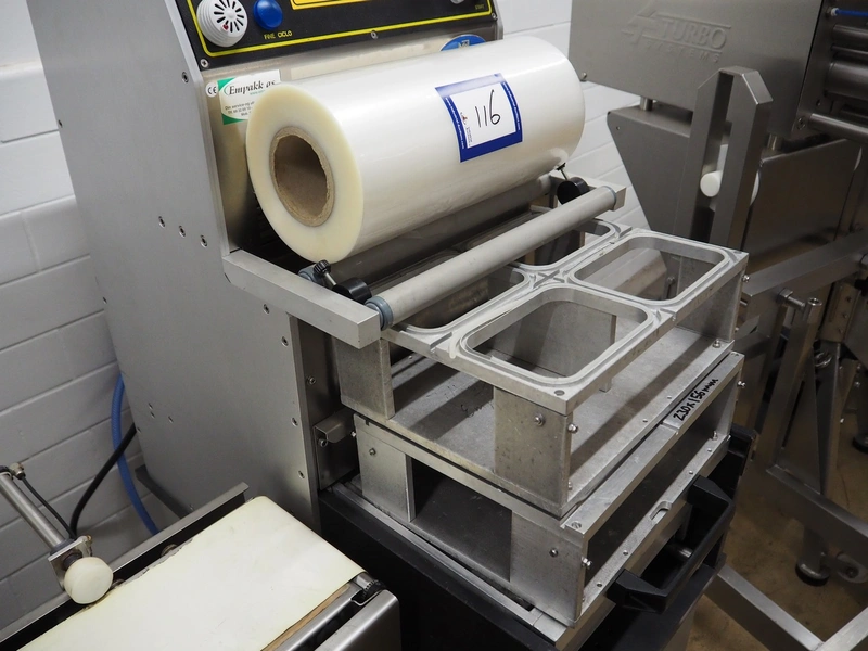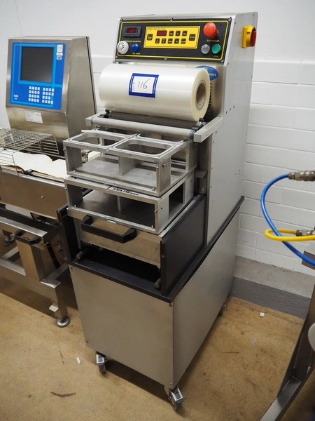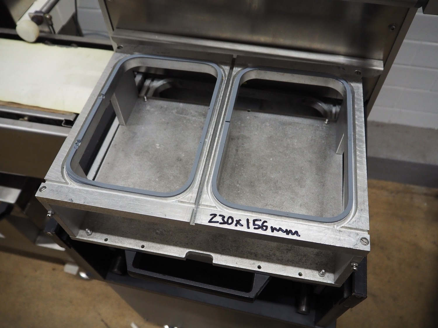 Yang Srl mobile traysealer, dye: 335 mm x 260 mm, total dimensions: 800 mm x 450 mm x 1460 mm. Including extra dye sets, dimensions: (4x) 170 mm x 125 mm, (2x) 230 mm x 160 mm.
