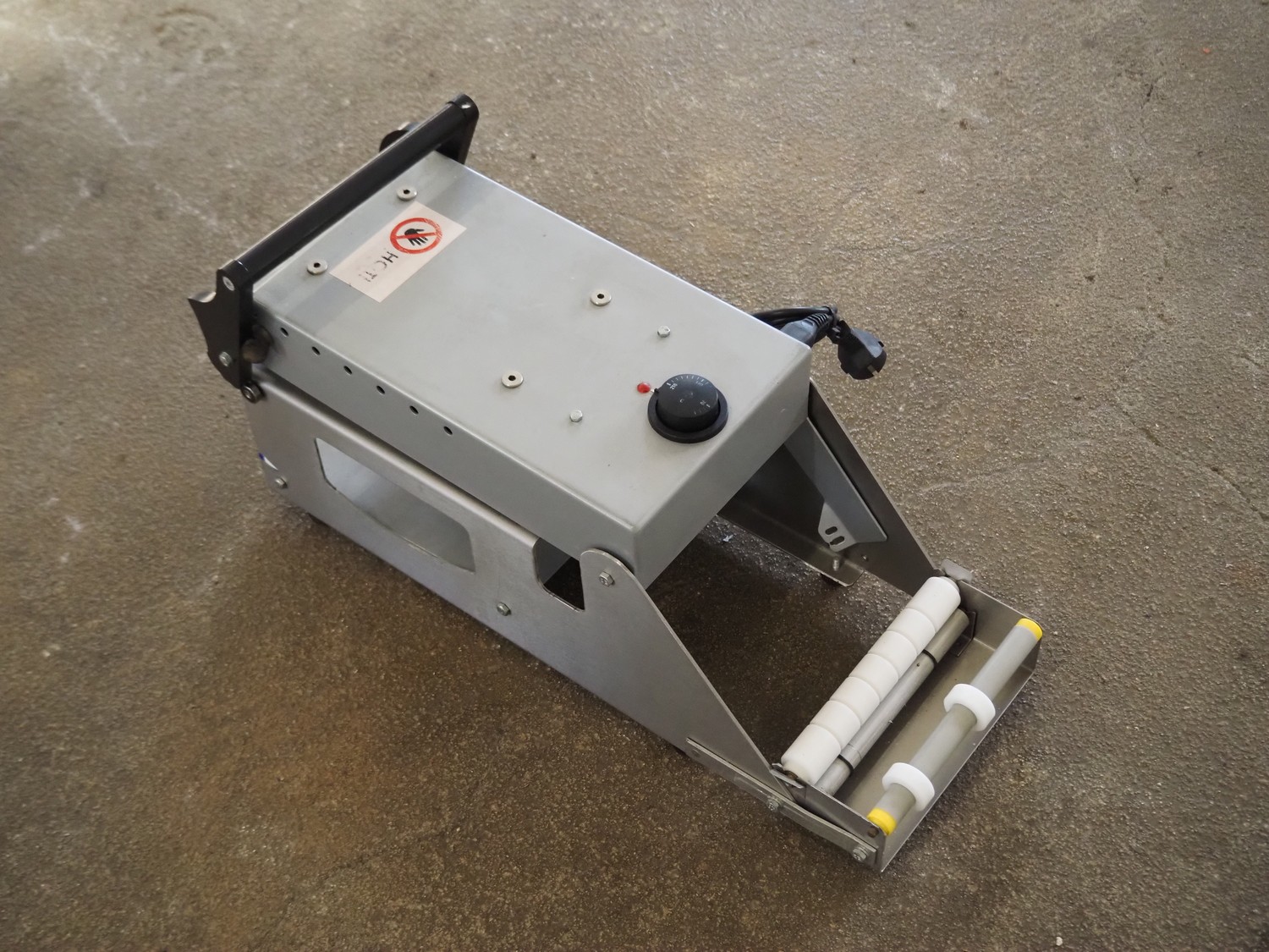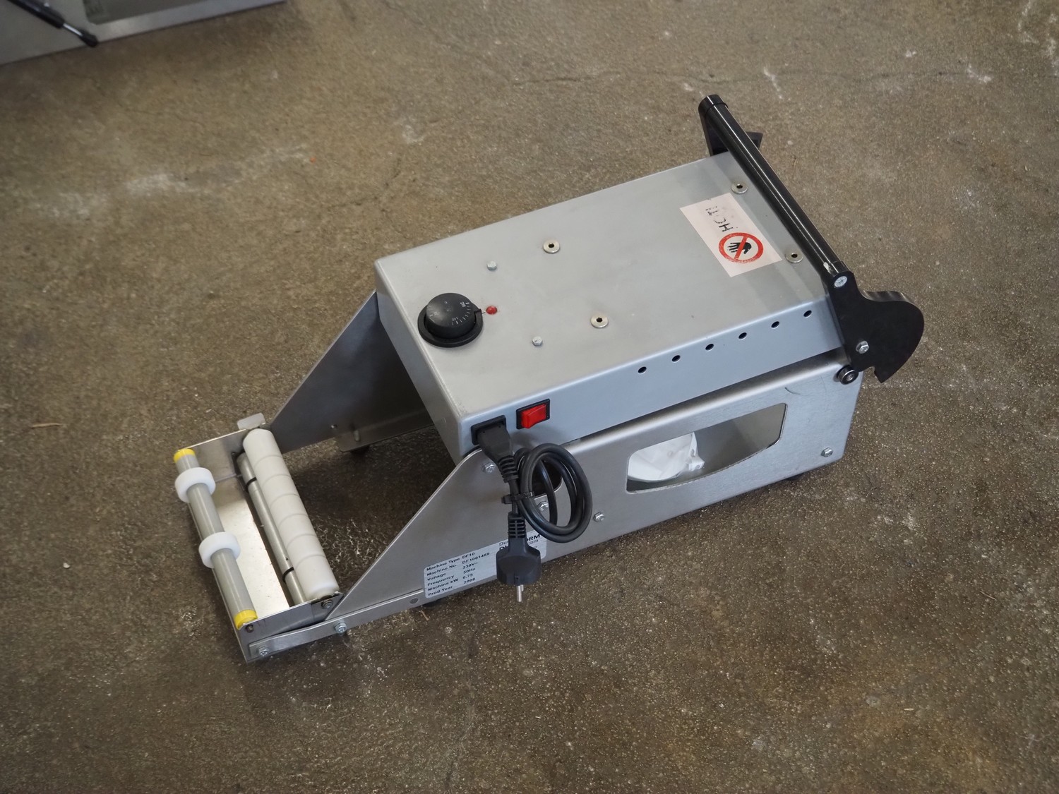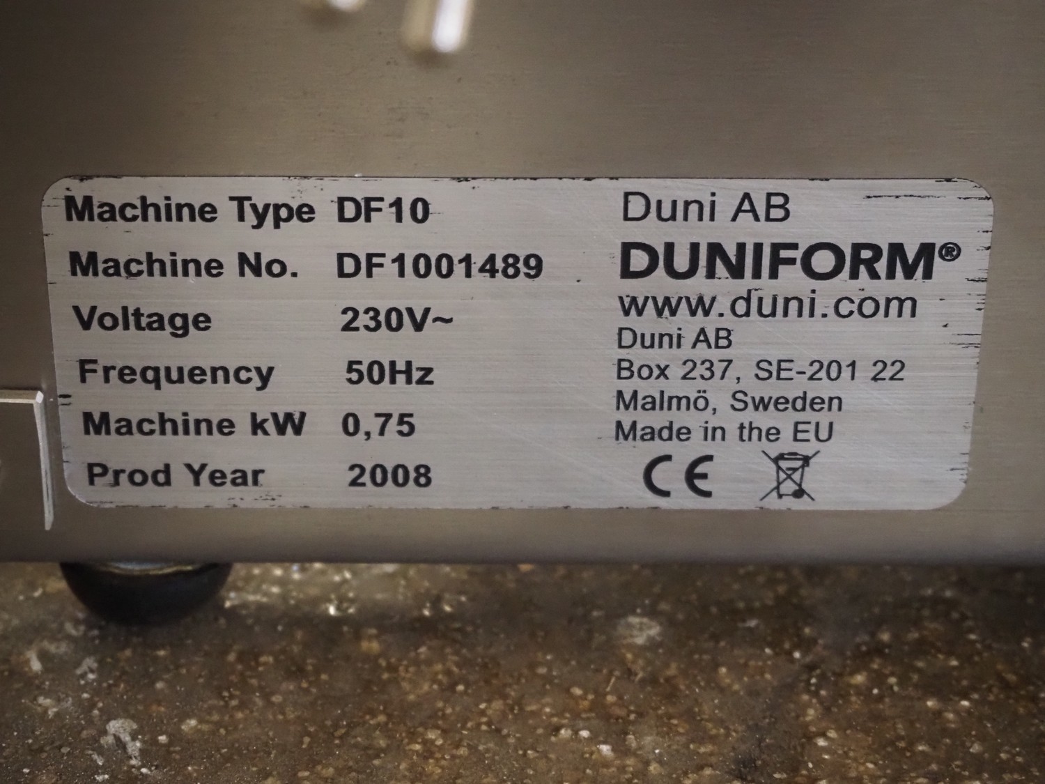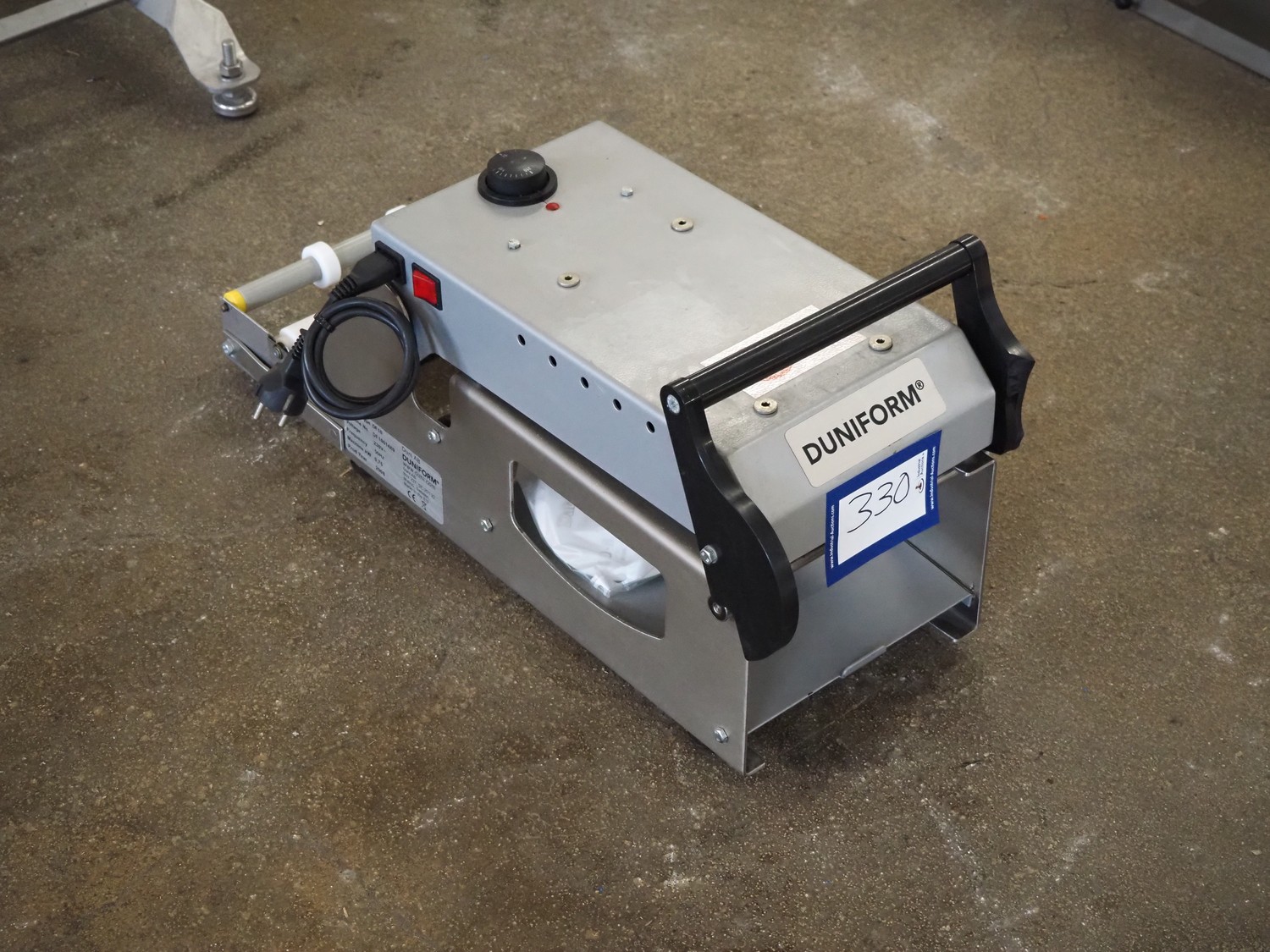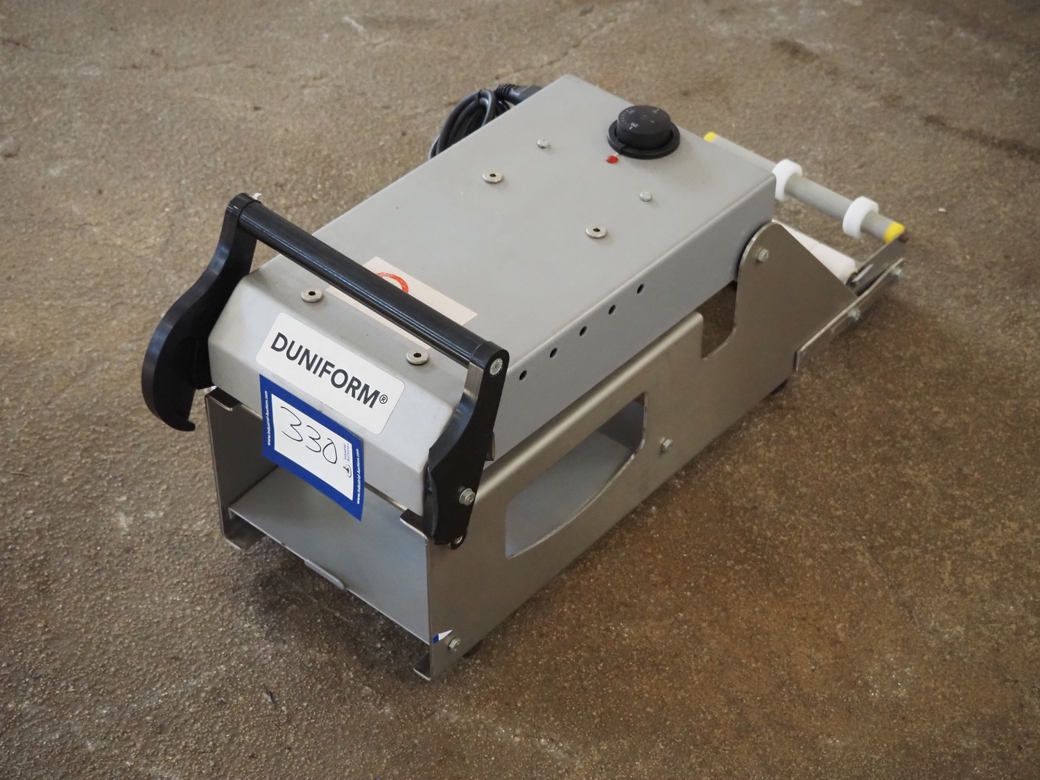 DuniForm table model traysealer, machine type: DF10, machine number: DF1001489, year of construction: 2008, dye dimensions: Ø 180 mm, 230 V, 50 Hz, 0.75 kW, dimensions: 620 mm x 250 mm x 250 mm, damaged.