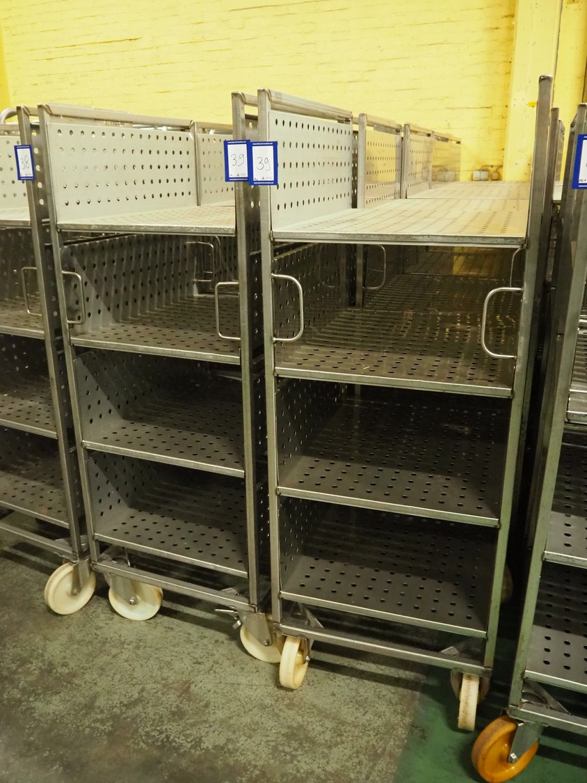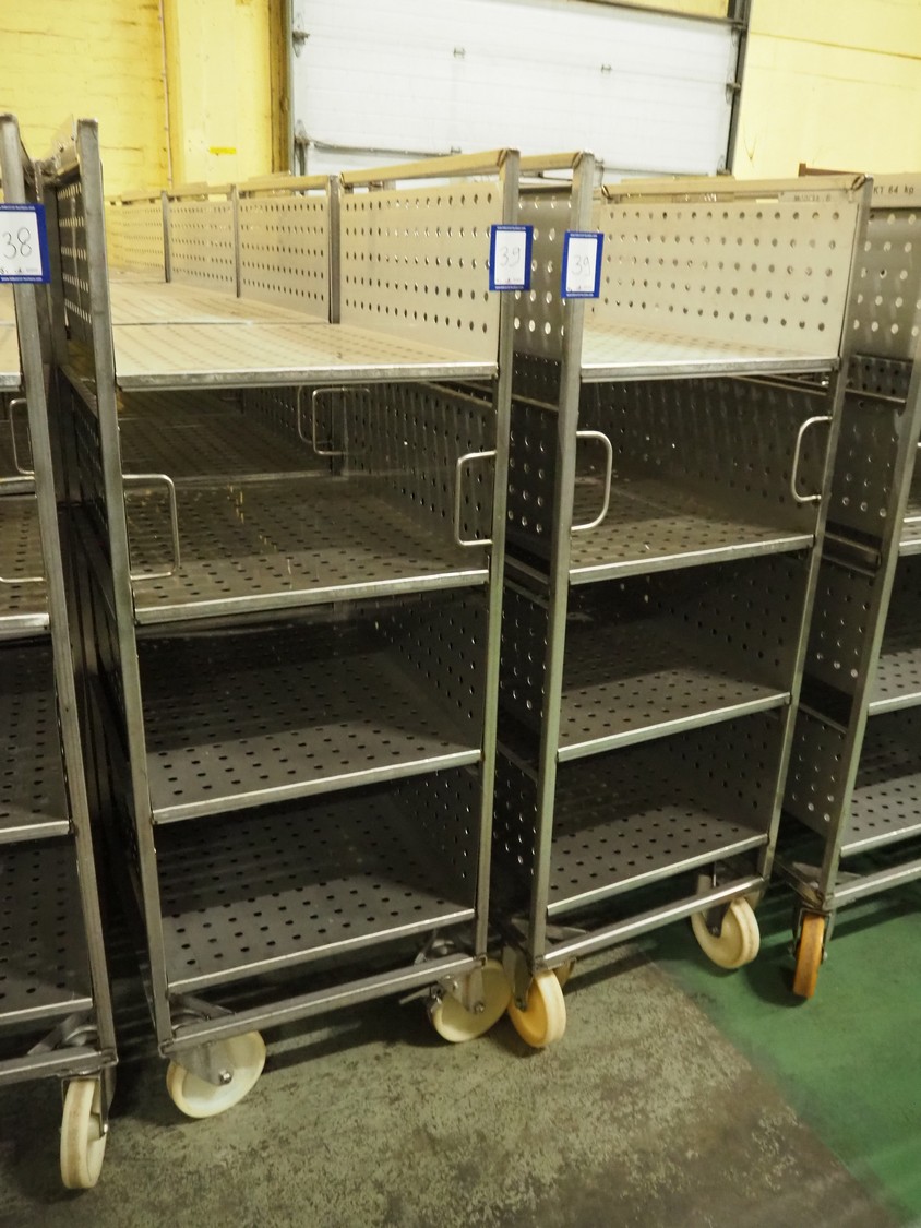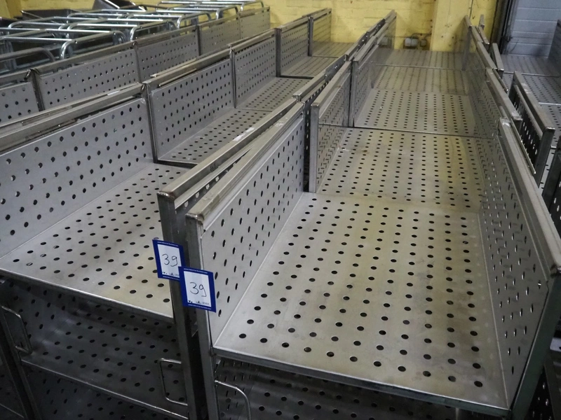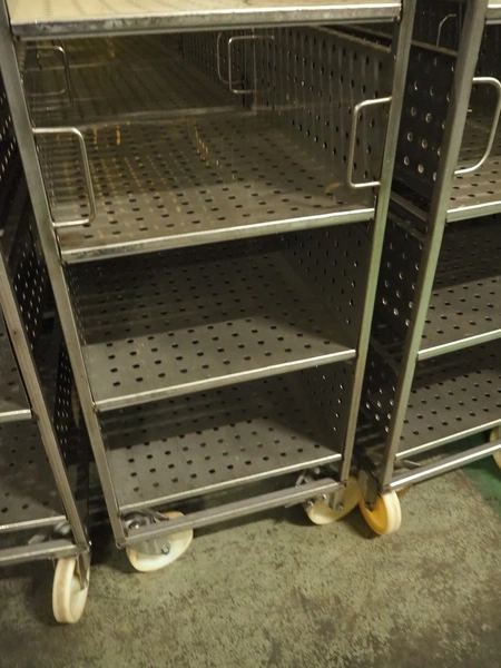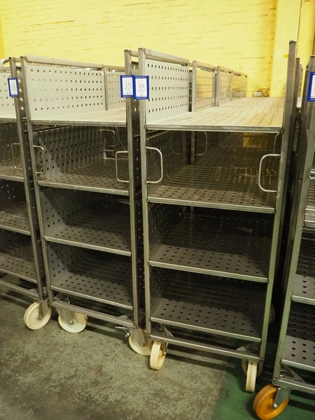 10 s/s trolleys, 5 floors each, dimensions each floor: 800 mm x 600 mm, total dimensions: (10x) 800 mm x 650 mm x 1830 mm.