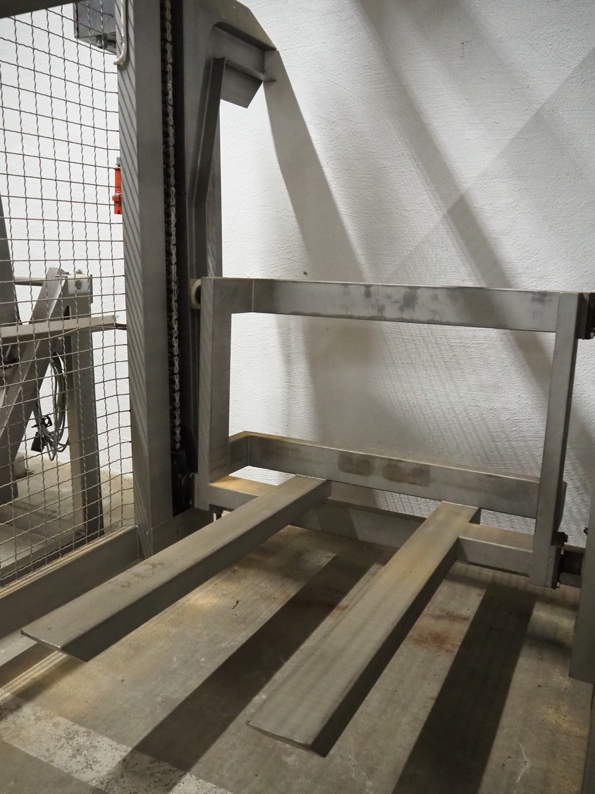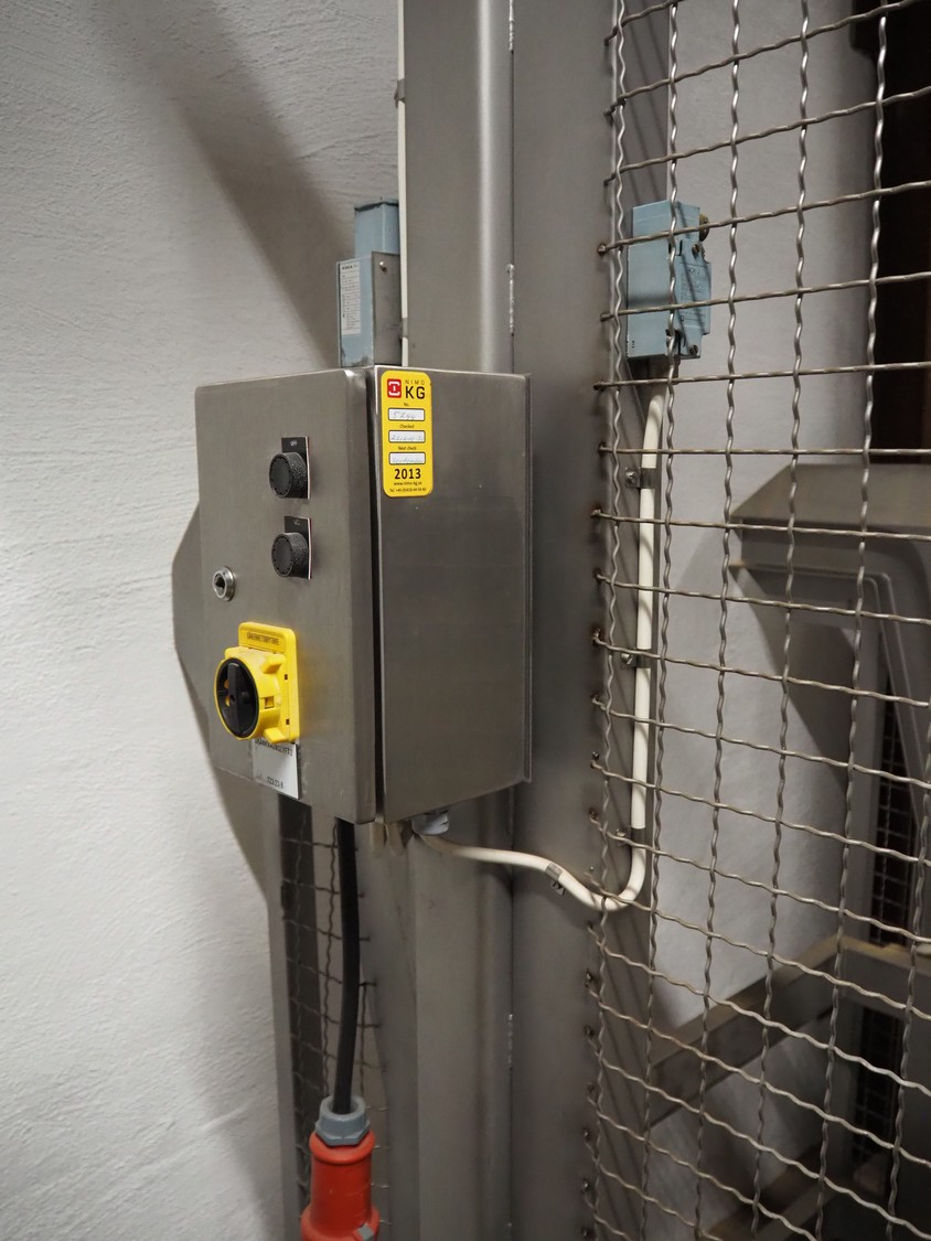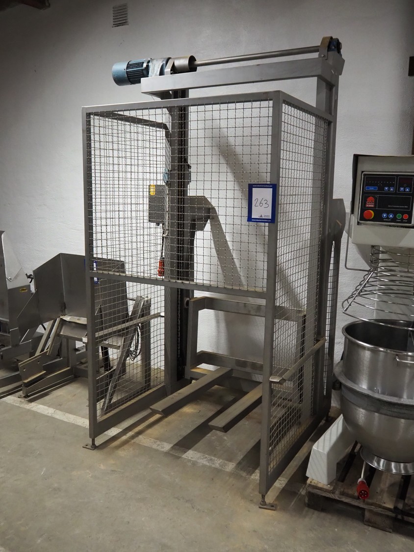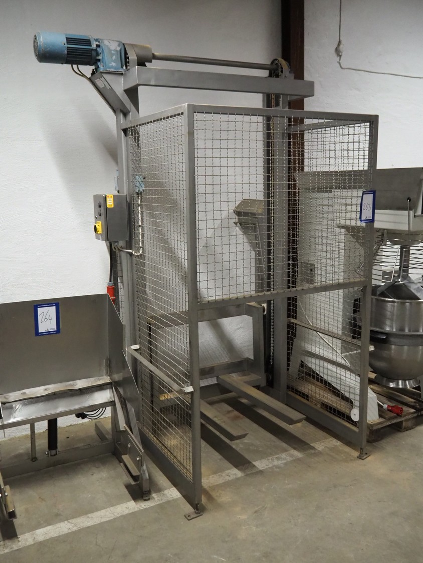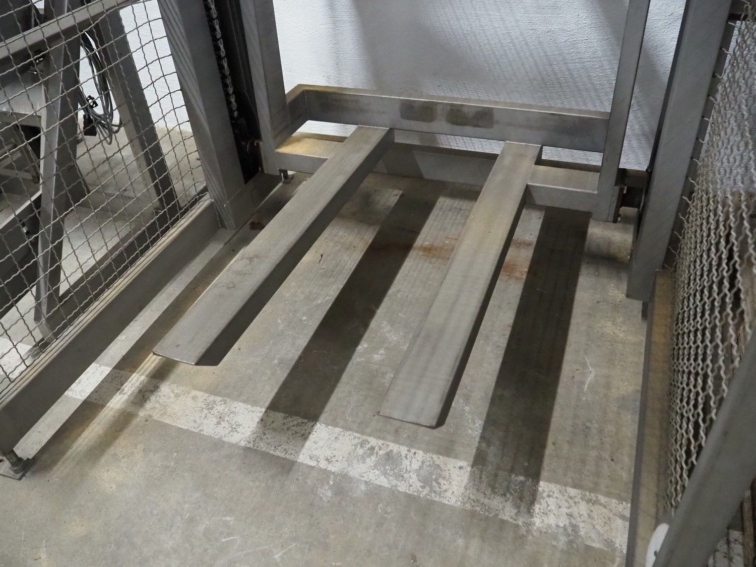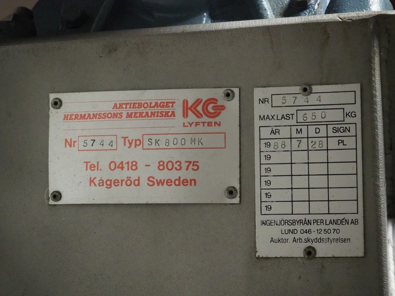 KG Lyften AB lifting and tilting device for pallet boxes, type: SK 800 MK, number: 5744, clearance: 1100 mm x 860 mm, lifting height: 1550 mm, total dimensions: 1950 mm x 1600 mm x 2750 mm.