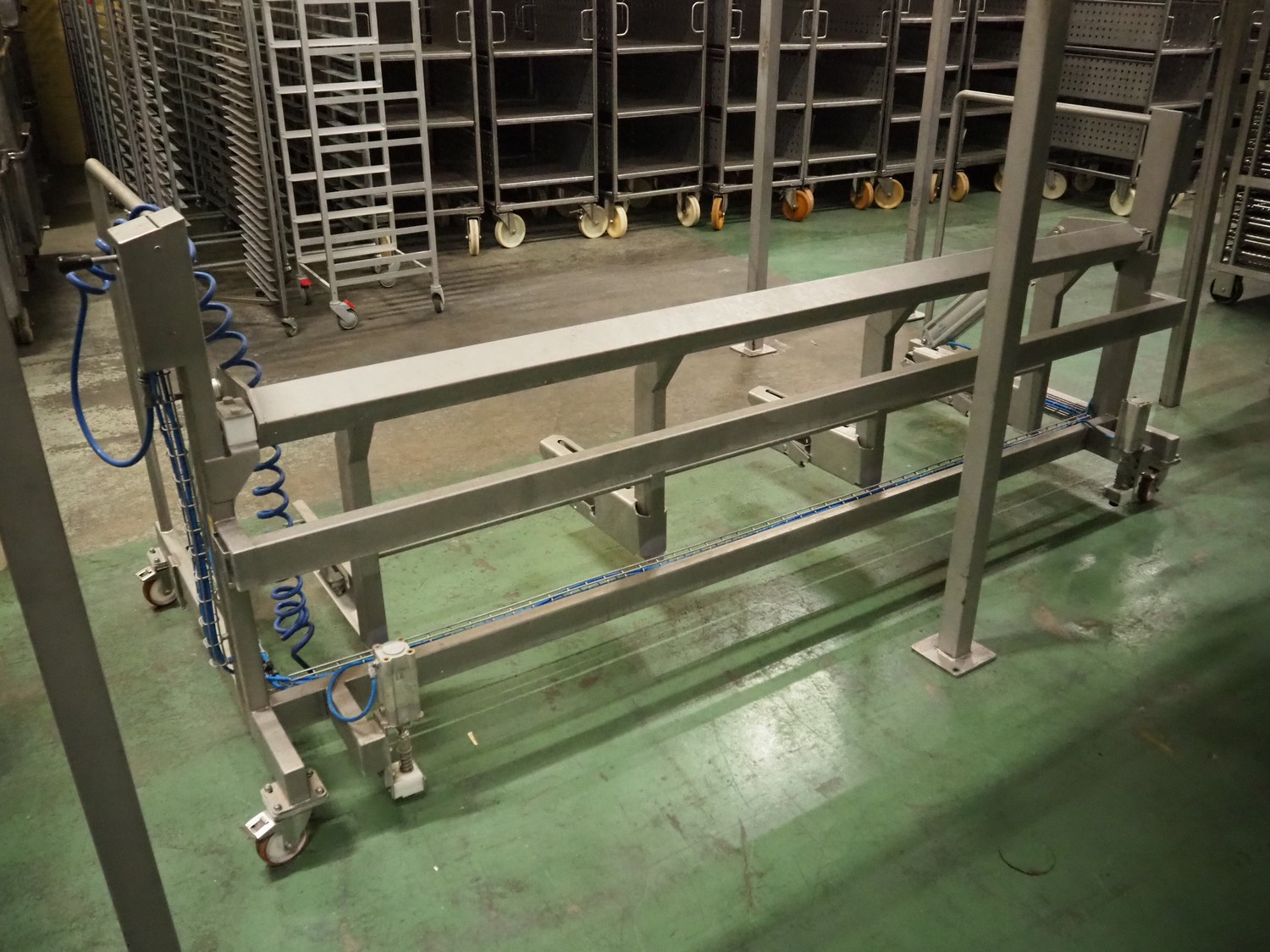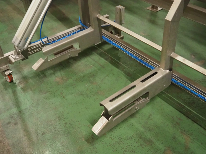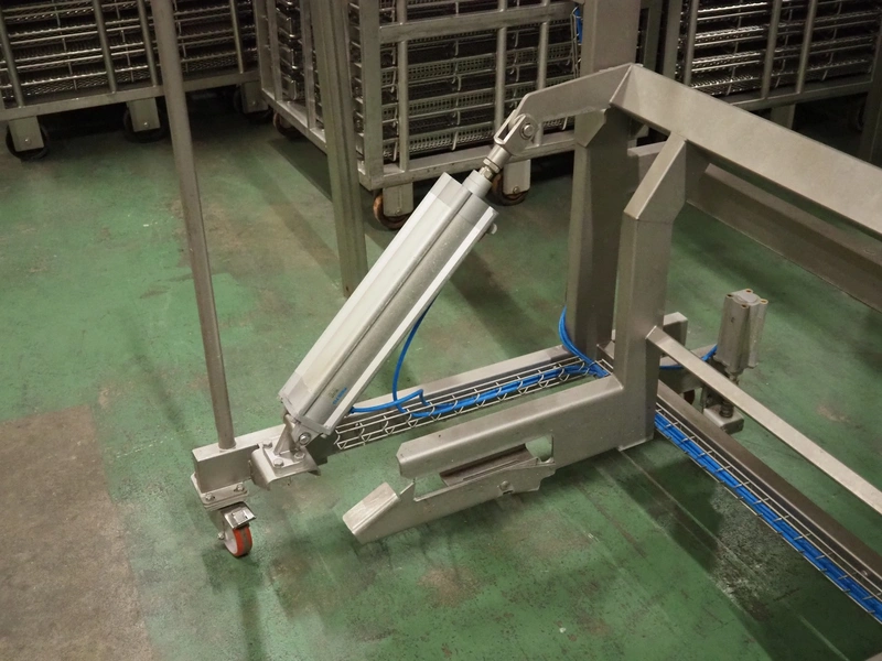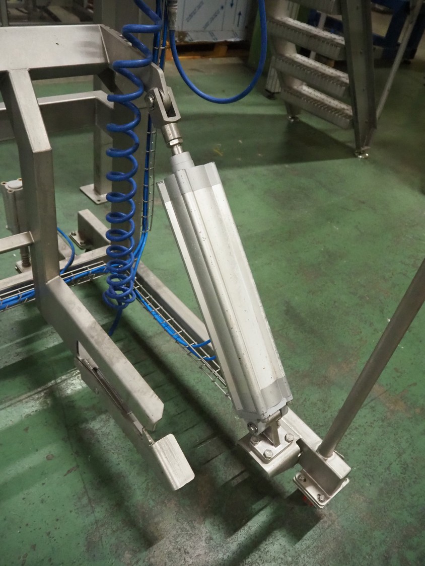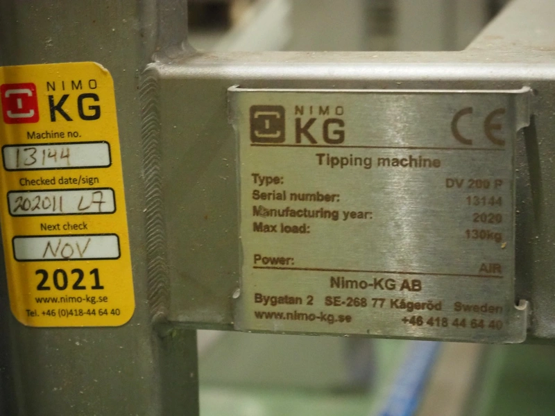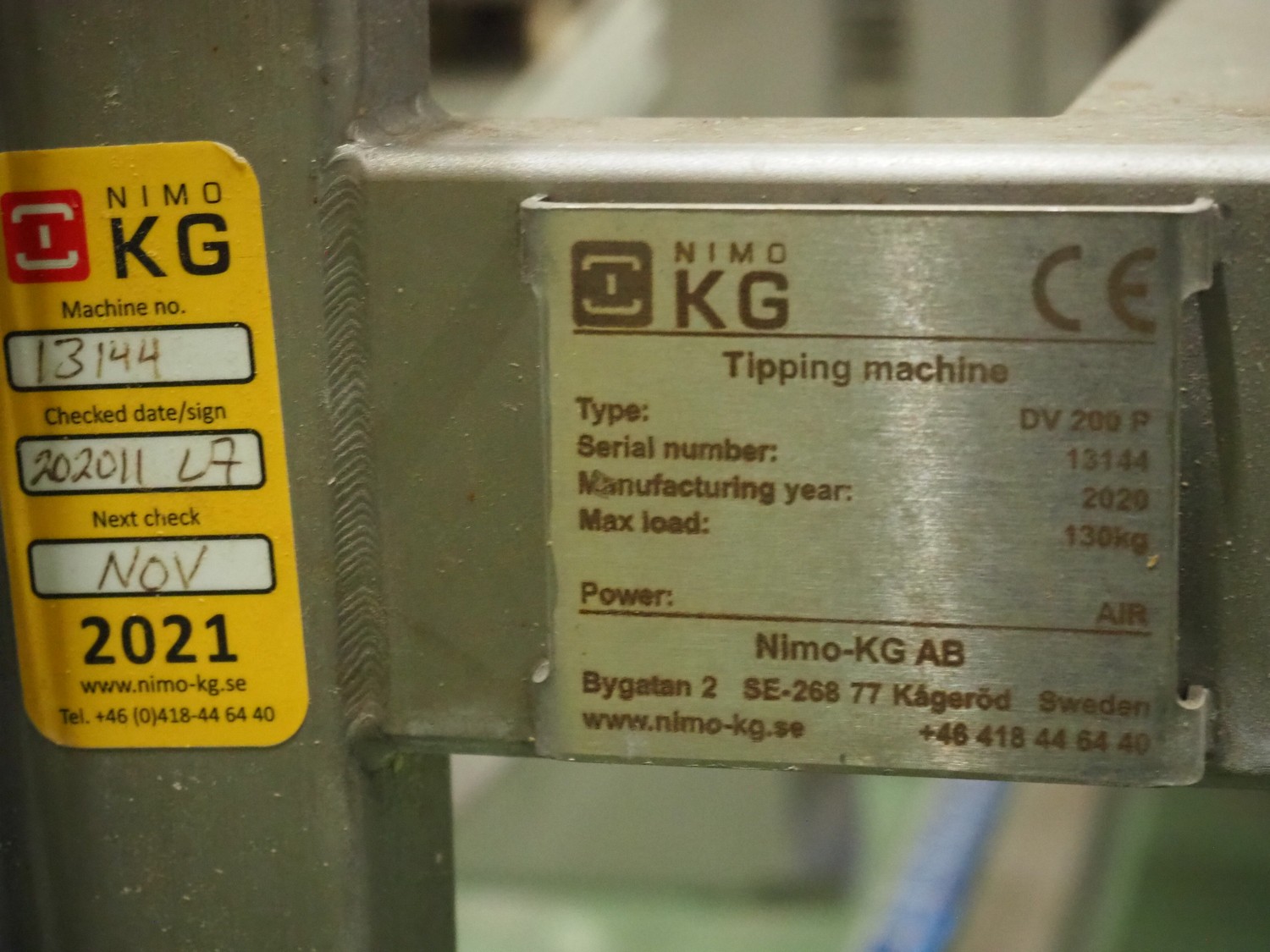 Nimo KG mobile pneumatic tilting device for 3 x 200 liter meat bins used for washing meat bins, type: DV 200 P, serial number: 13144, year of construction: 2020, maximum load: 130 kg, dimensions: 2800 mm x 1150 mm x 1200 mm.