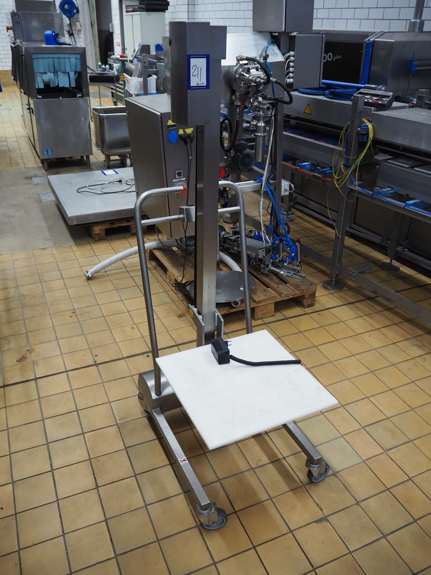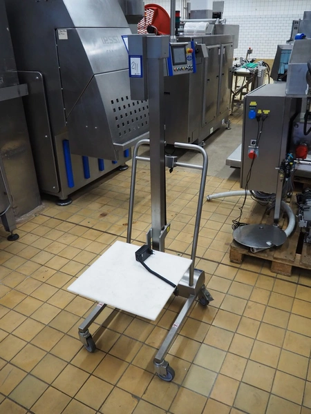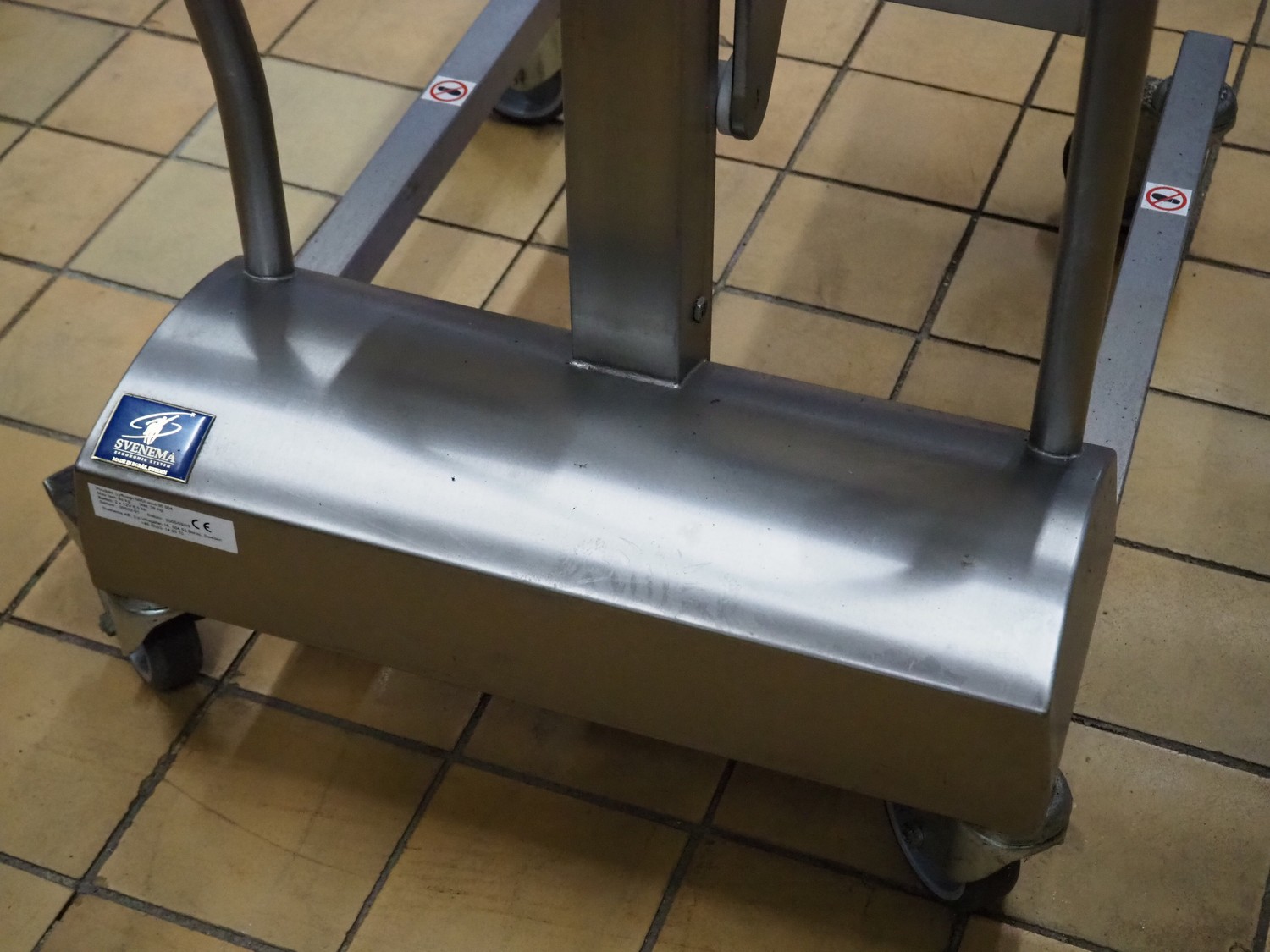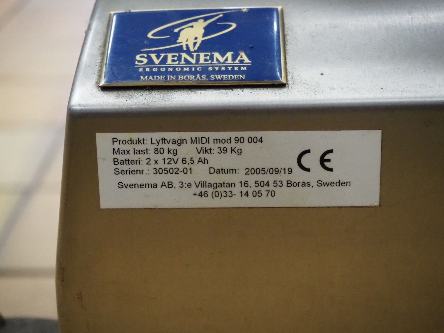 Svenema AB mobile lifter, product: Lyftvagn MIDI, model: 90 004, serial number: 30502-01, year of construction: 19/09/2005, 2x 12 V, 6.5 Ah, maximum capacity: 80 kg, weight: 39 kg, lifting height: 1530 mm, dimensions platform: 500 mm x 500 mm, total dimensions: 740 mm x 500 mm x 1650 mm.