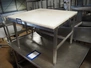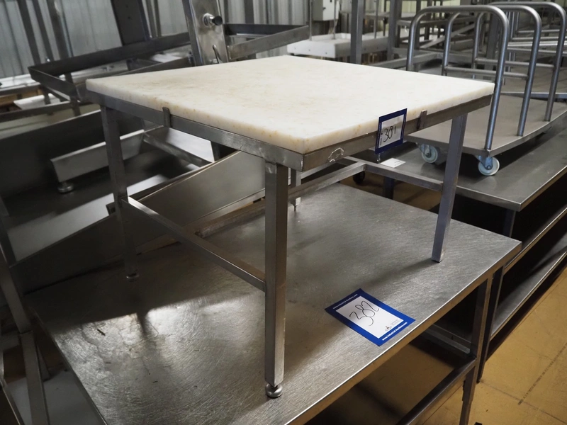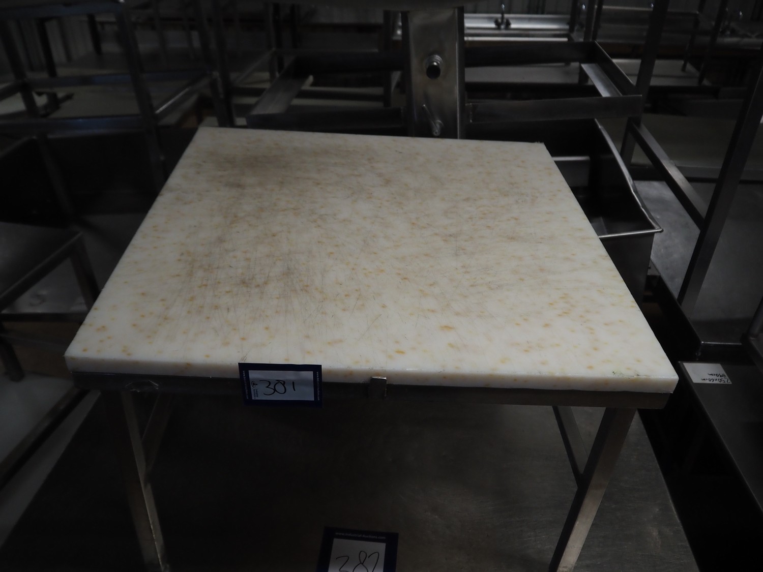 S/s table, plastic top, dimensions: 740 mm x 750 mm x 580 mm.