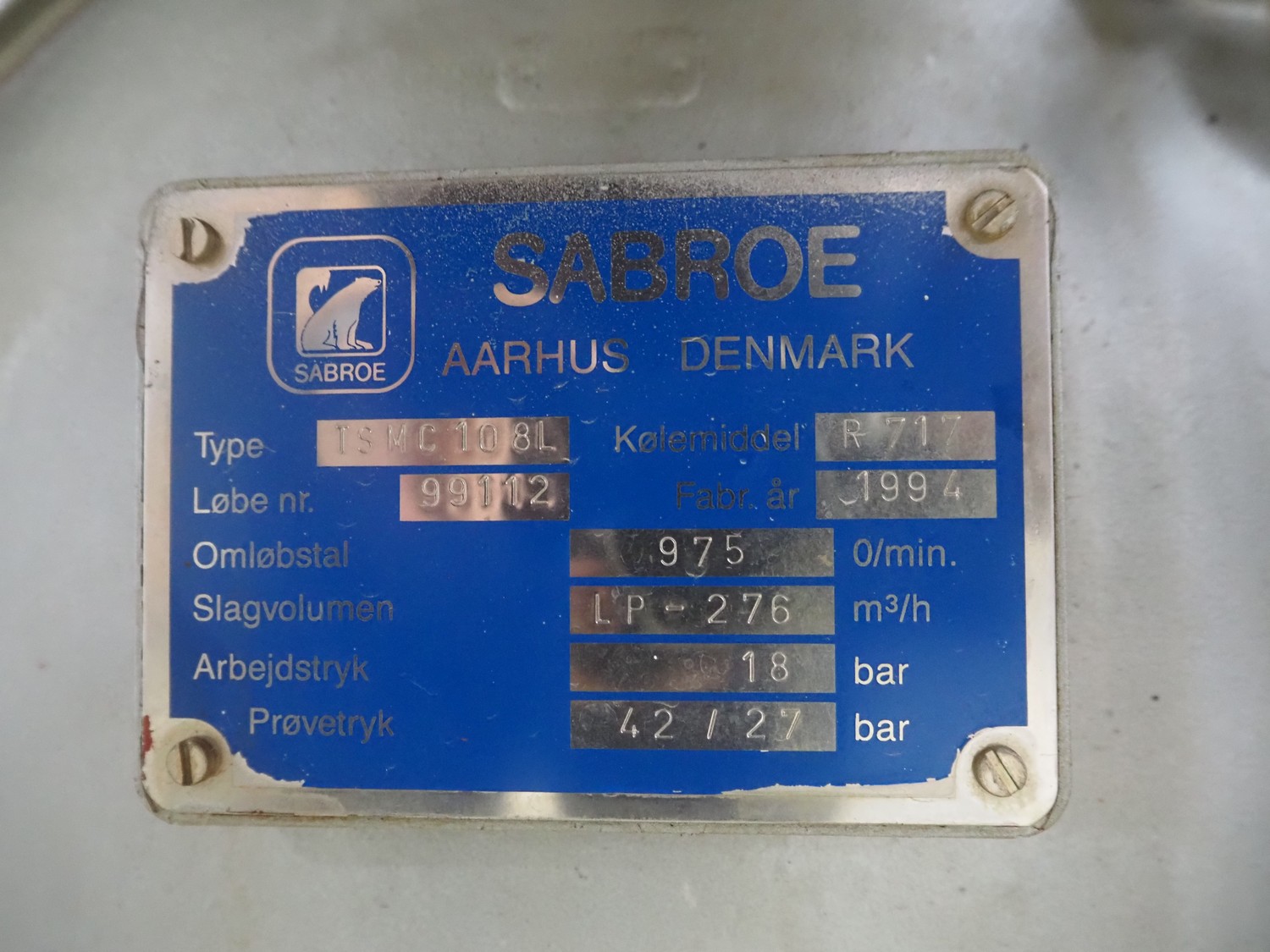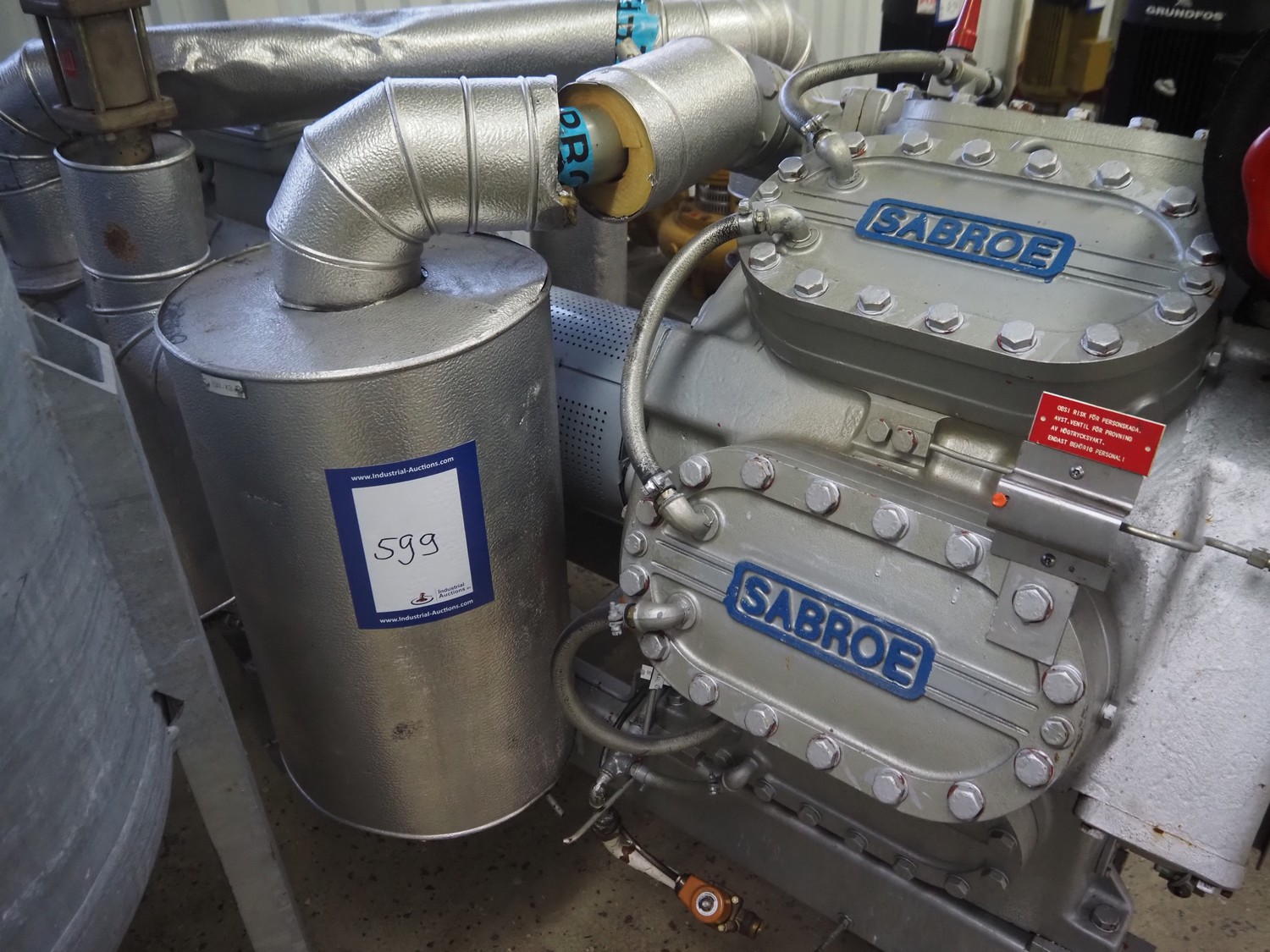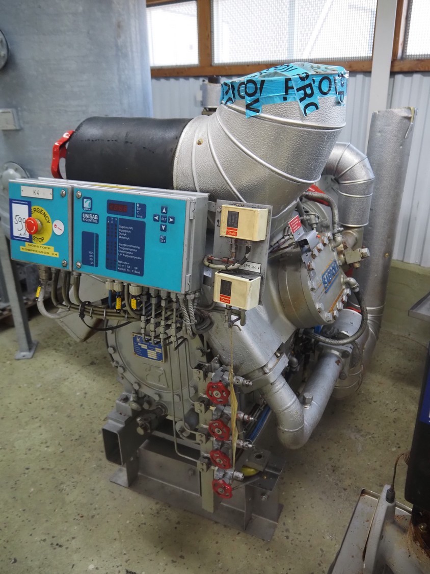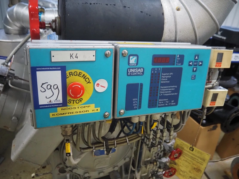 Sabroe Refrigeration two-stage reciprocating compressor, type: TSMC 108 L, serial number: 99112, year of construction: 1994, refrigerant: R717, volume: LP-276 m³ per hour, pressure: 18 bar, dimensions: 2200 mm x 1100 mm x 1550 mm. Lot located on another location in Sövestad (SE), viewing and pick up in consultation with Industrial Auctions BV.