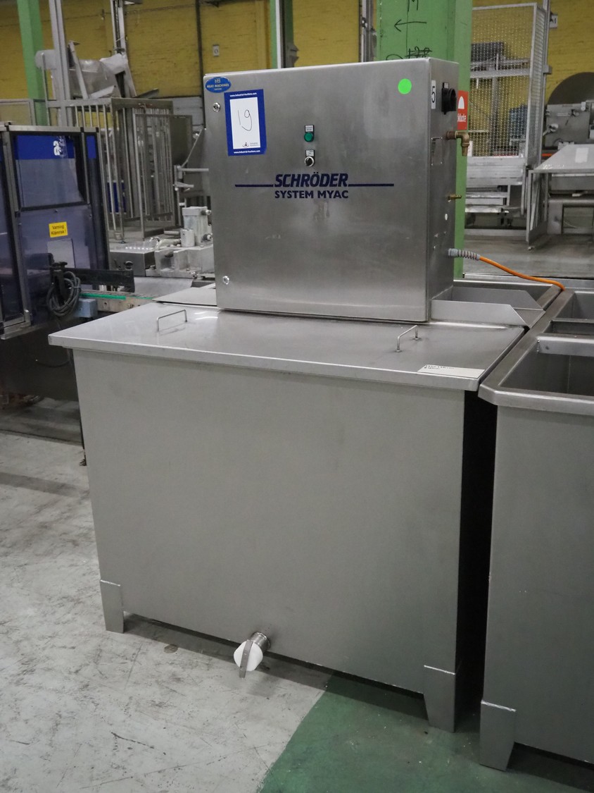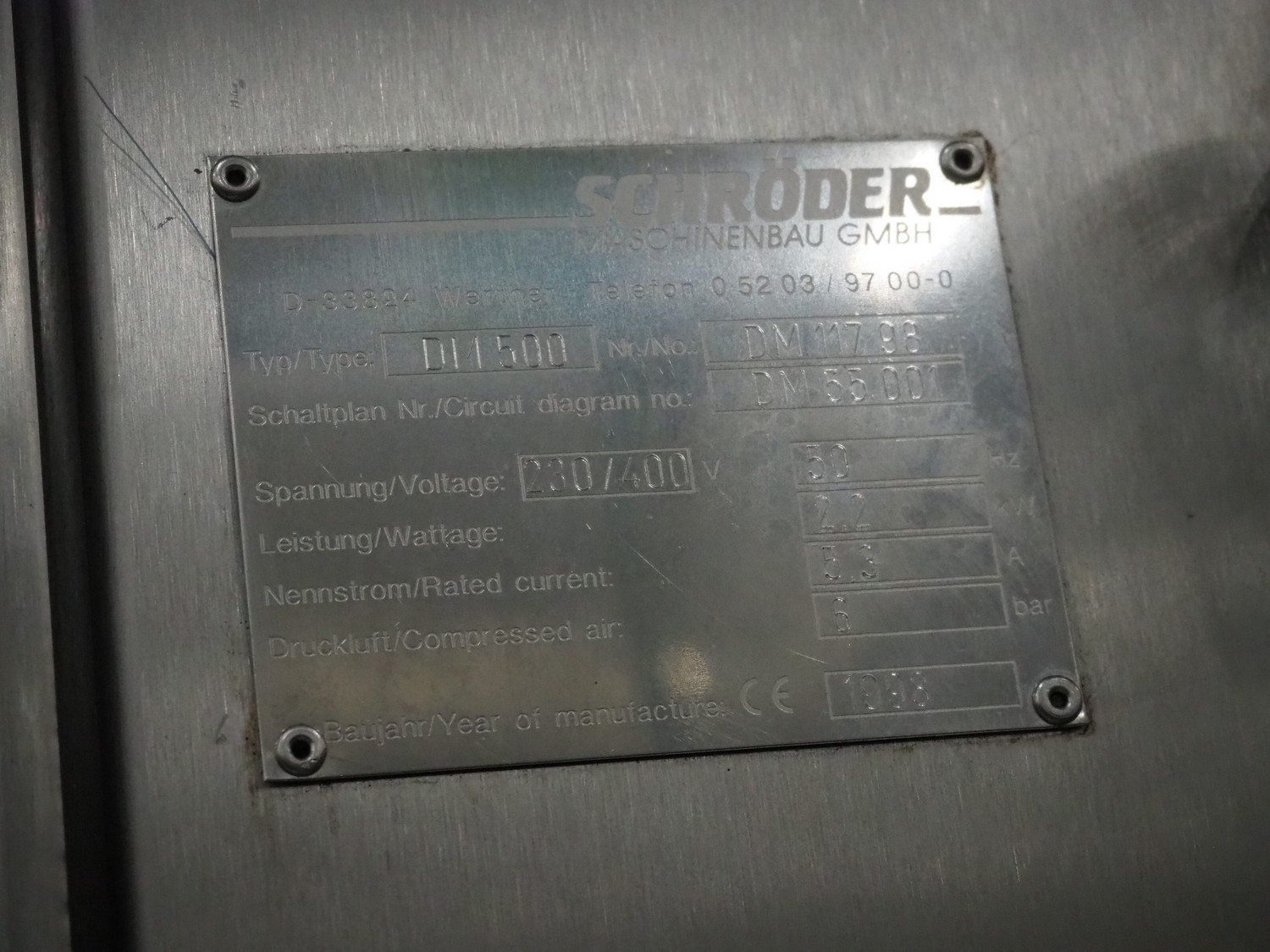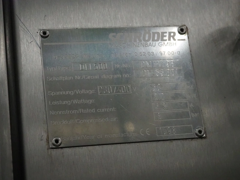 Schröder brine mixer, type: DM 500, number: DM 117 98, year of construction: 1998, 220/400 V, 50 Hz, 5.3 A, 2.2 kW, pressure: 6 bar, volume: 500 liter, dimensions: 1350 mm x 1350 mm x 1840 mm.
