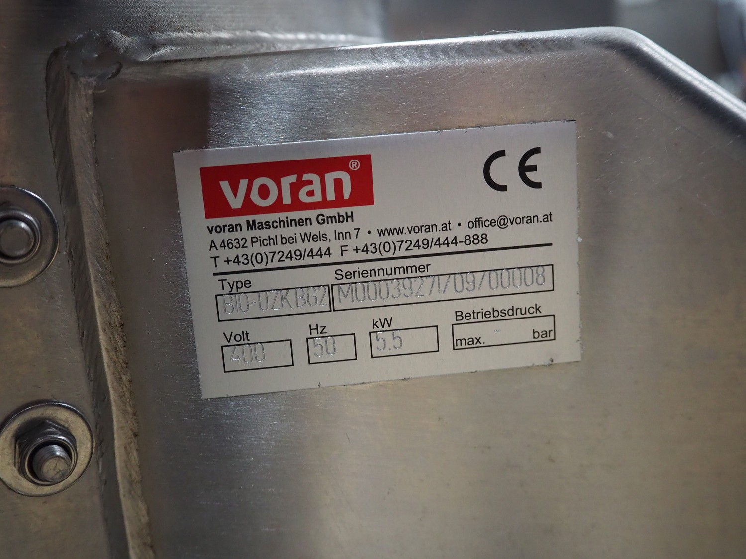 Voran Maschinen GmbH mobile organic shredder, type: BIO-UZKBG2, serial number: M00039271/09/00008, 400 V, 50 Hz, 5.5 kW, clearance: Ø 275 mm, total dimensions: 850 mm x 700 mm x 1600 mm.