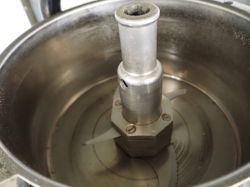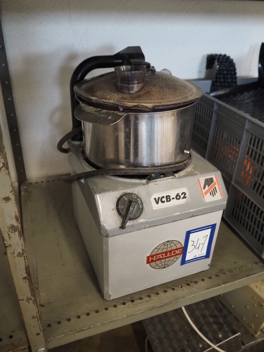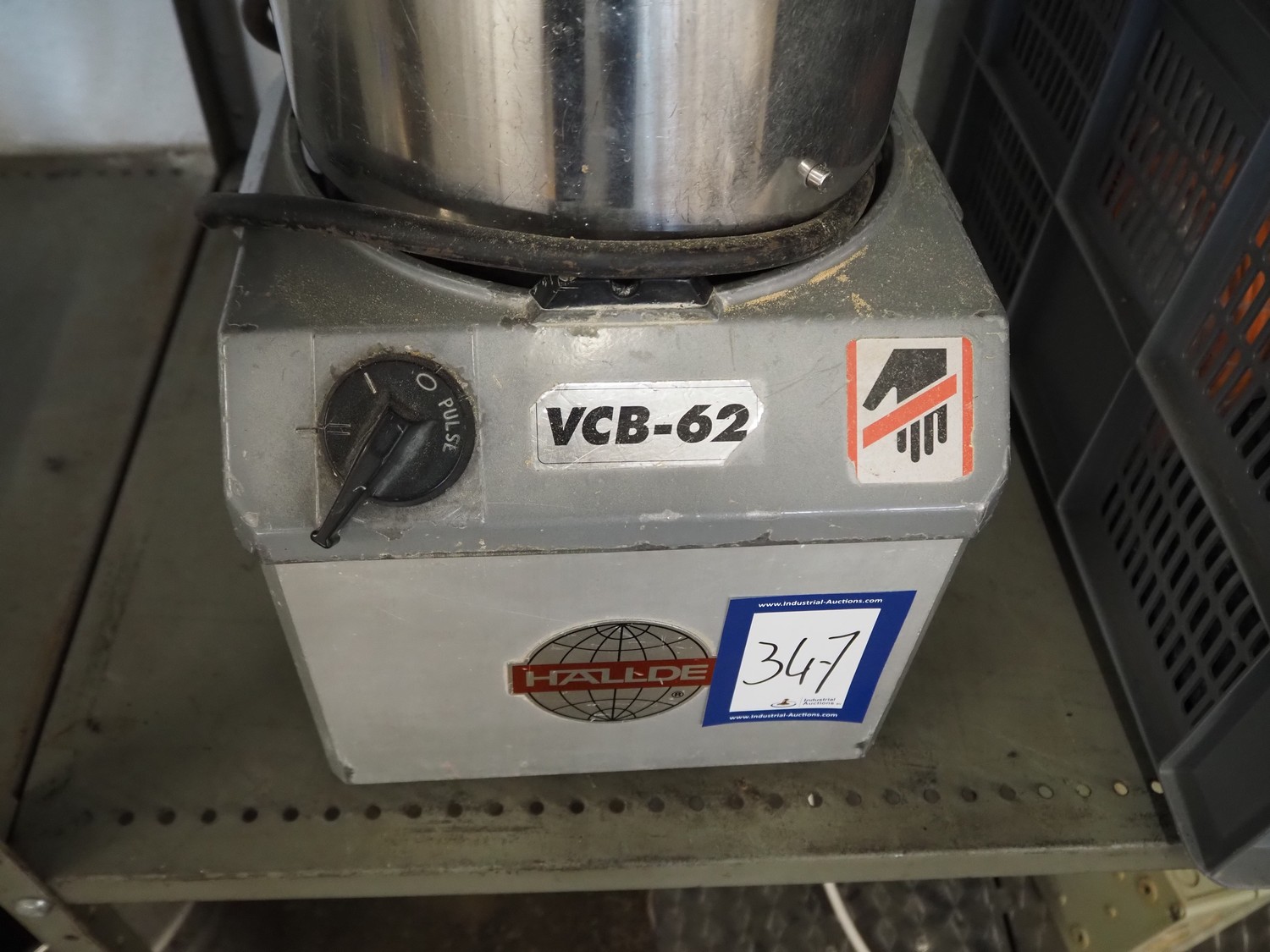 Hallde vegetable slicer, type: VCB-62, serial number: 62-1269, year of construction: 2000, 400 V, 3 Ph, 50 Hz, 3.5 A, 1.5/0.9 kW, dimensions: 300 mm x 300 mm x 450 mm.