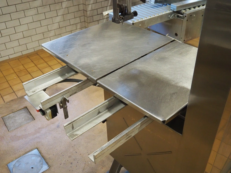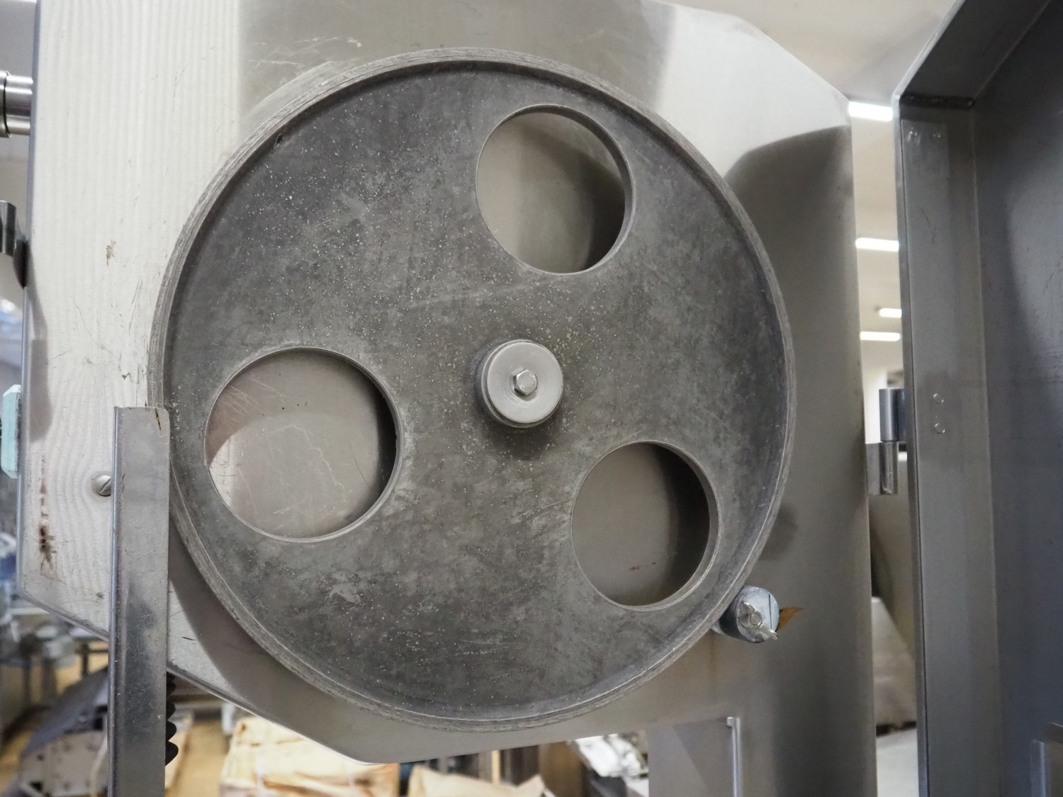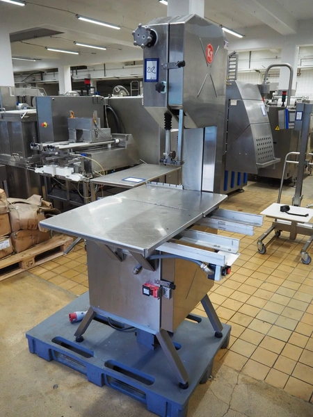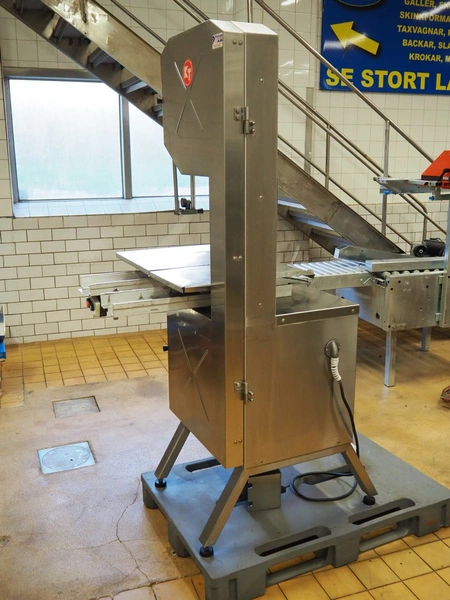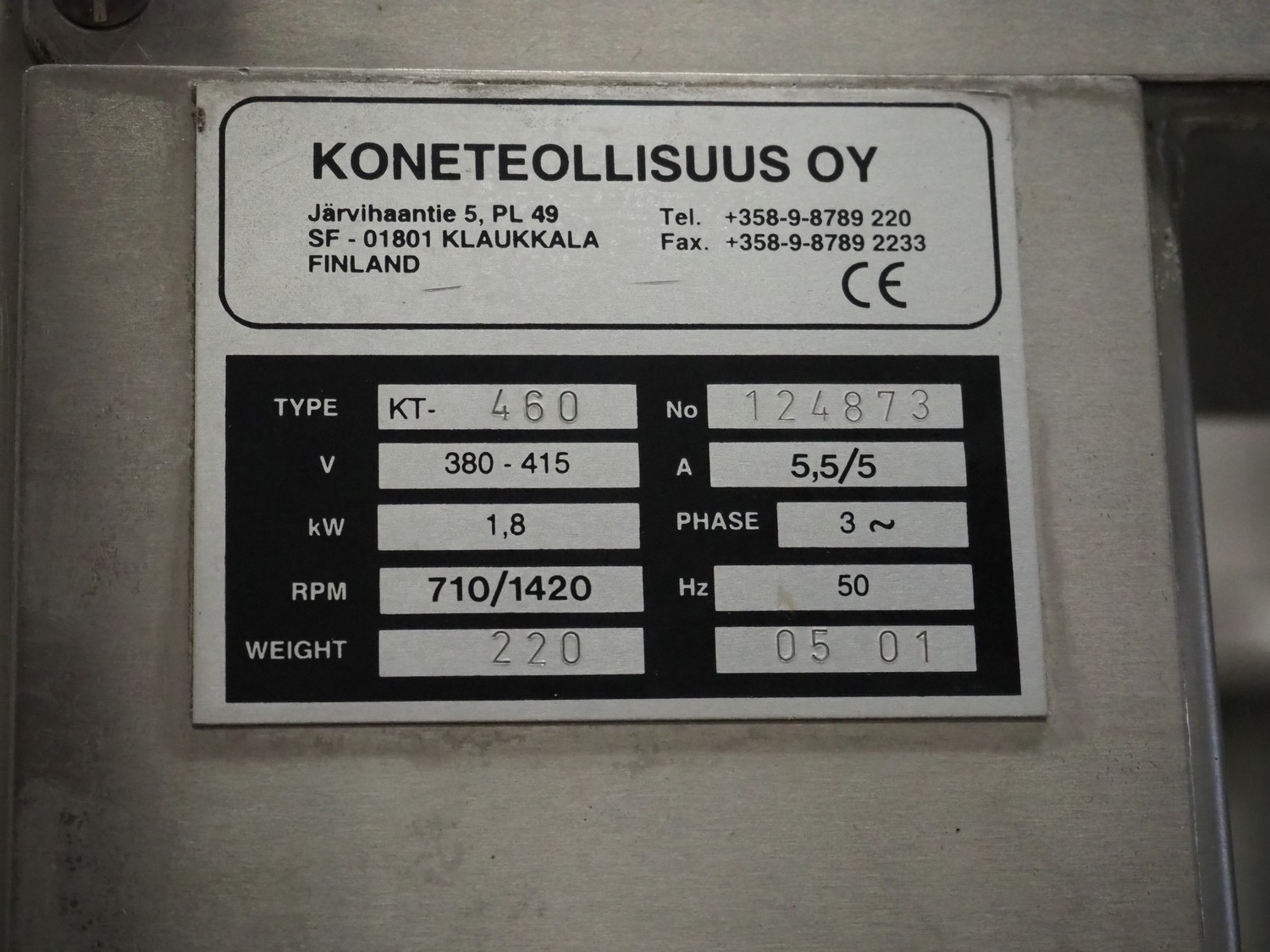 Koneteollisuus Oy bandsaw, type: KT-460, number: 124873, year of construction: 05/2001, 380-415 V, 3 Ph, 50 Hz, 5/5/5 A, 1.8 kW, 710/1420 RPM, weight: 220 kg, dimensions: 1000 mm x 900 mm x 1900 mm. Missing saw blade.