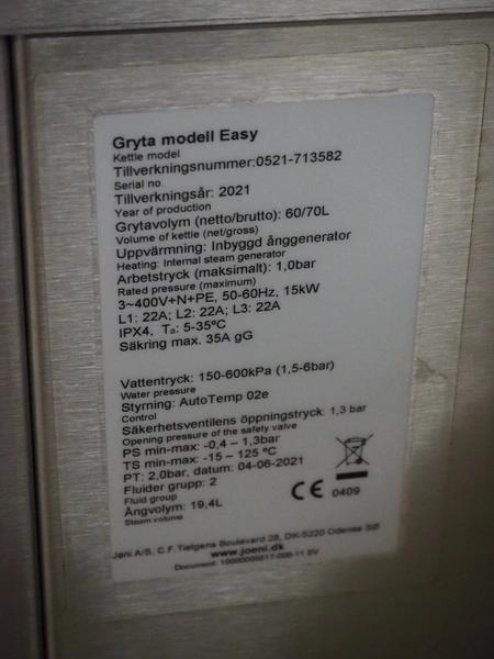 Joni cooking kettle, model: Easy, serial number: 0521-713582, year of construction: 2021, volume: 60/70 liter, 400 V, 3 Ph, 50-60 Hz, 22 A, 15 kW, dimensions: 1100 mm x 900 mm x 1100 mm.