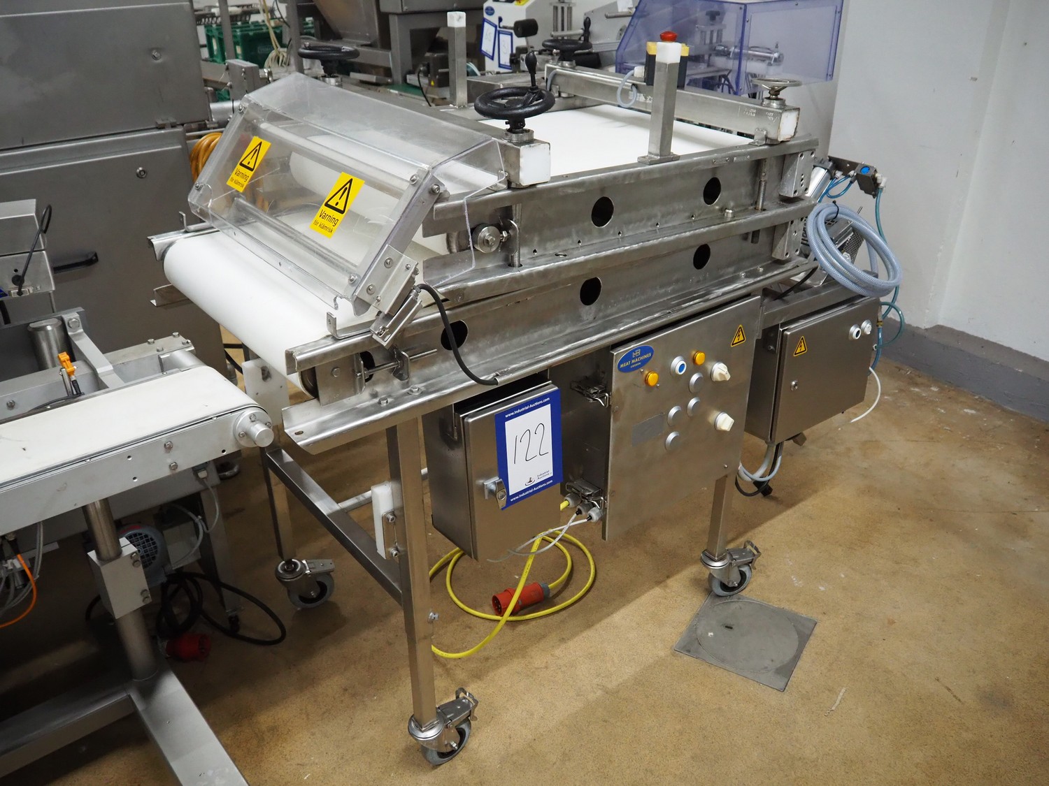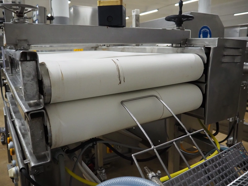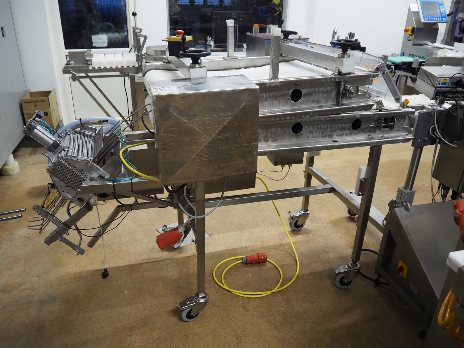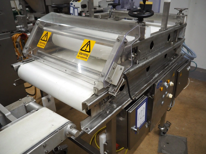 Mobile flattener, plastic belt, belt width: 570 mm, total dimensions: 1900 mm x 920 mm x 1450 mm.