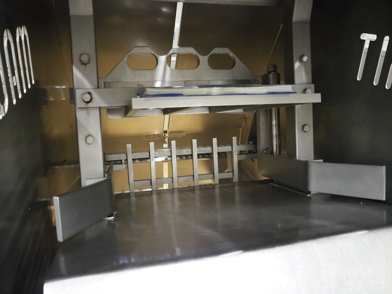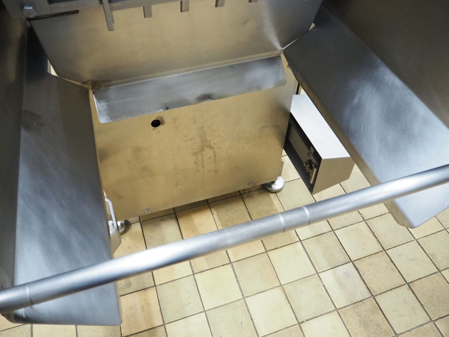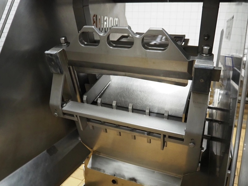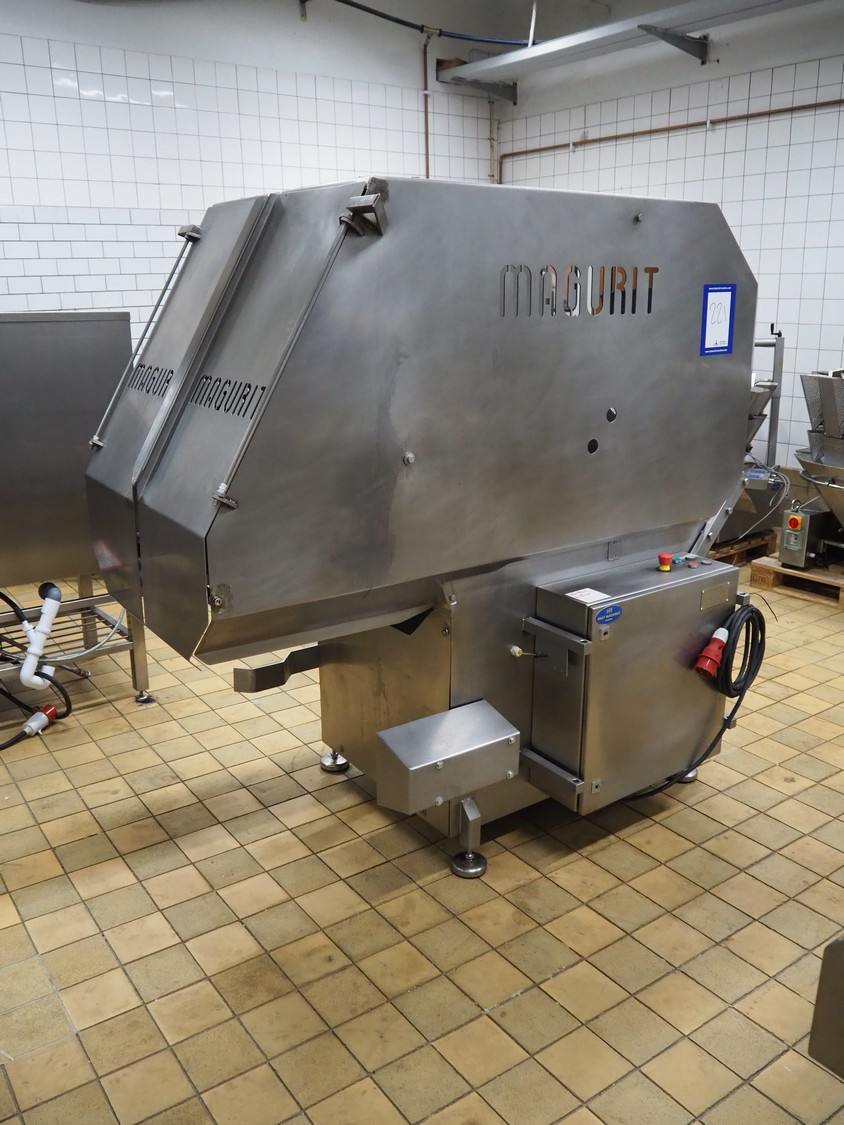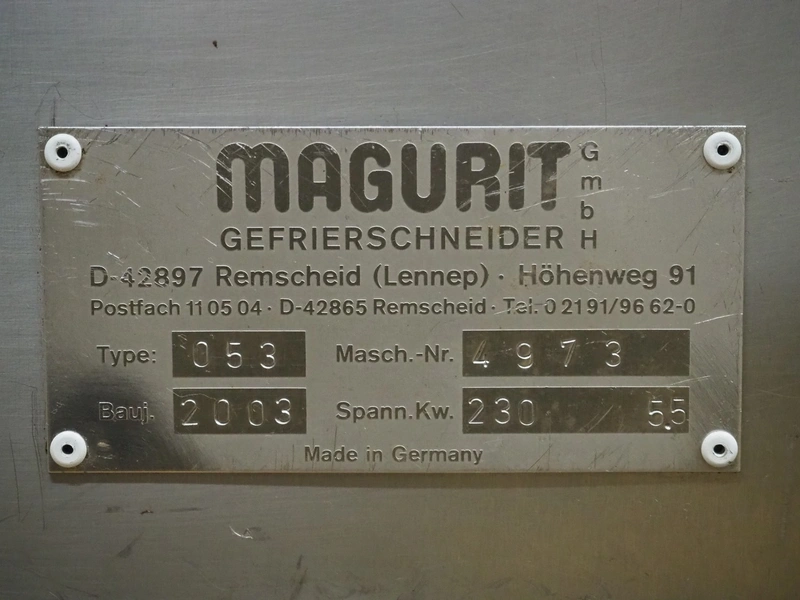 Magurit frozen block cutter, type: 053, machine number: 4973, year of construction: 2003, 230 V, 5.5 kW, maximum block size: 500 mm x 600 mm x 240 mm, total dimensions: 1850 mm x 1100 mm x 1750 mm.