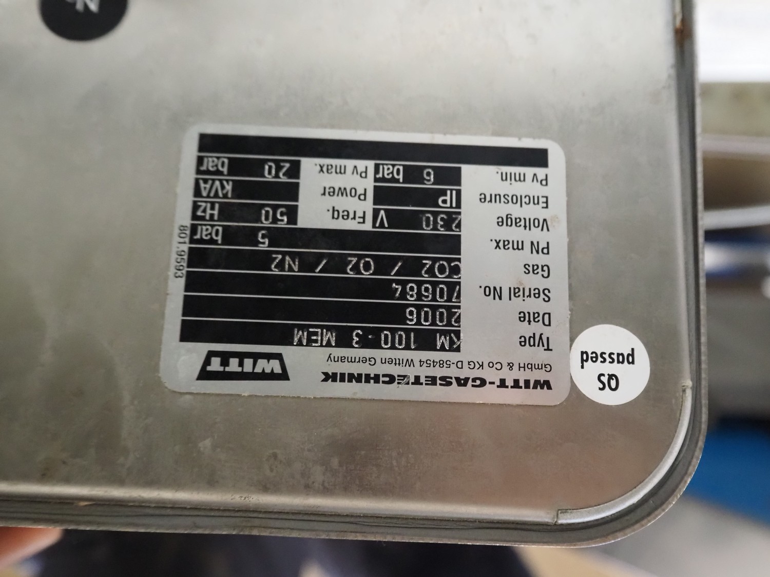 Witt-Gastechnik gass mixing station, type: KM 100-3 MEM, serial number: 70684, year of construction, 2006, 230 V, 50 Hz, dimensions: 350 mm x 320 mm x 200 mm.