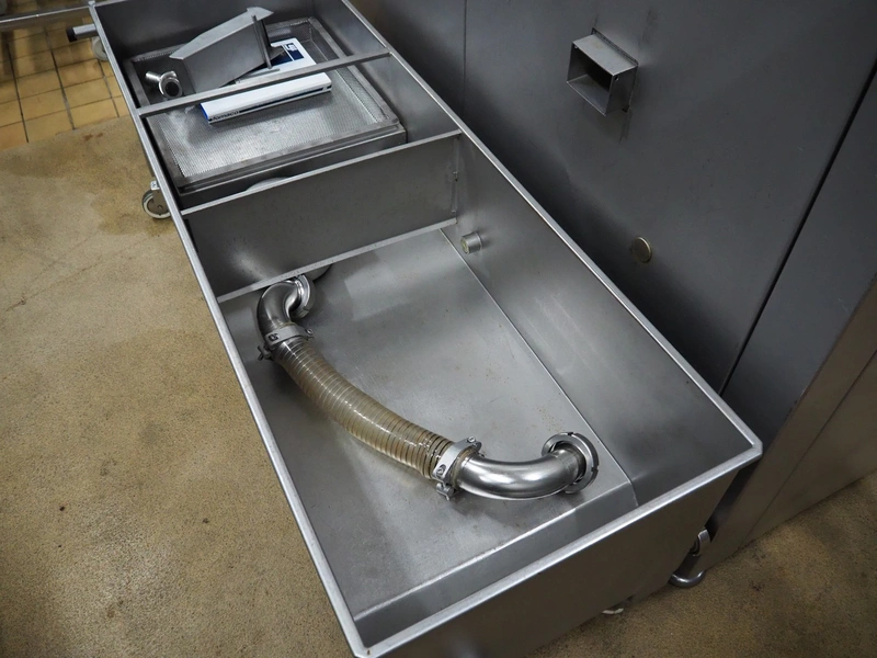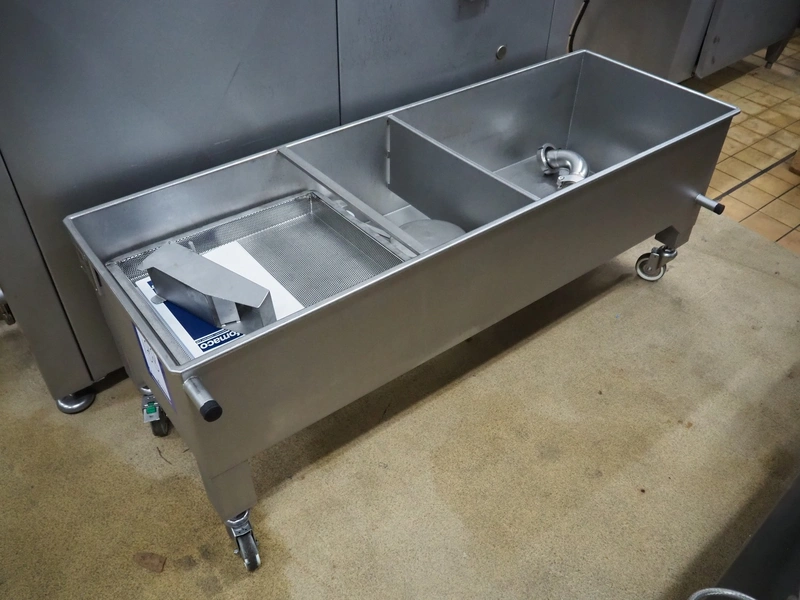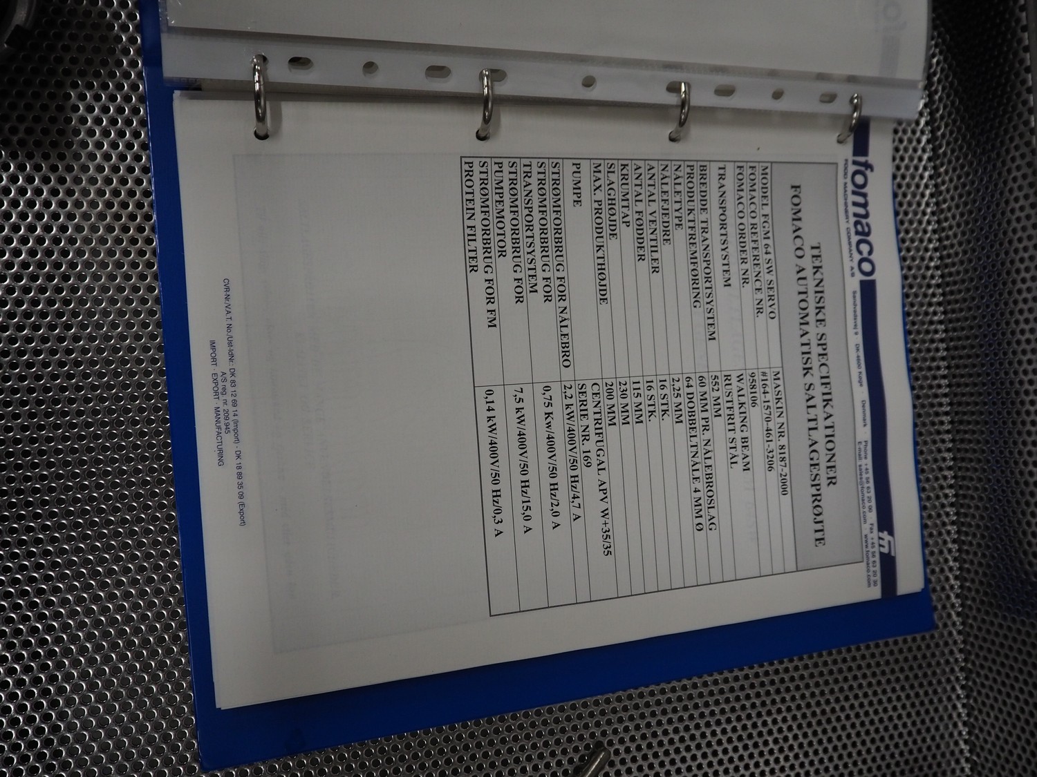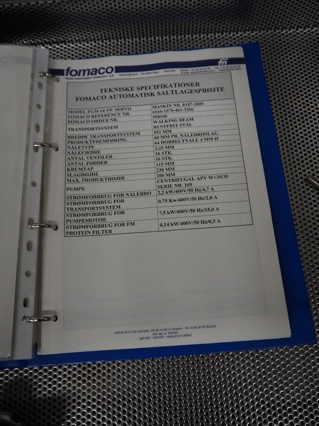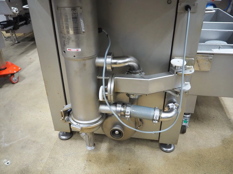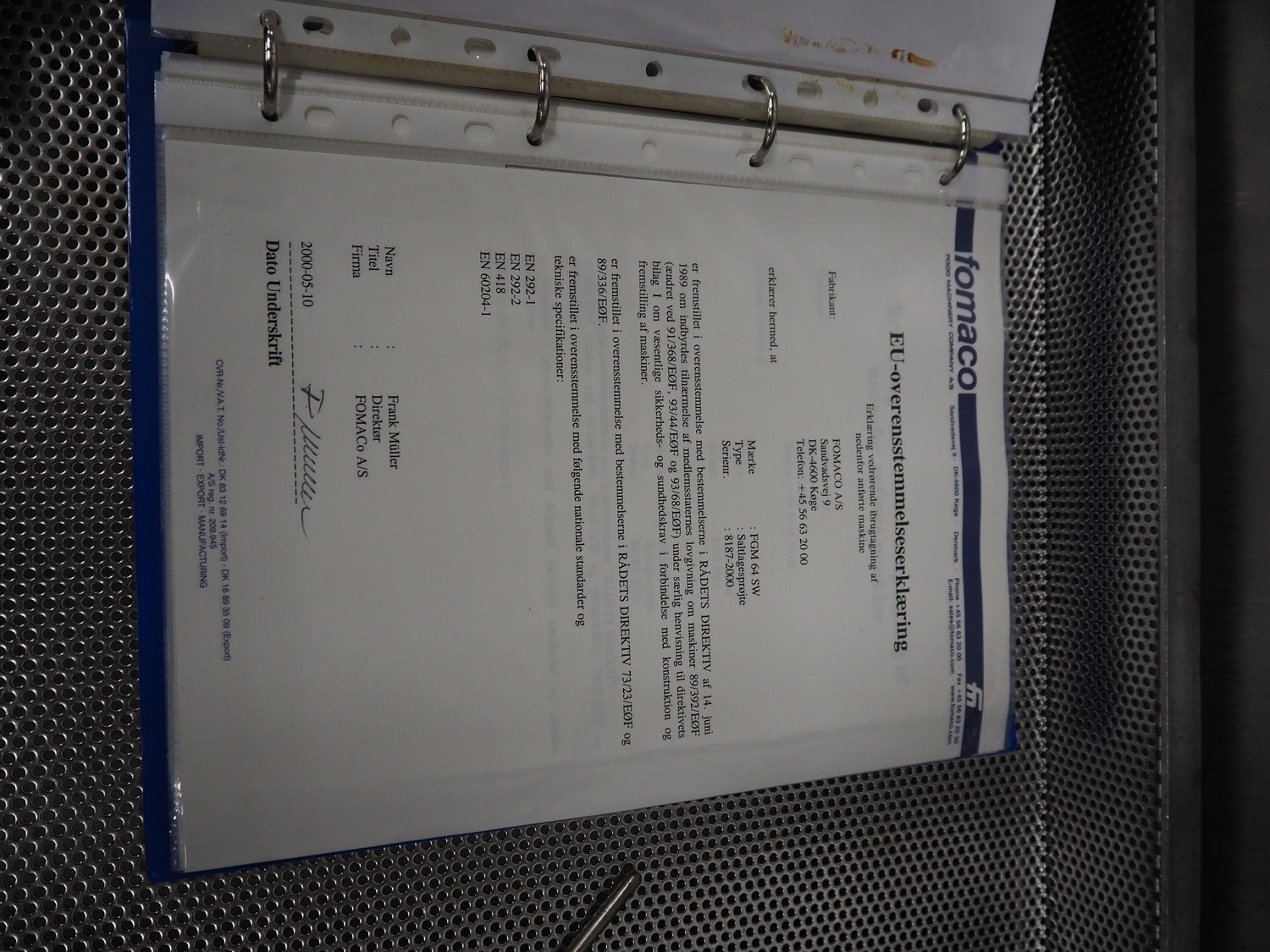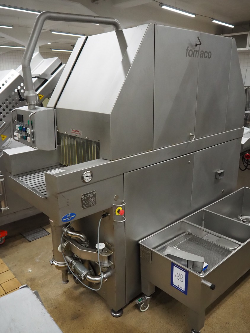 Fomaco injector, model: FGM 64 SW, machine number: 8187, year of construction: 2000, 400 V, 3 Ph, 50 Hz, 23/32 A, s/s walking beam, beam width: 550 mm, working width: 530 mm, total dimensions: 2250 mm x 840 mm x 2200 mm. Including mobile filter tub, type: PFS 5/225 08, machine number: 8189 2000, dimensions: 1700 mm x 650 mm x 630 mm.