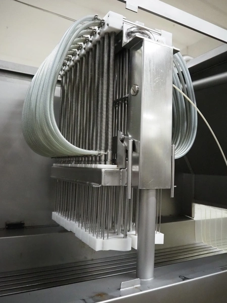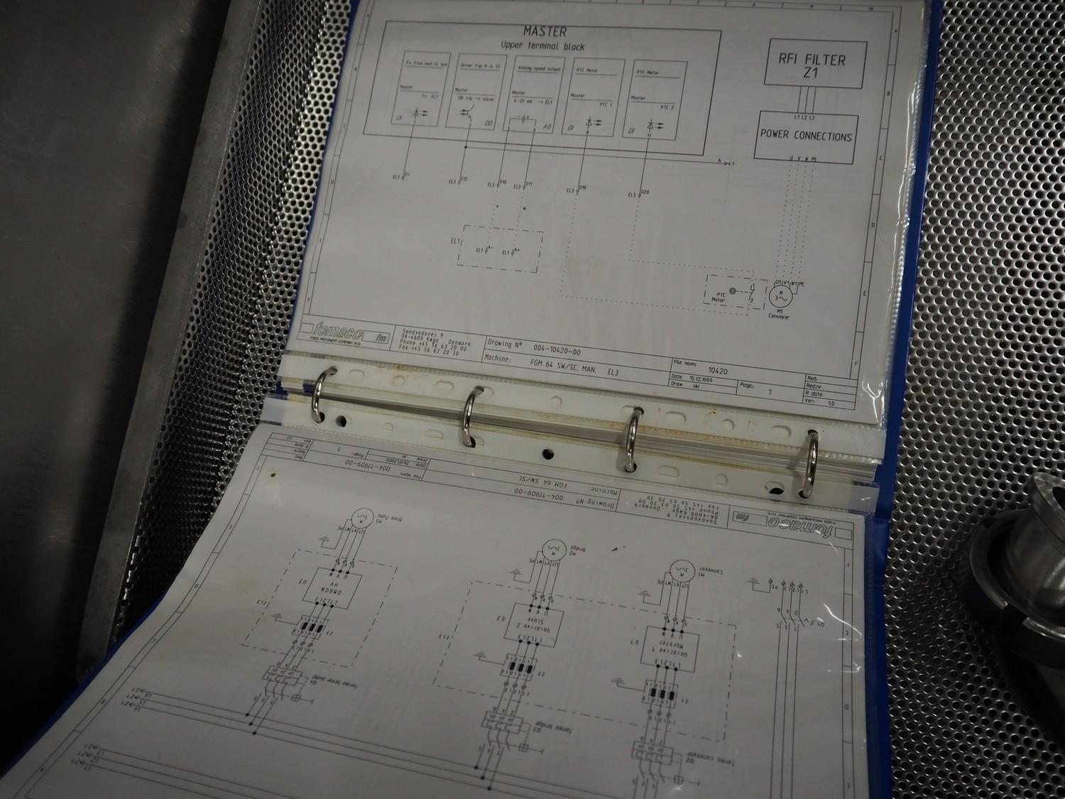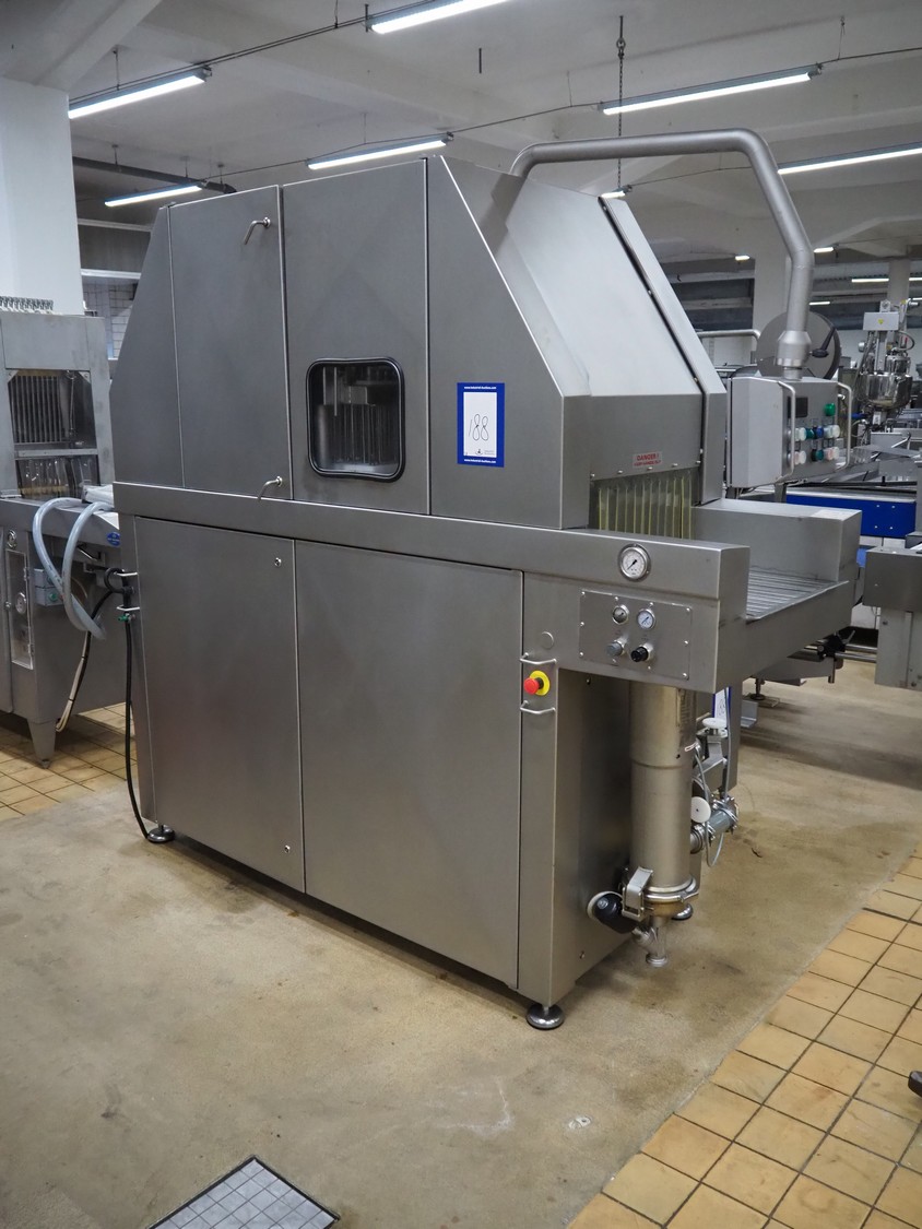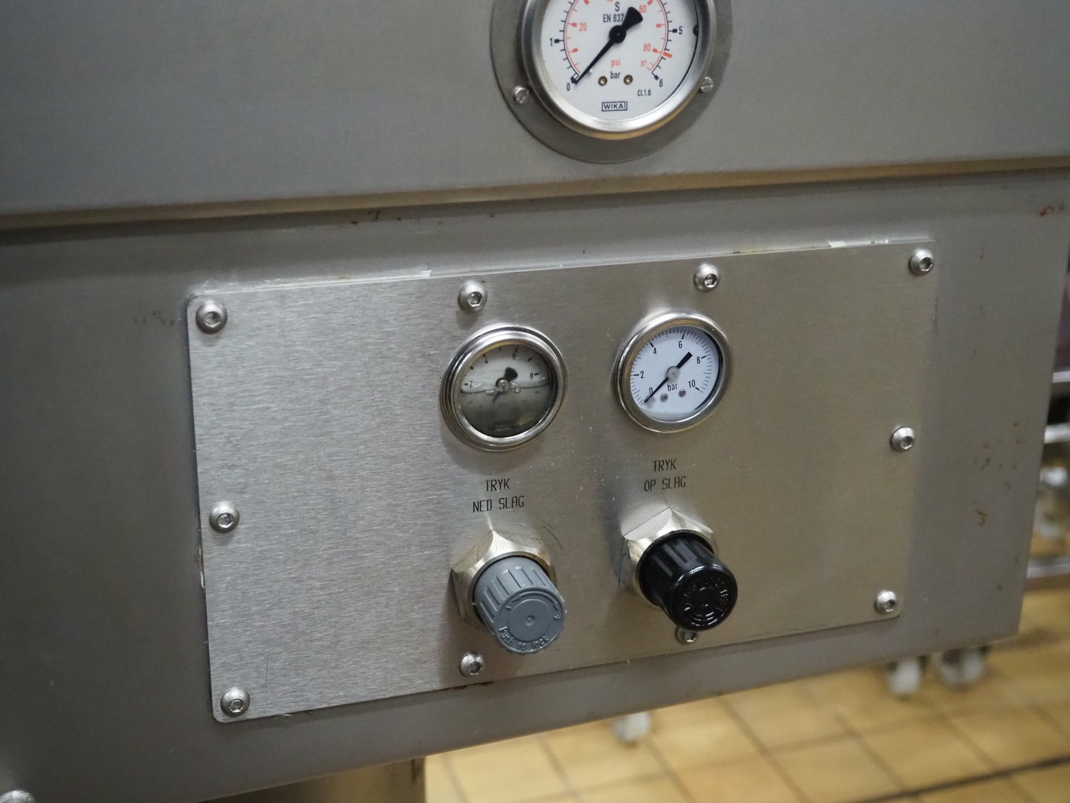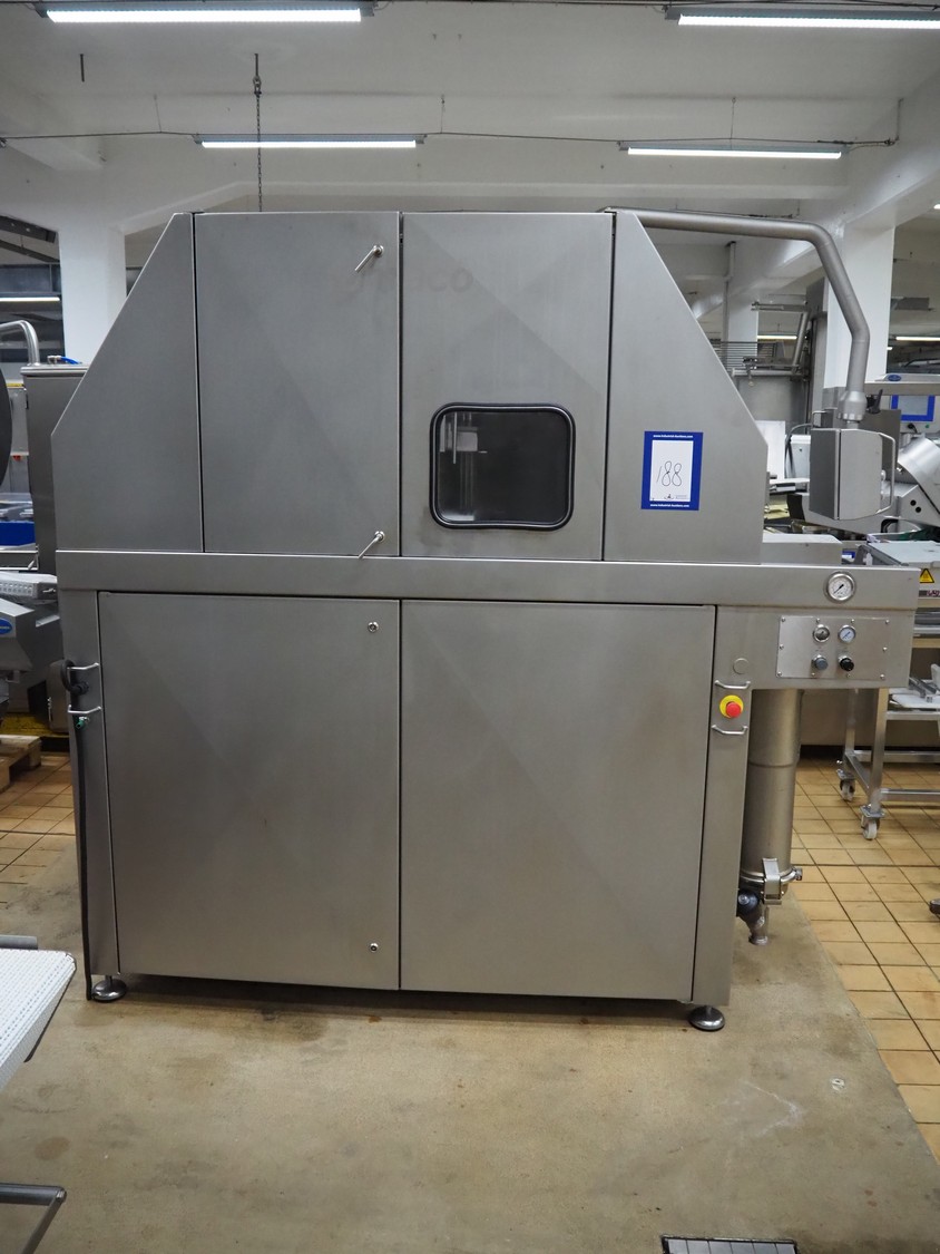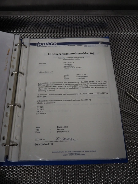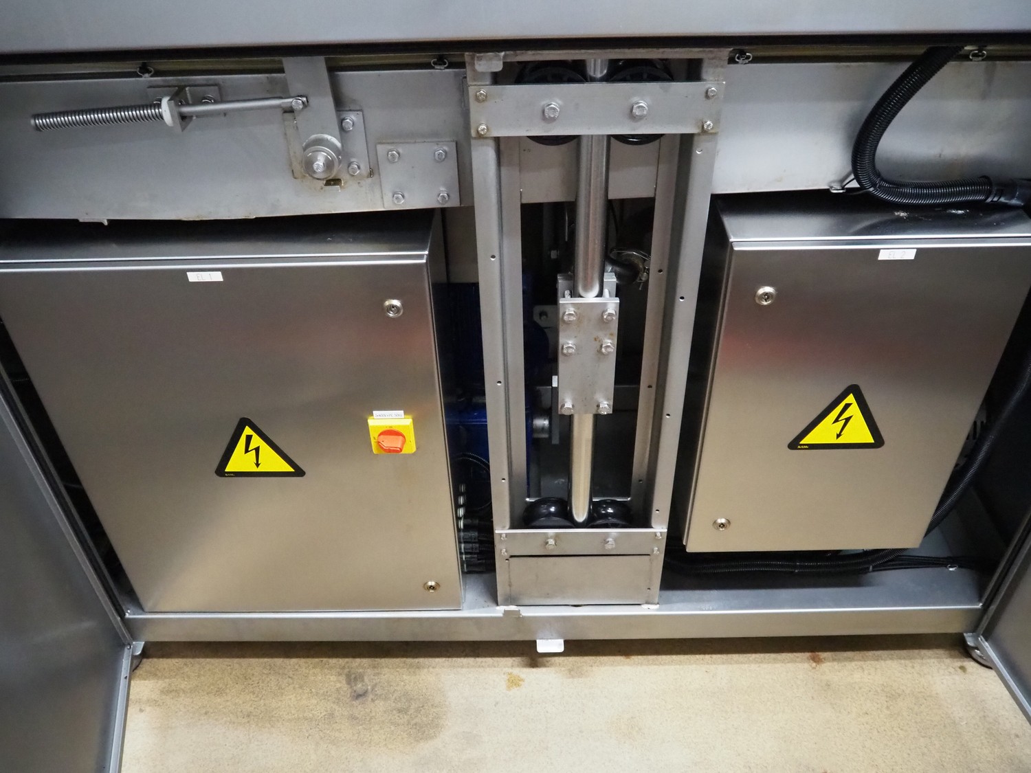 Fomaco injector, model: FGM 64 SW, machine number: 8187, year of construction: 2000, 400 V, 3 Ph, 50 Hz, 23/32 A, s/s walking beam, beam width: 550 mm, working width: 530 mm, total dimensions: 2250 mm x 840 mm x 2200 mm. Including mobile filter tub, type: PFS 5/225 08, machine number: 8189 2000, dimensions: 1700 mm x 650 mm x 630 mm.