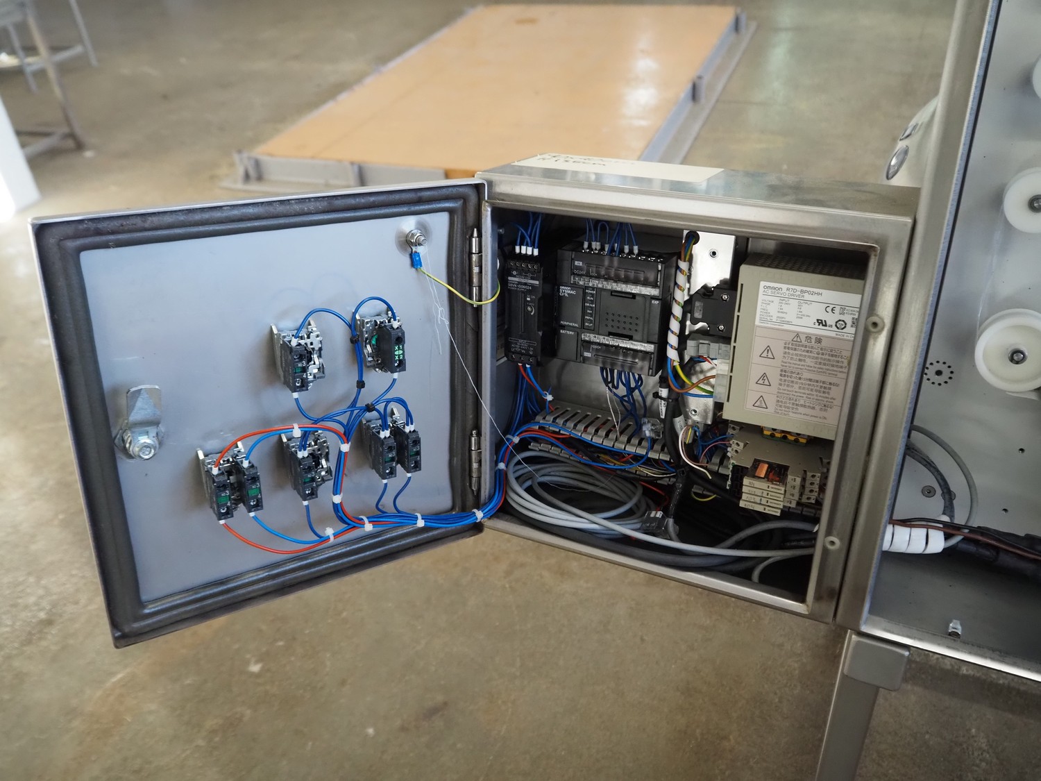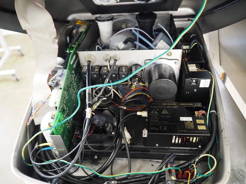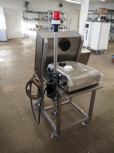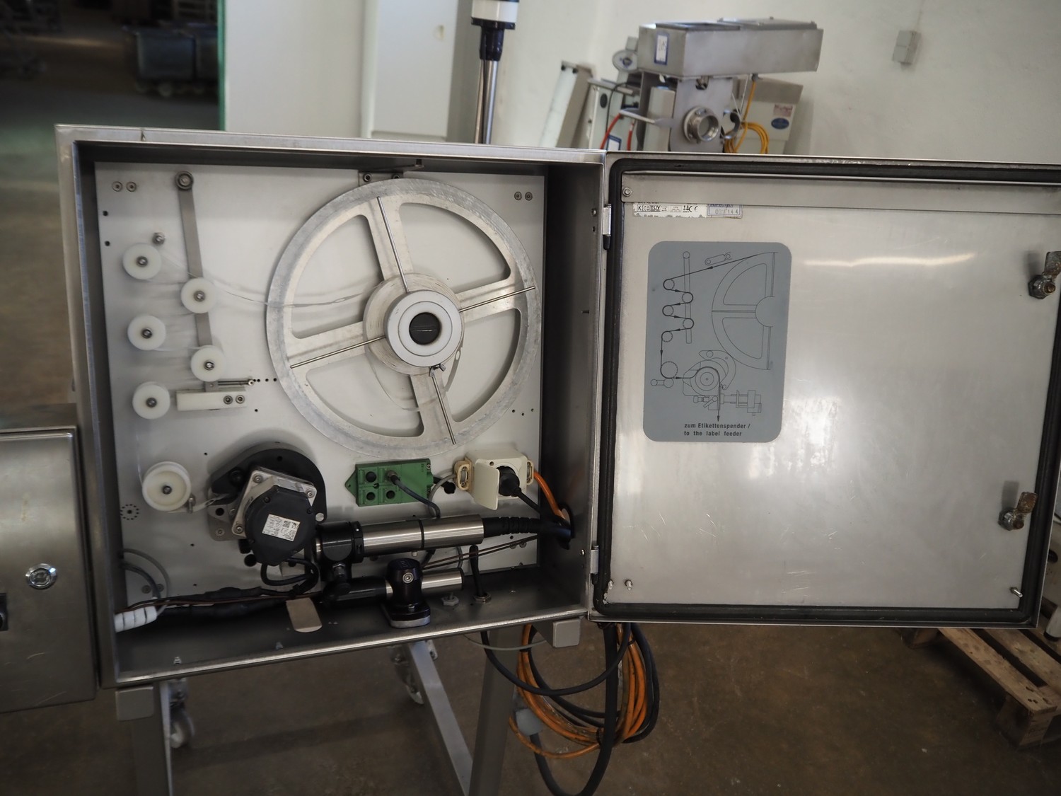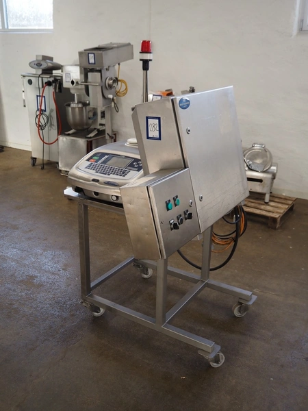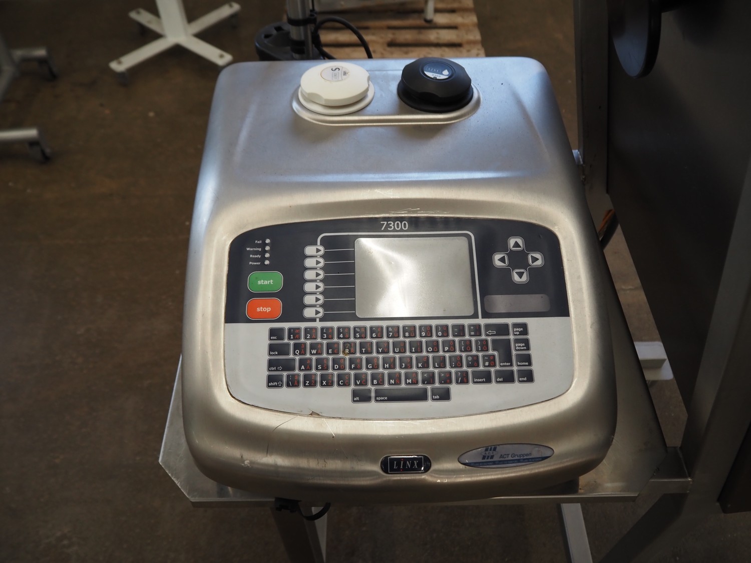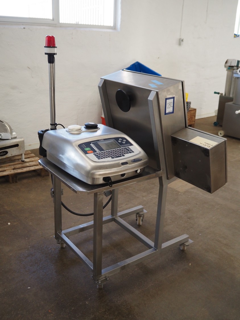Linx mobile inkjet printer on s/s trolley, model inkjet printer: 7300 mm with label dispenser, dimensions: 870 mm x 900 mm x 1550 mm.