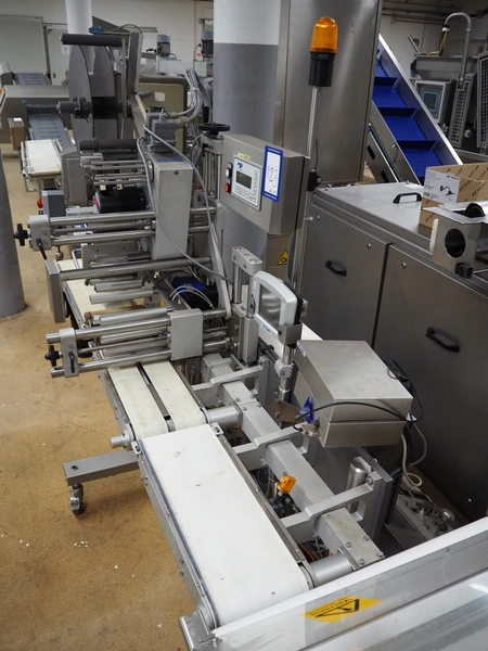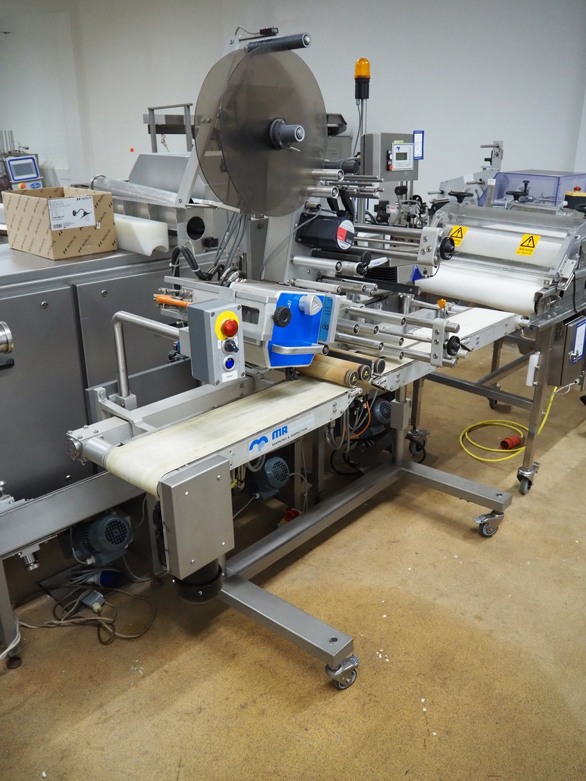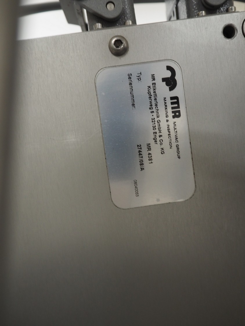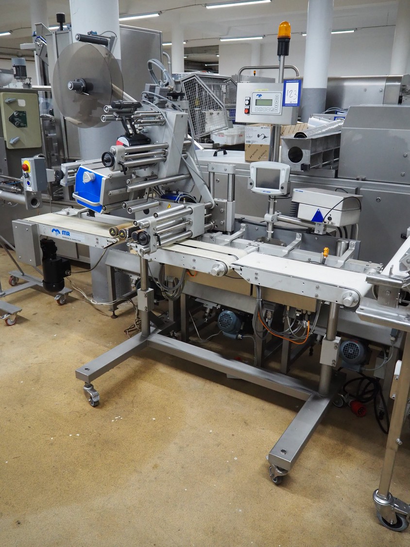 MR Etikettiertechnik GmbH & Co. KG. mobile labelling machine, type: MR 4333, serial number: 27447/08/A, 230 V, 50 Hz, 2500 VA, plastic belt, belt width: 190 mm, (2x) 85 mm, total dimensions: 1900 mm x 850 mm x 1900 mm.
