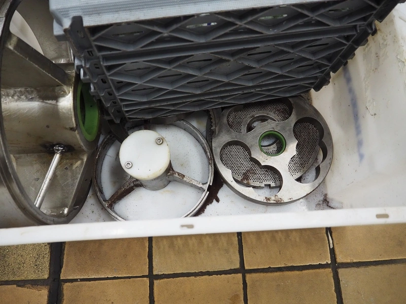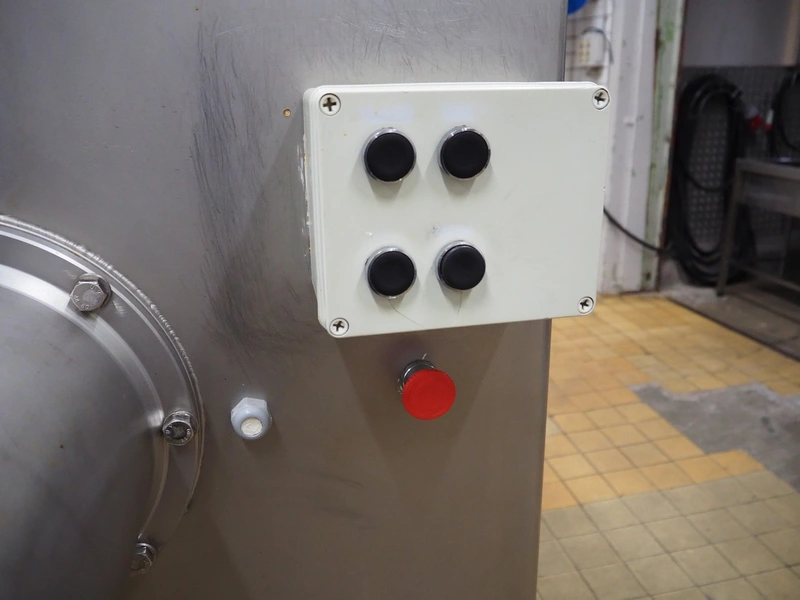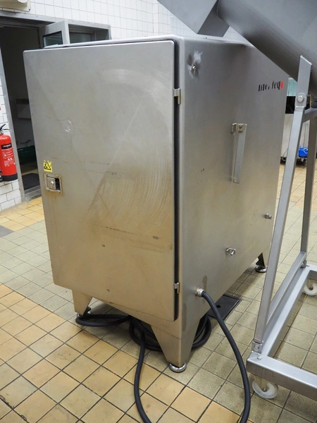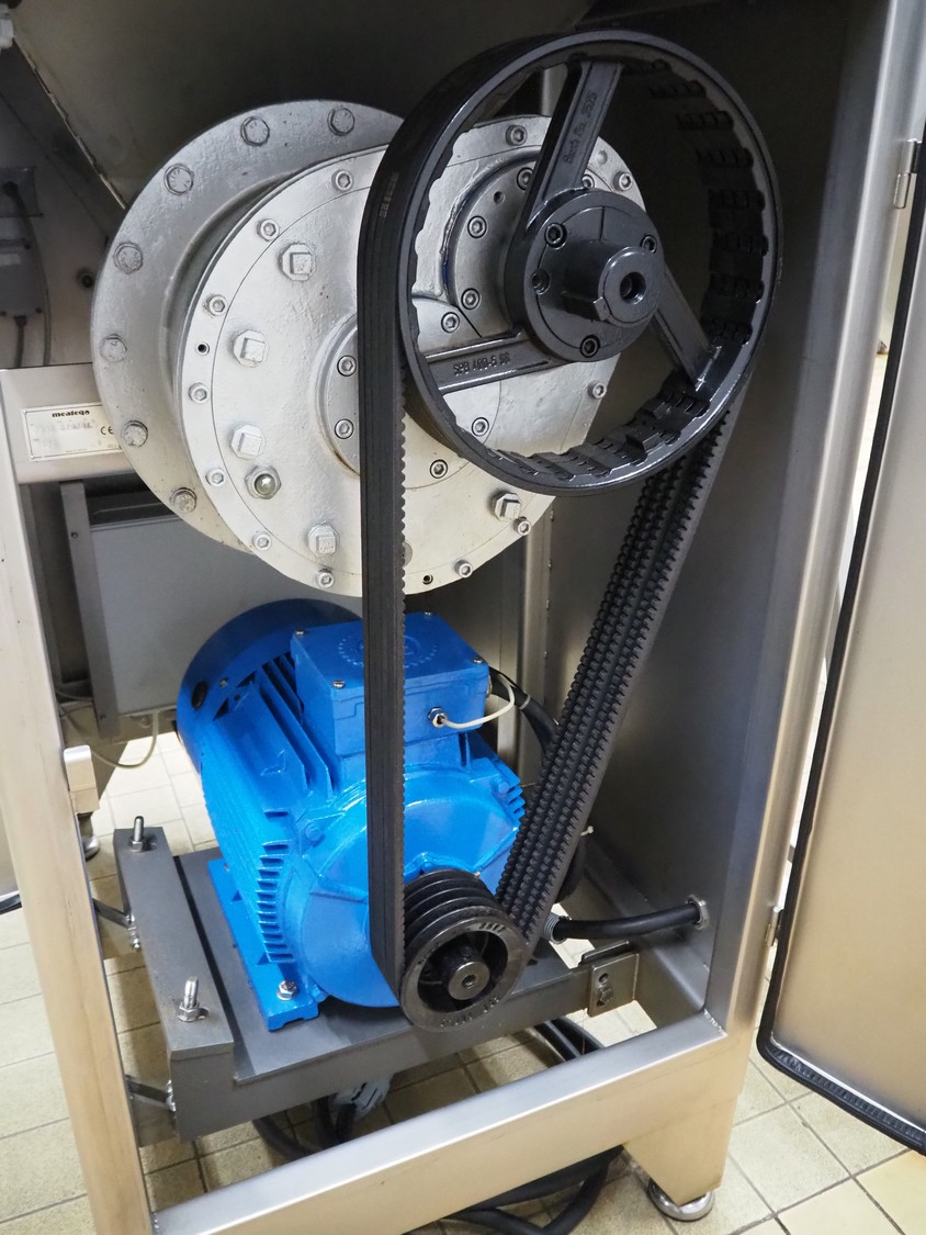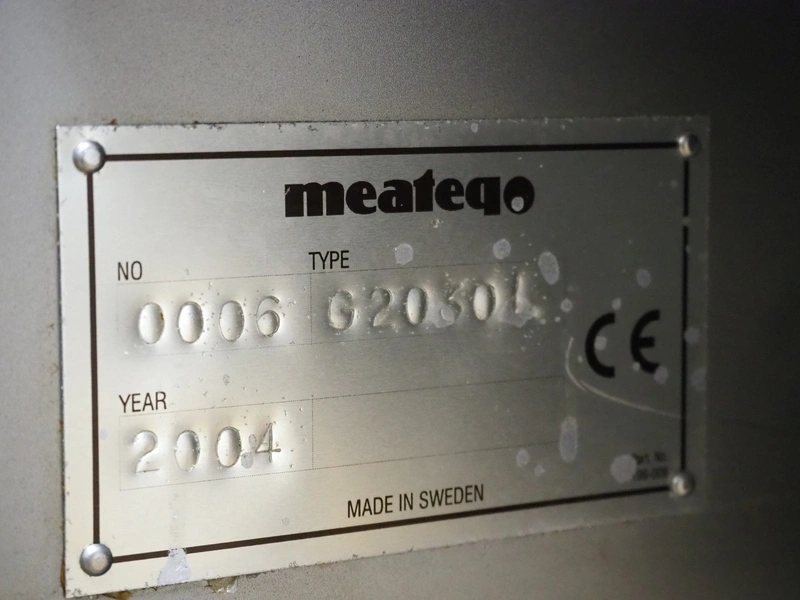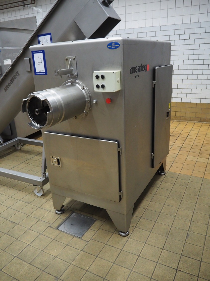 Meateq grinder, type: G2030 L, number: 0006, year of construction: 2004, plate diameter: 210 mm, total dimensions: 1800 mm x 900 mm x 1720 mm. Including knifes and plates.