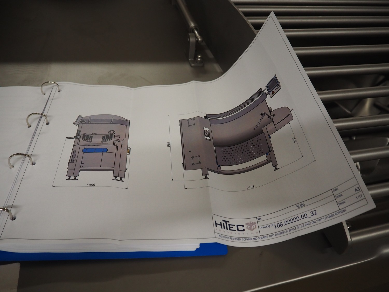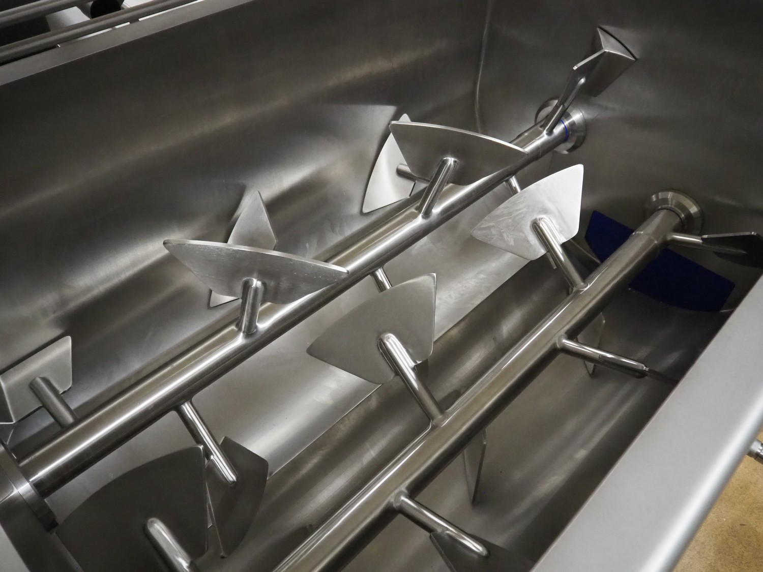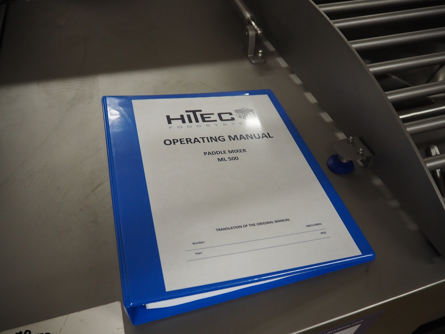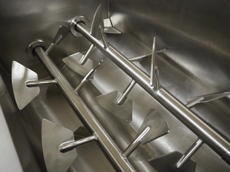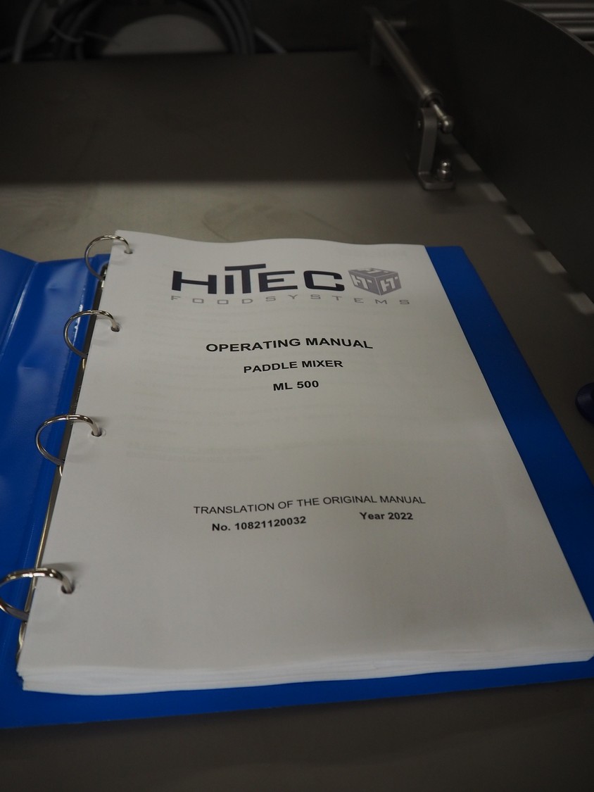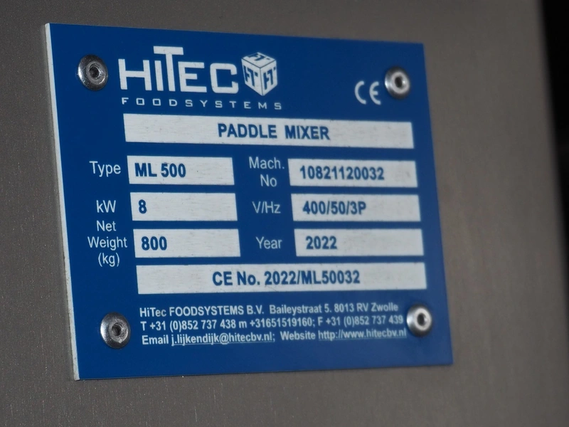 Ekomex / Hitec Foodsystems double shaft paddle mixer, type: ML 500, machine number: 10821120032, year of construction: 2022, 400 V, 3 Ph, 50 Hz, 8 kW, machine weight: 800 kg, volume: 500 liter, dimensions: 2180 mm x 1070 mm x 1550 mm.