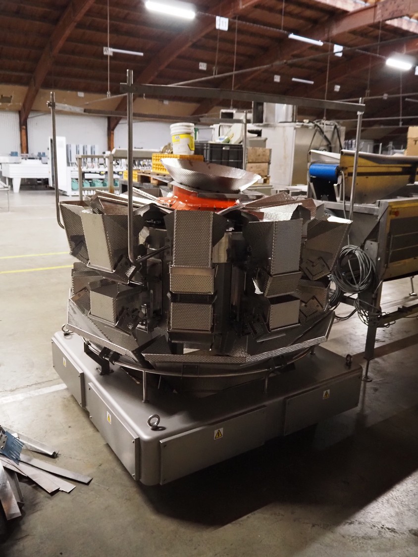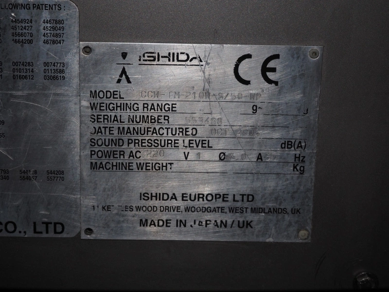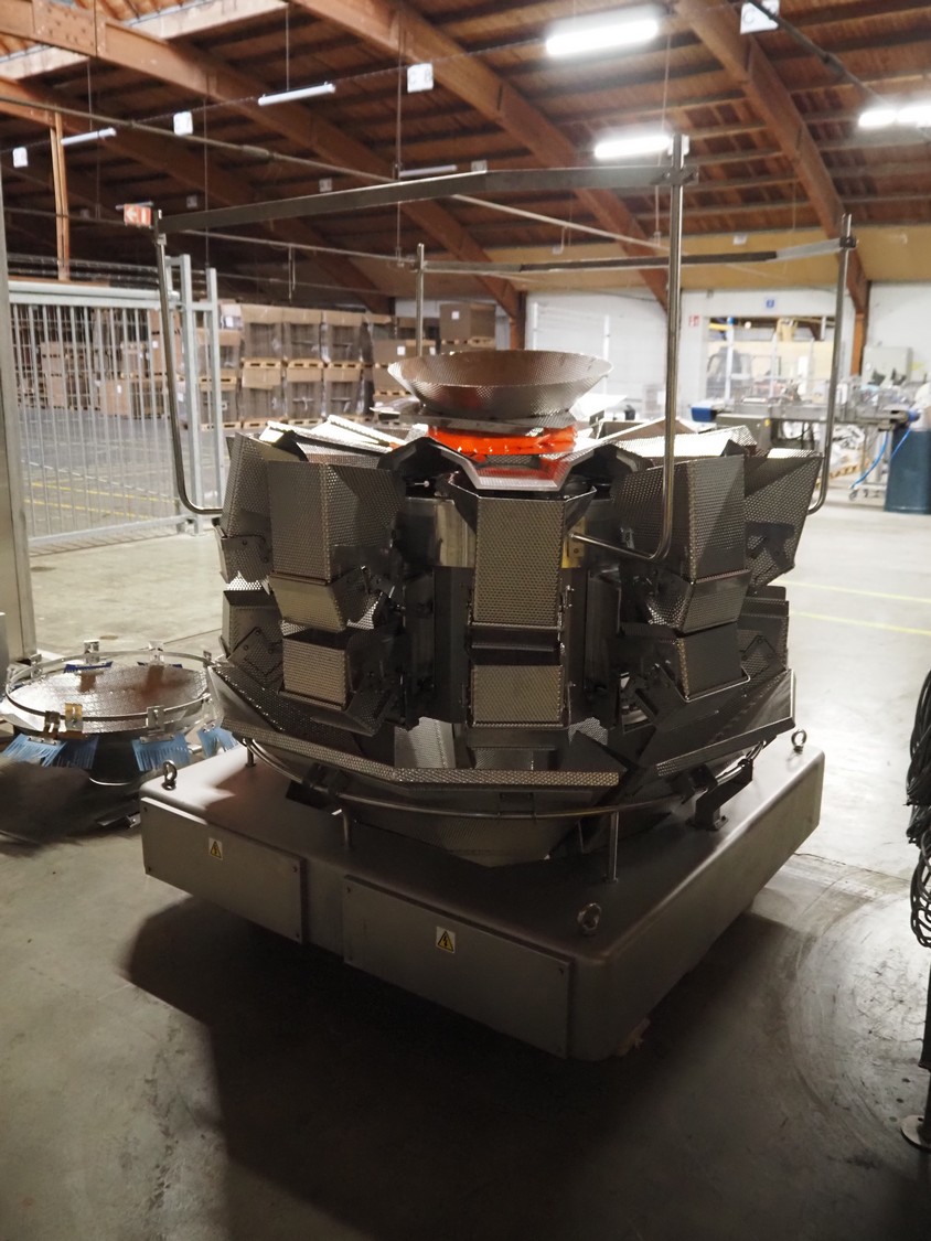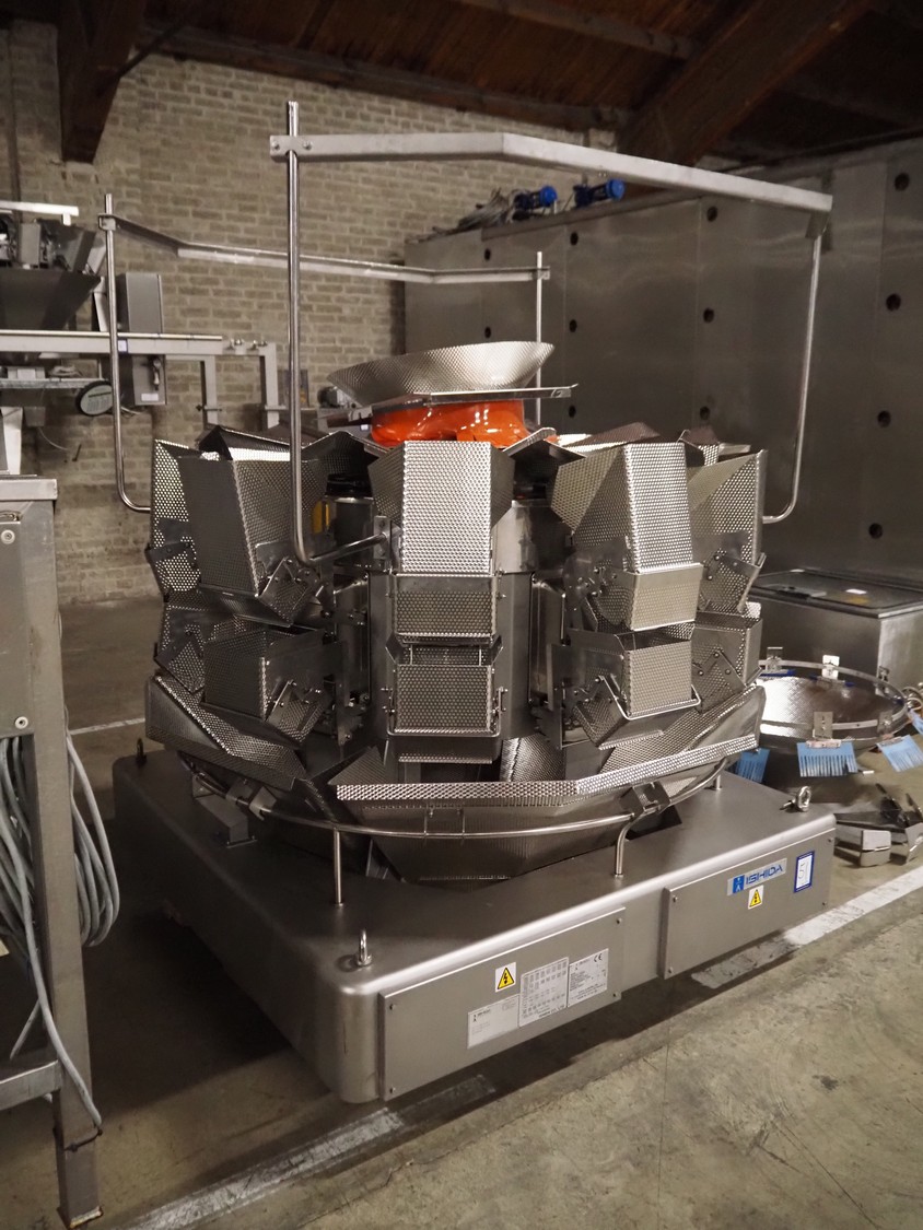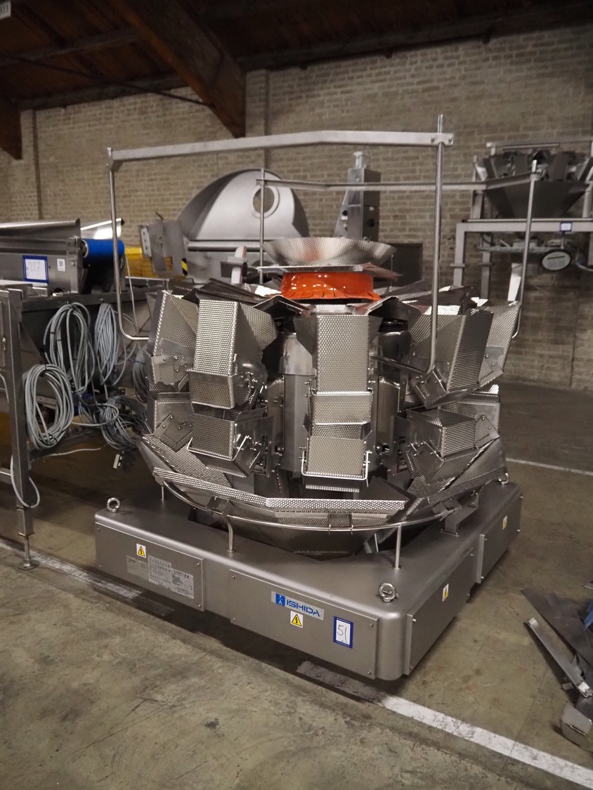 Ishida 10 heads multihead weigher, model: CCW-EM-210W-S/50-WP, serial number: 553488, year of construction: Oct 2003, 220 V, 1 Ph, 50 Hz, 7 A, dimensions: 1600 mm x 1600 mm x 1950 mm.