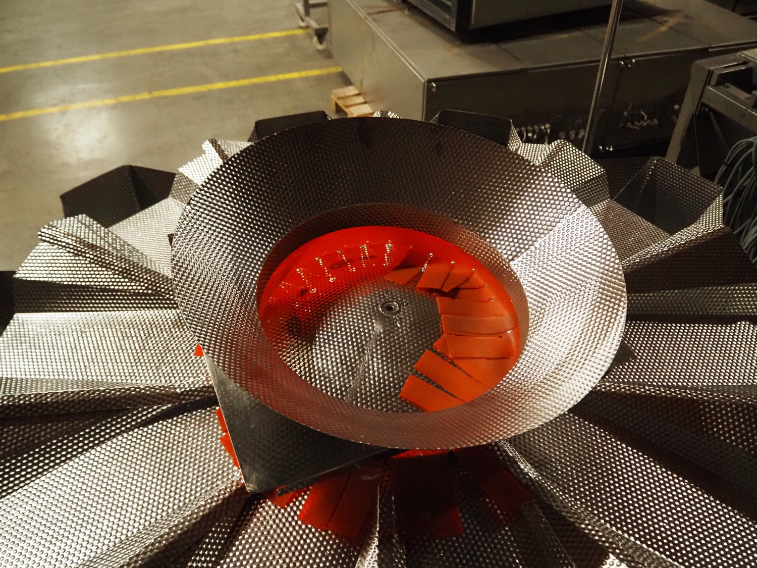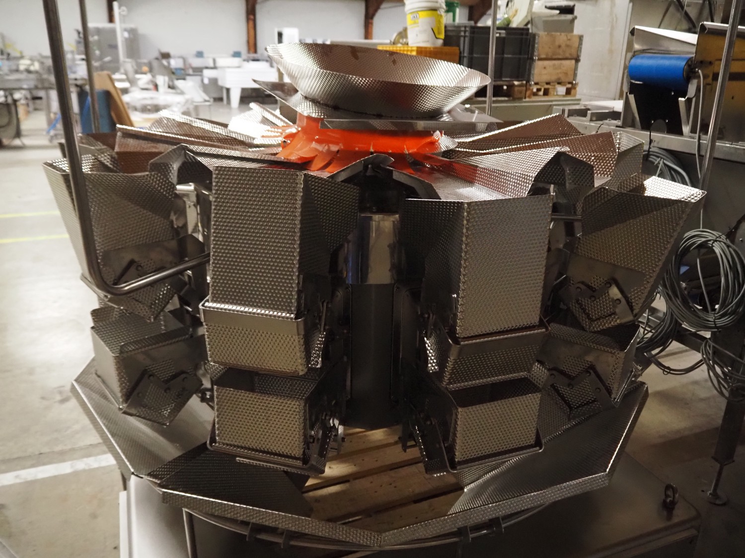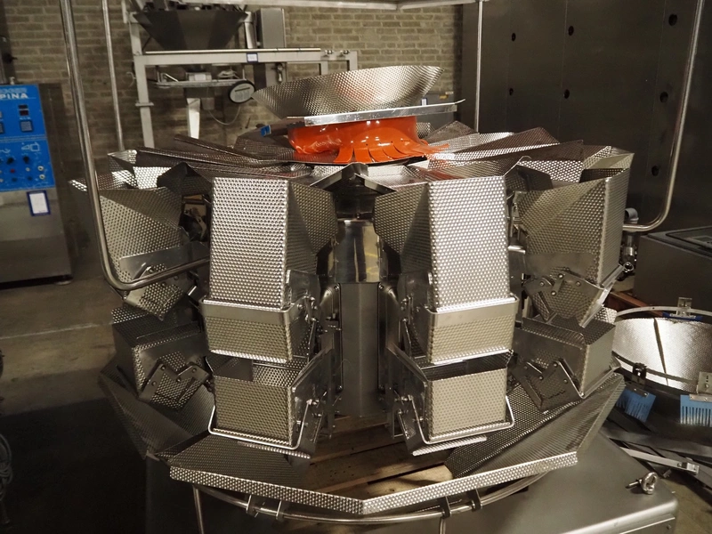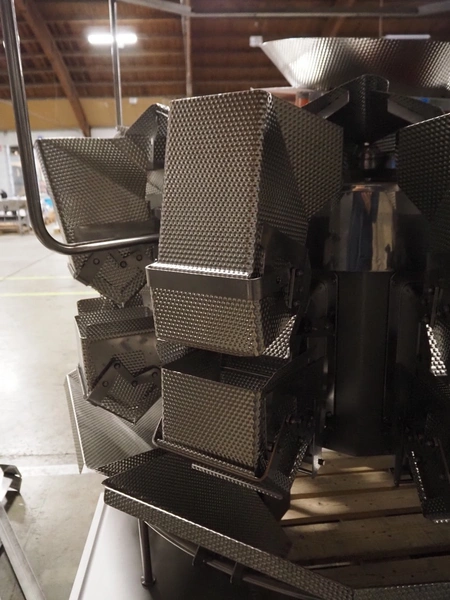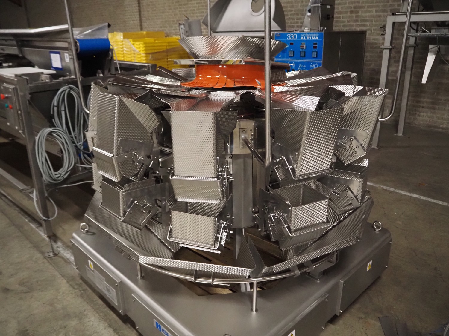 Ishida 10 heads multihead weigher, model: CCW-EM-210W-S/50-WP, serial number: 553488, year of construction: Oct 2003, 220 V, 1 Ph, 50 Hz, 7 A, dimensions: 1600 mm x 1600 mm x 1950 mm.