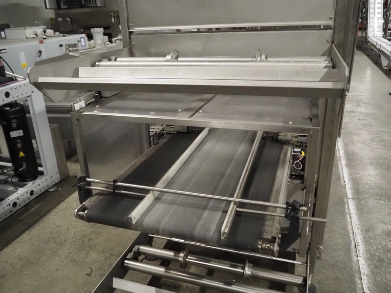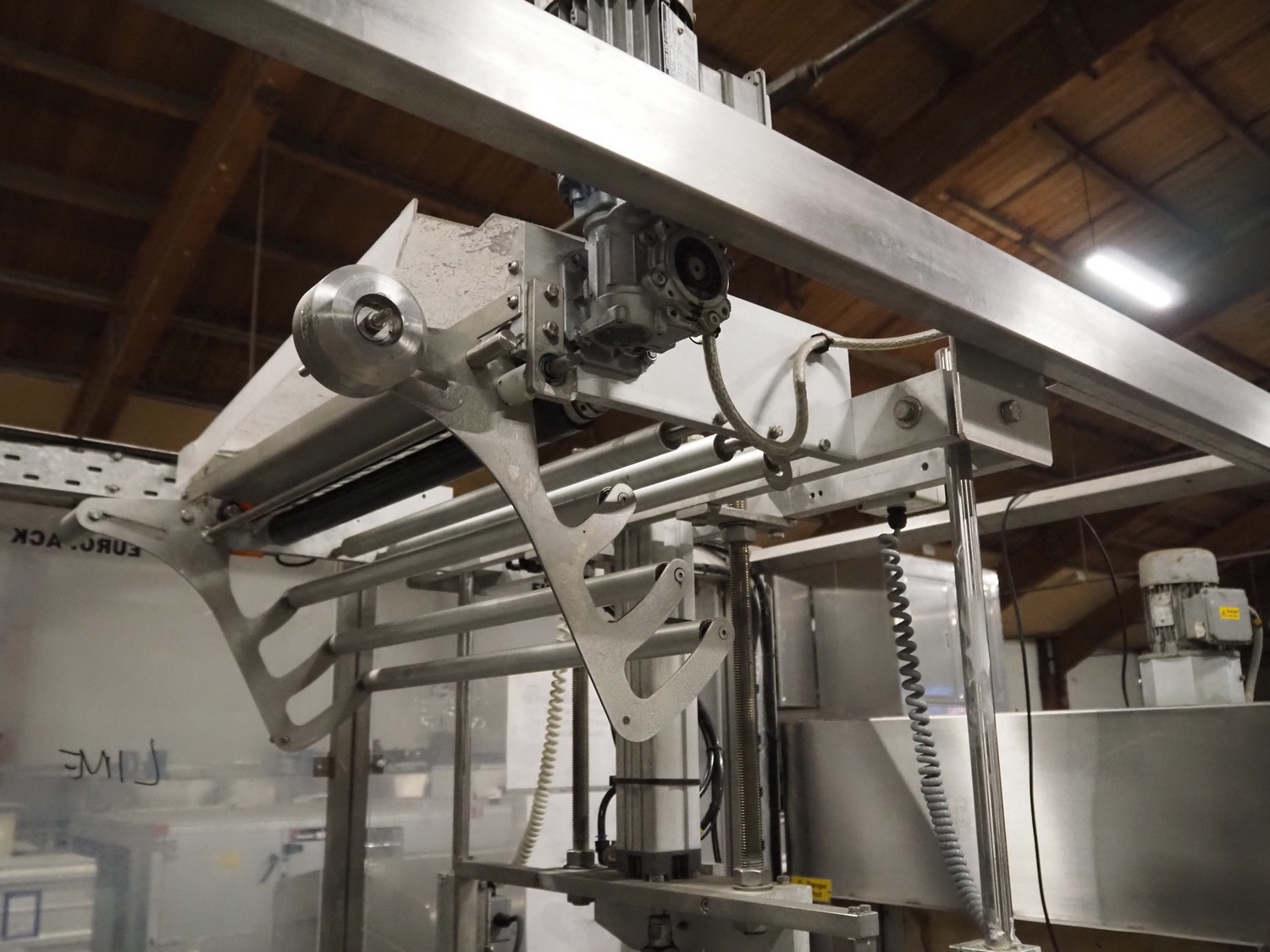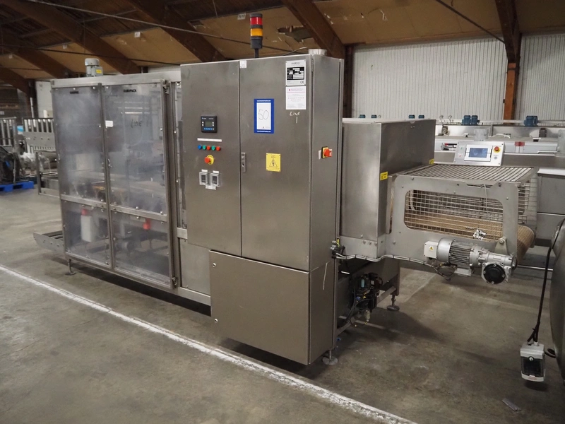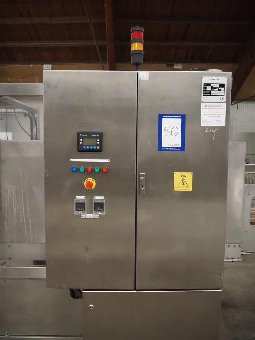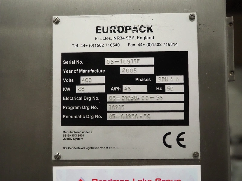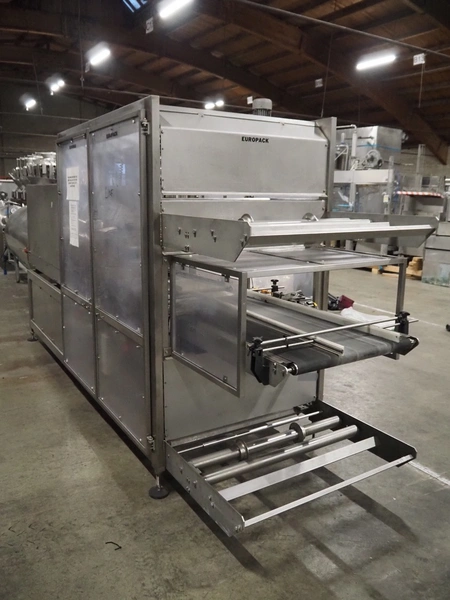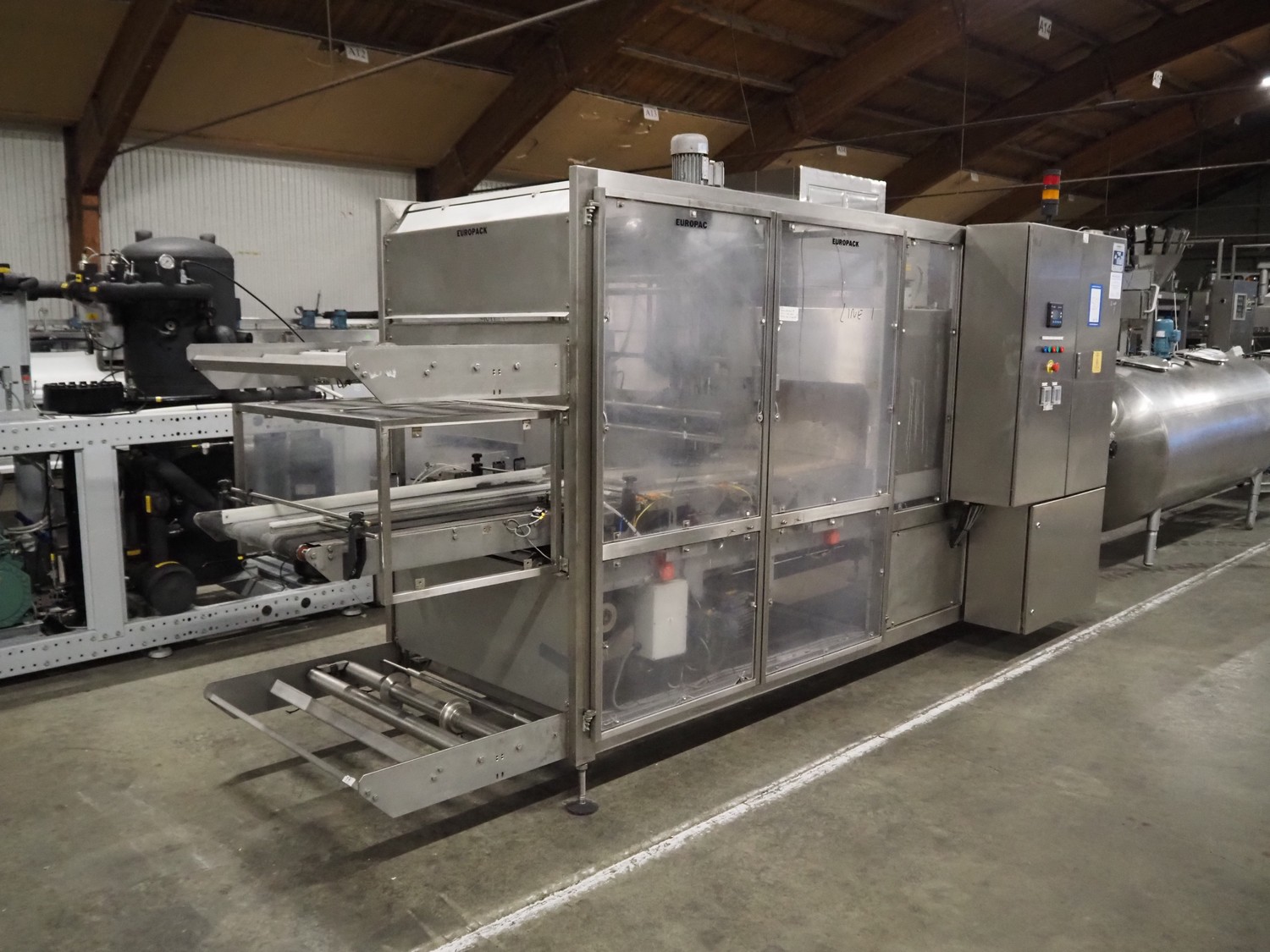 Europack wrapping and shrinking line, serial number: 05-10915E, year of construction: 2005, 400 V, 3 Ph, 50 Hz, 45 A, 28 kW, plastic belt, belt width: 650 mm, seal length: 700 mm, clearance: 720 mm x 370 mm, cloth belt, belt width: 610 mm, total dimensions: 5000 mm x 1300 mm x 1950 mm.