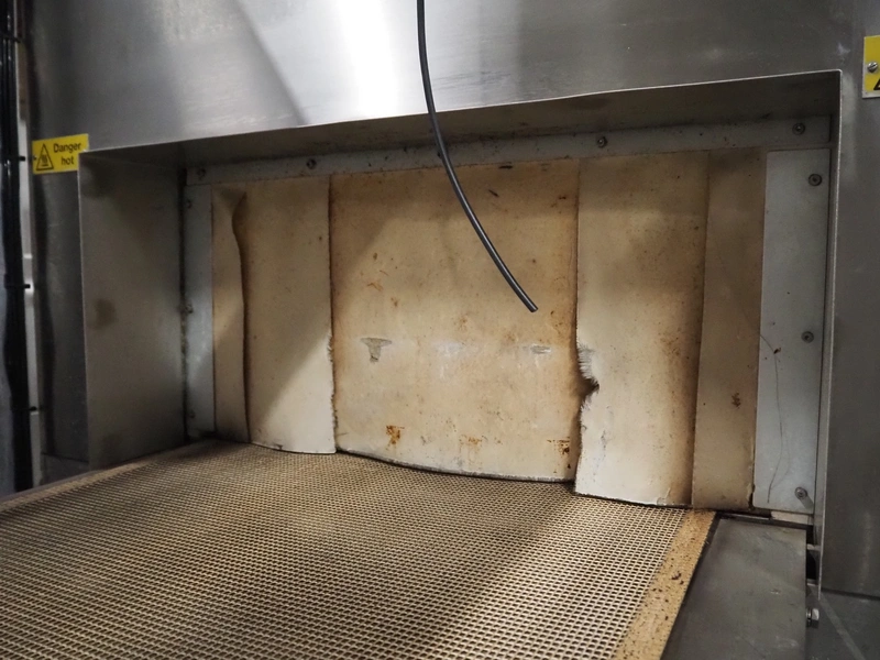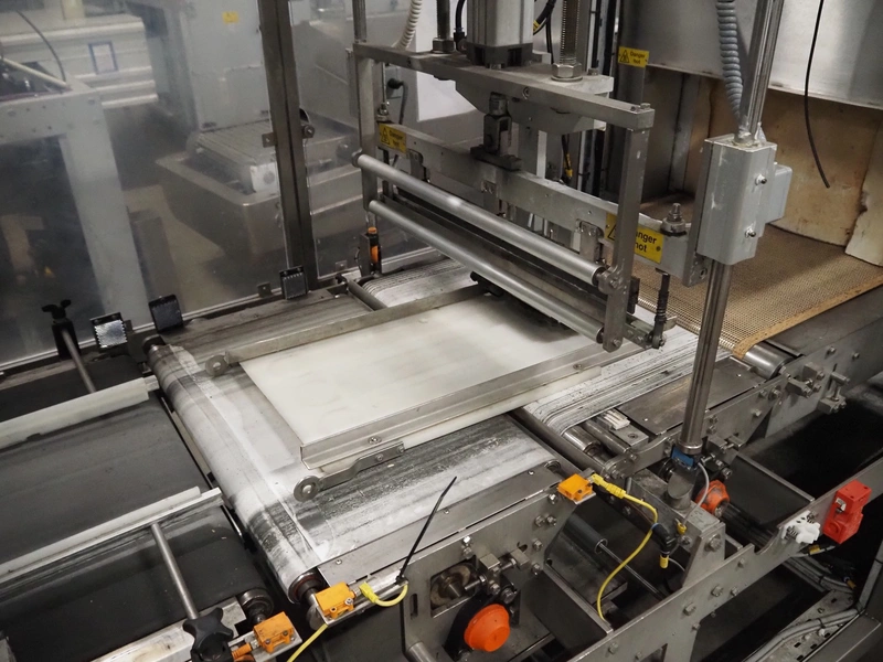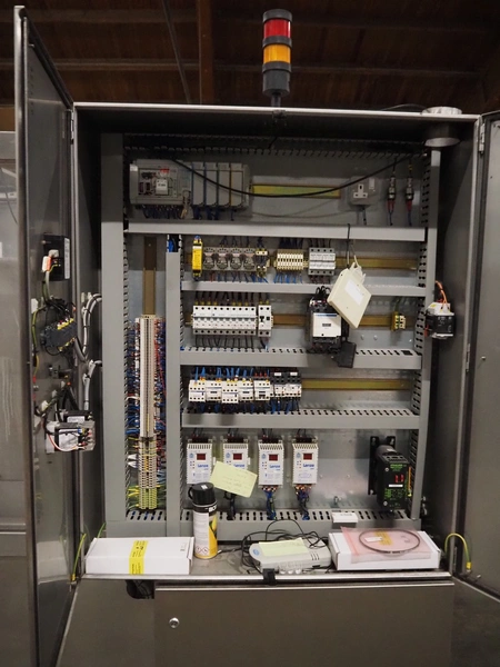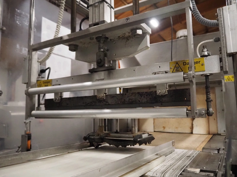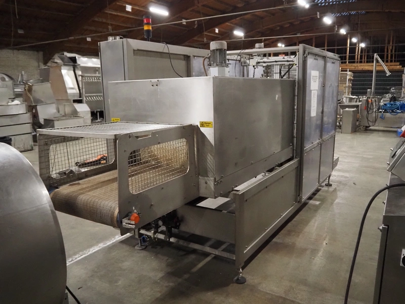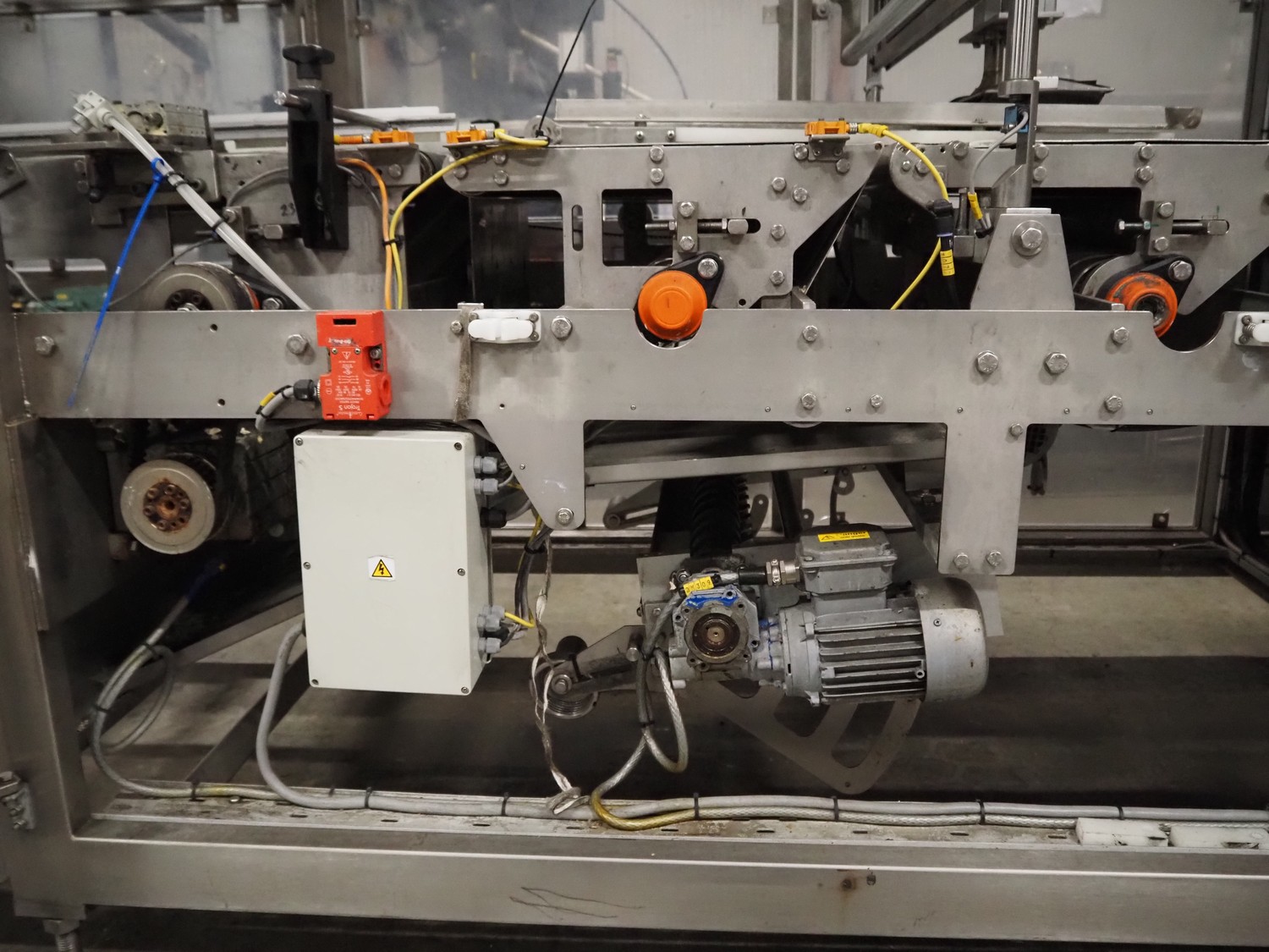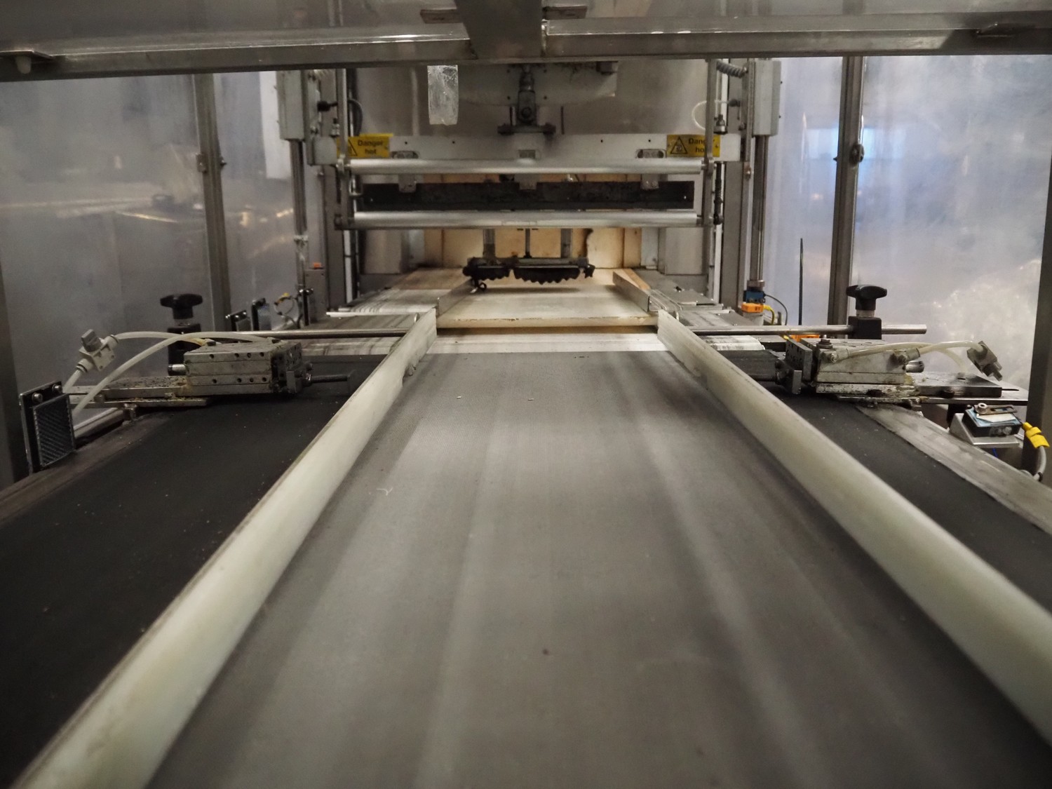 Europack wrapping and shrinking line, serial number: 05-10915E, year of construction: 2005, 400 V, 3 Ph, 50 Hz, 45 A, 28 kW, plastic belt, belt width: 650 mm, seal length: 700 mm, clearance: 720 mm x 370 mm, cloth belt, belt width: 610 mm, total dimensions: 5000 mm x 1300 mm x 1950 mm.