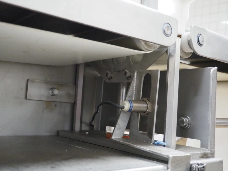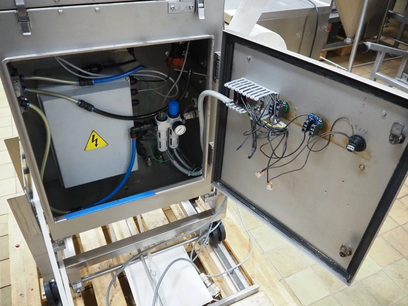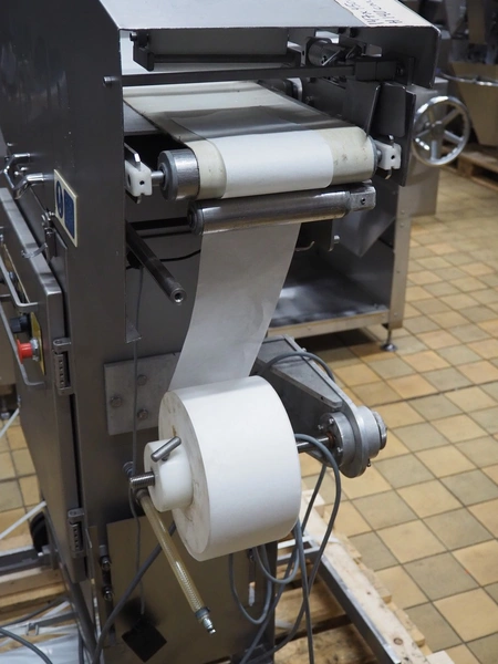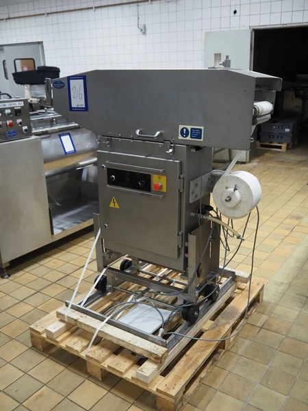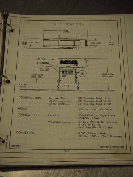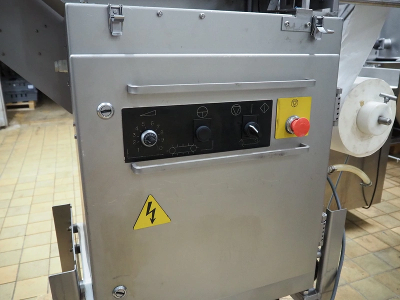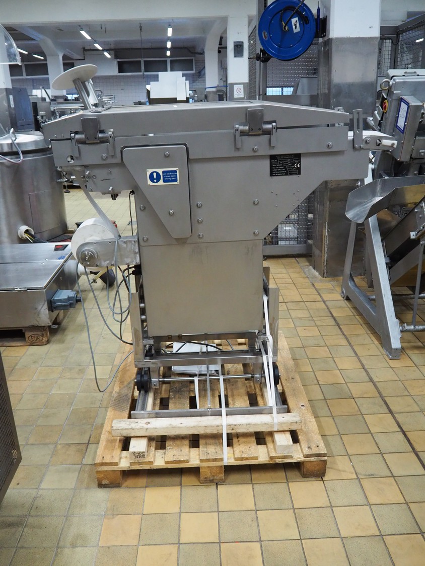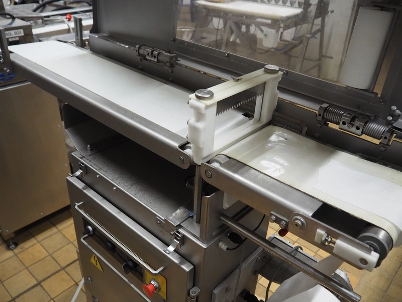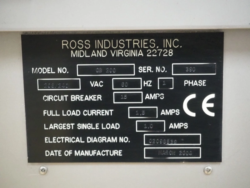 Ross Industries, INC. portion cutter with paper interleaver, model: GB 200, serial number: 390, year of construction: 03/2004, 208/240 V, 1 Ph, 60 Hz, 15/1.5/1.0 A, plastic belt, belt width: 200 mm, working width: 200 mm, total dimensions: 1480 mm x 900 mm x 1400 mm.