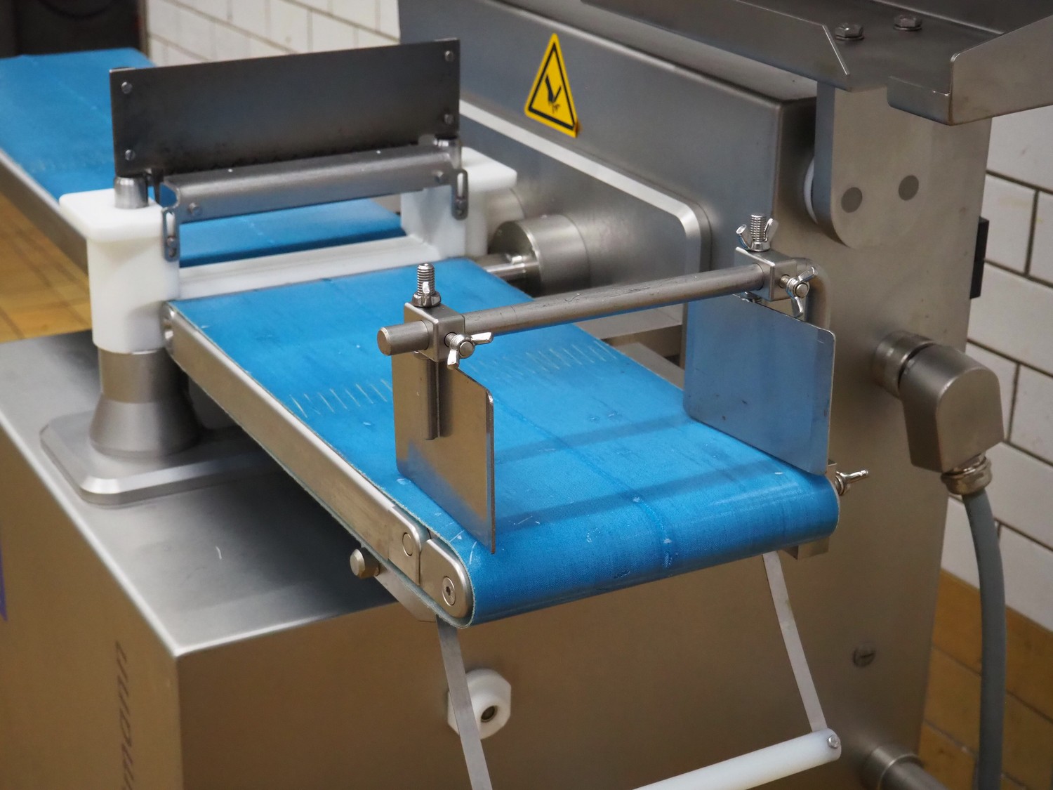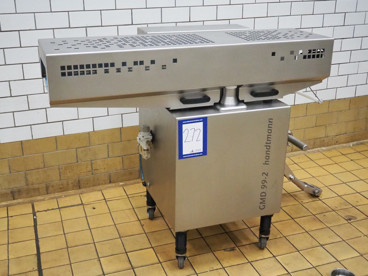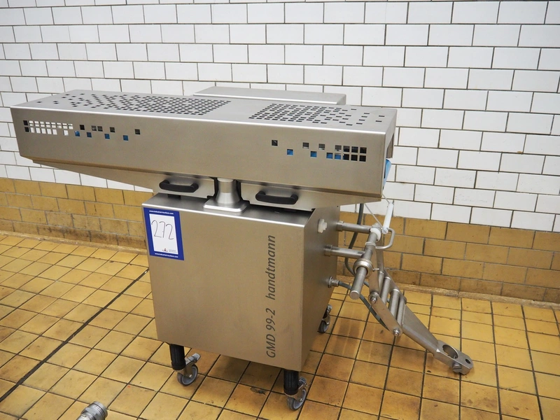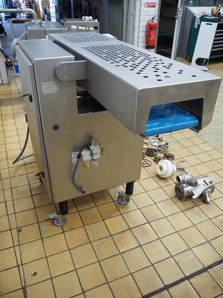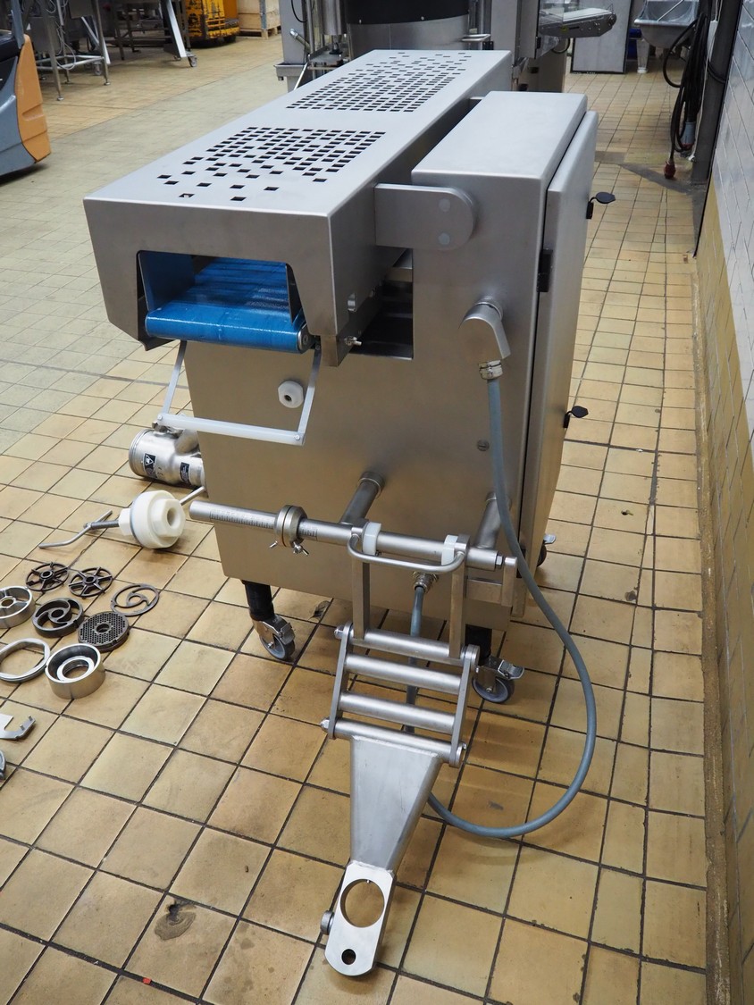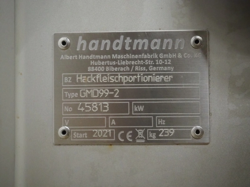 Handtmann mobile portioning machine, type: GMD99-2, number: 45813, year of construction: 2021, weight: 239 kg, working width: 5250 mm, plastic belt, belt width: 250 mm, total dimensions: 1400 mm x 680 mm x 1500 mm. Including Handtmann grinding head, type: 93-3, number: 14303414.