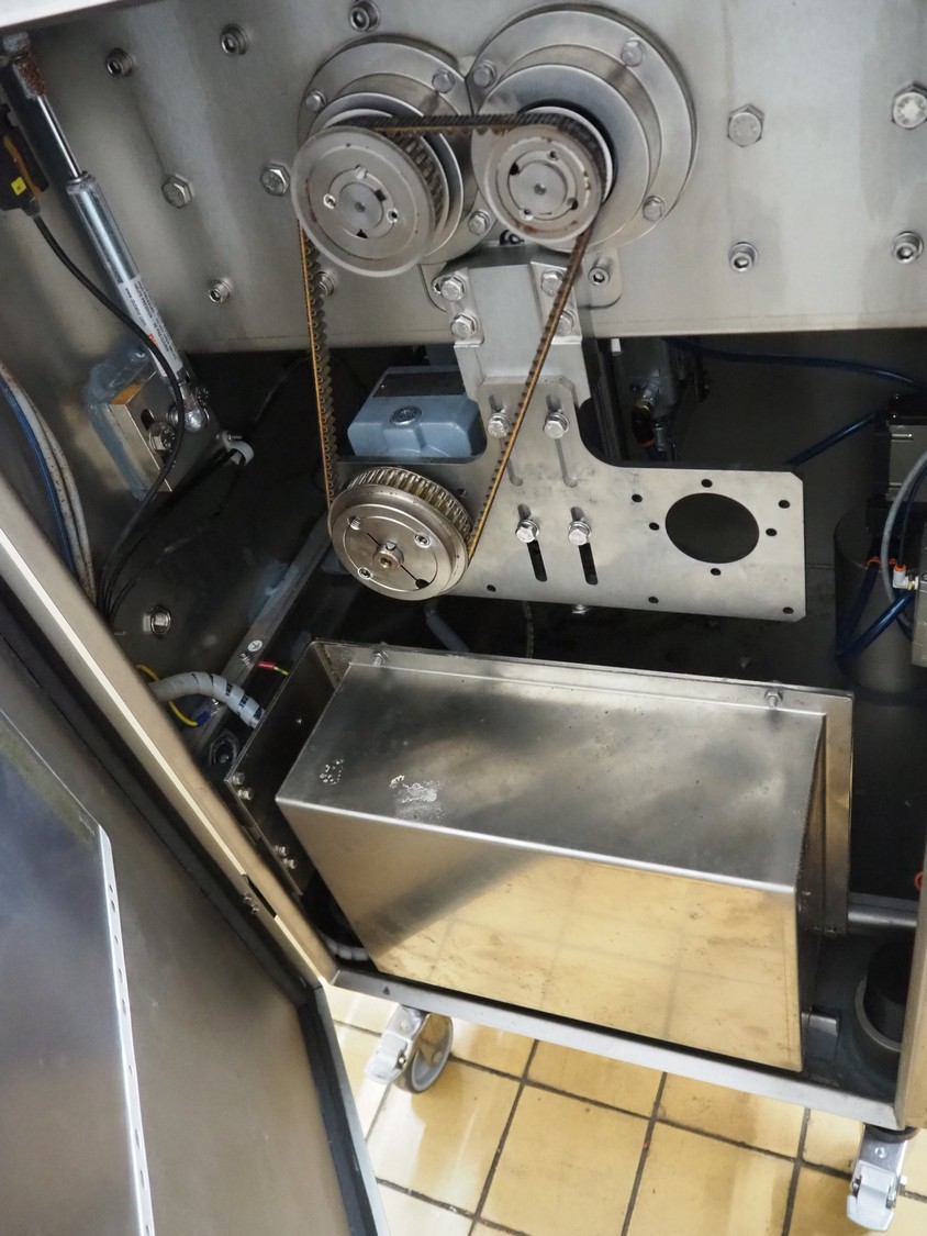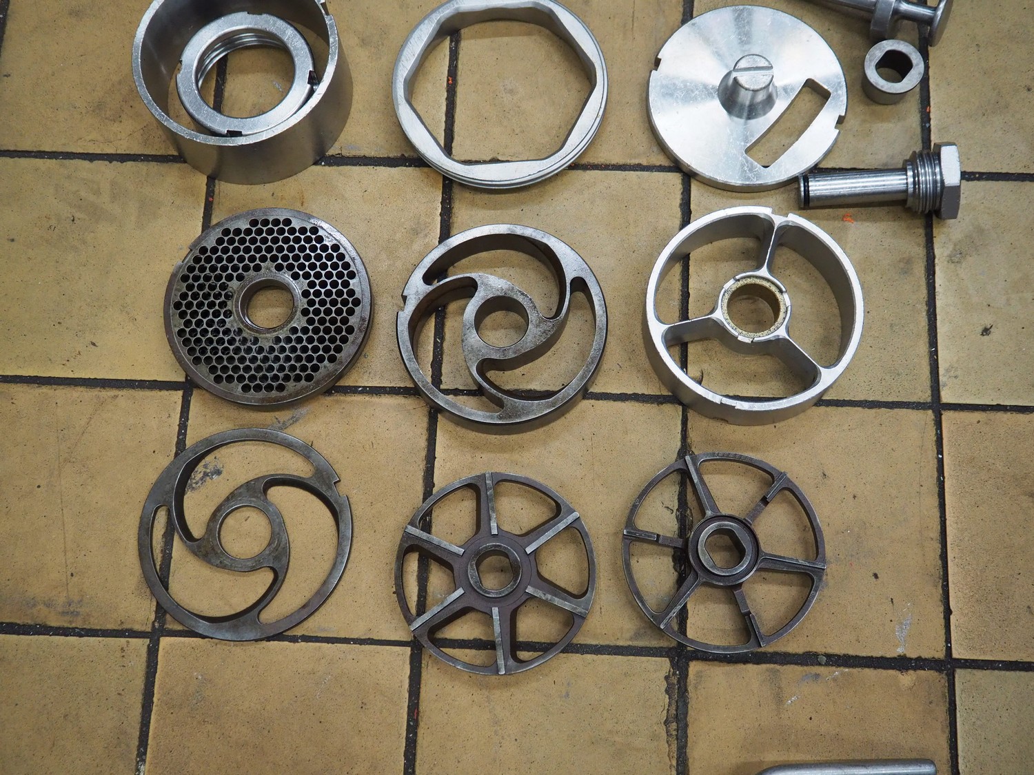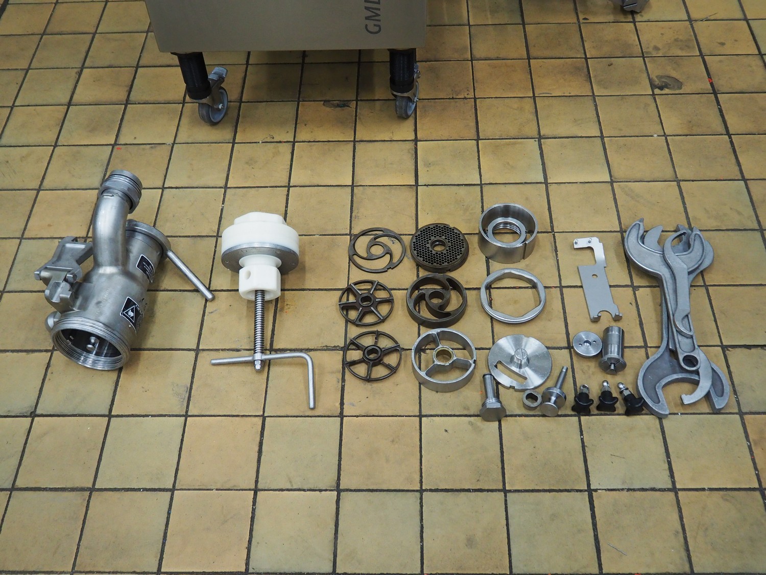 Handtmann mobile portioning machine, type: GMD99-2, number: 45813, year of construction: 2021, weight: 239 kg, working width: 5250 mm, plastic belt, belt width: 250 mm, total dimensions: 1400 mm x 680 mm x 1500 mm. Including Handtmann grinding head, type: 93-3, number: 14303414.