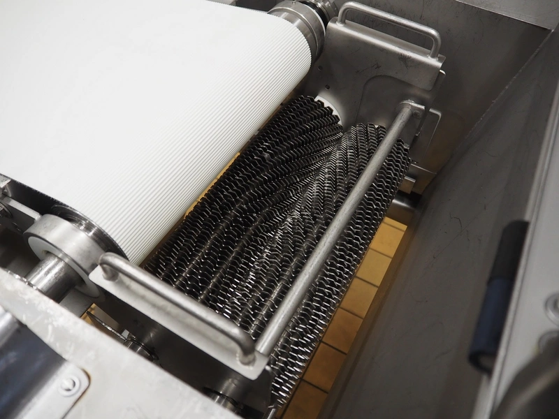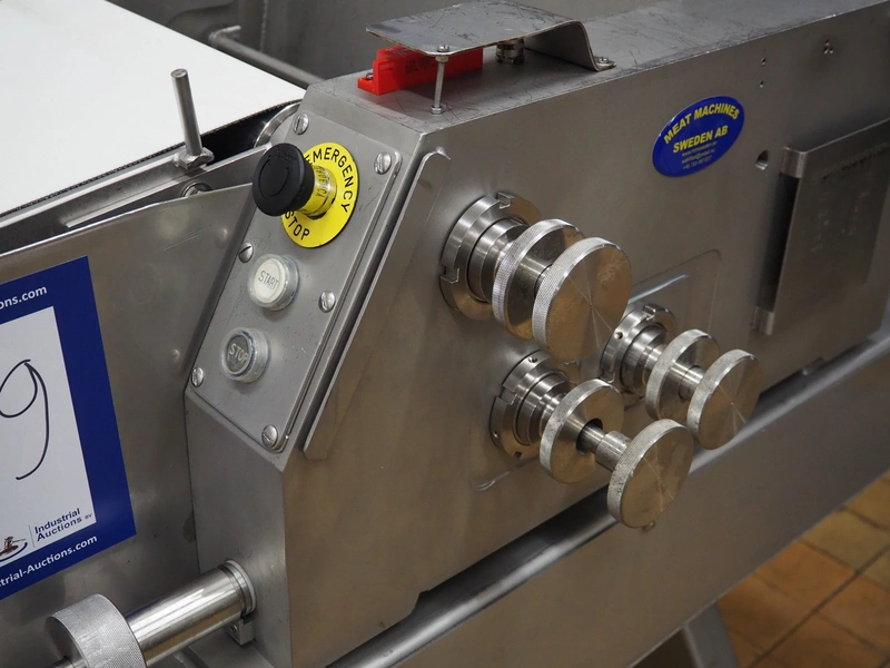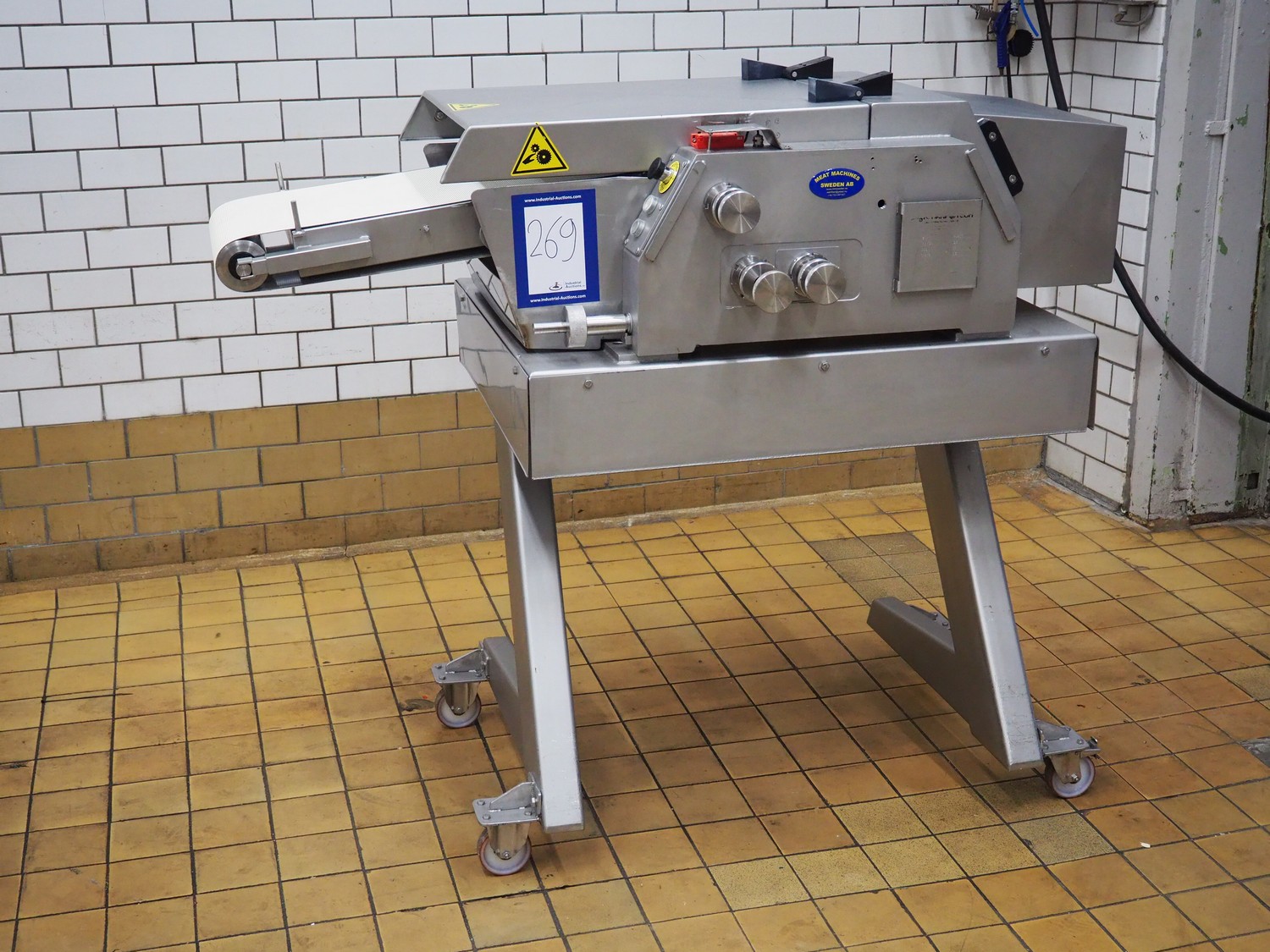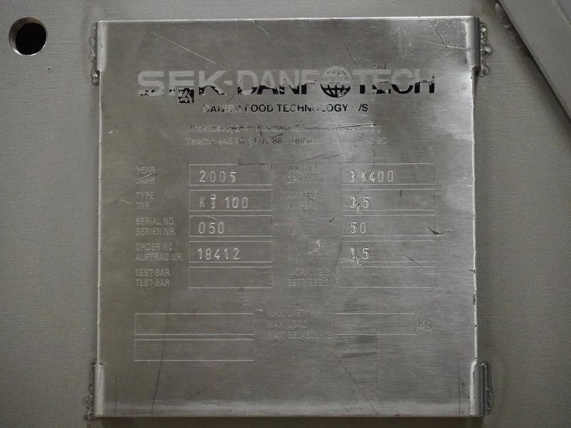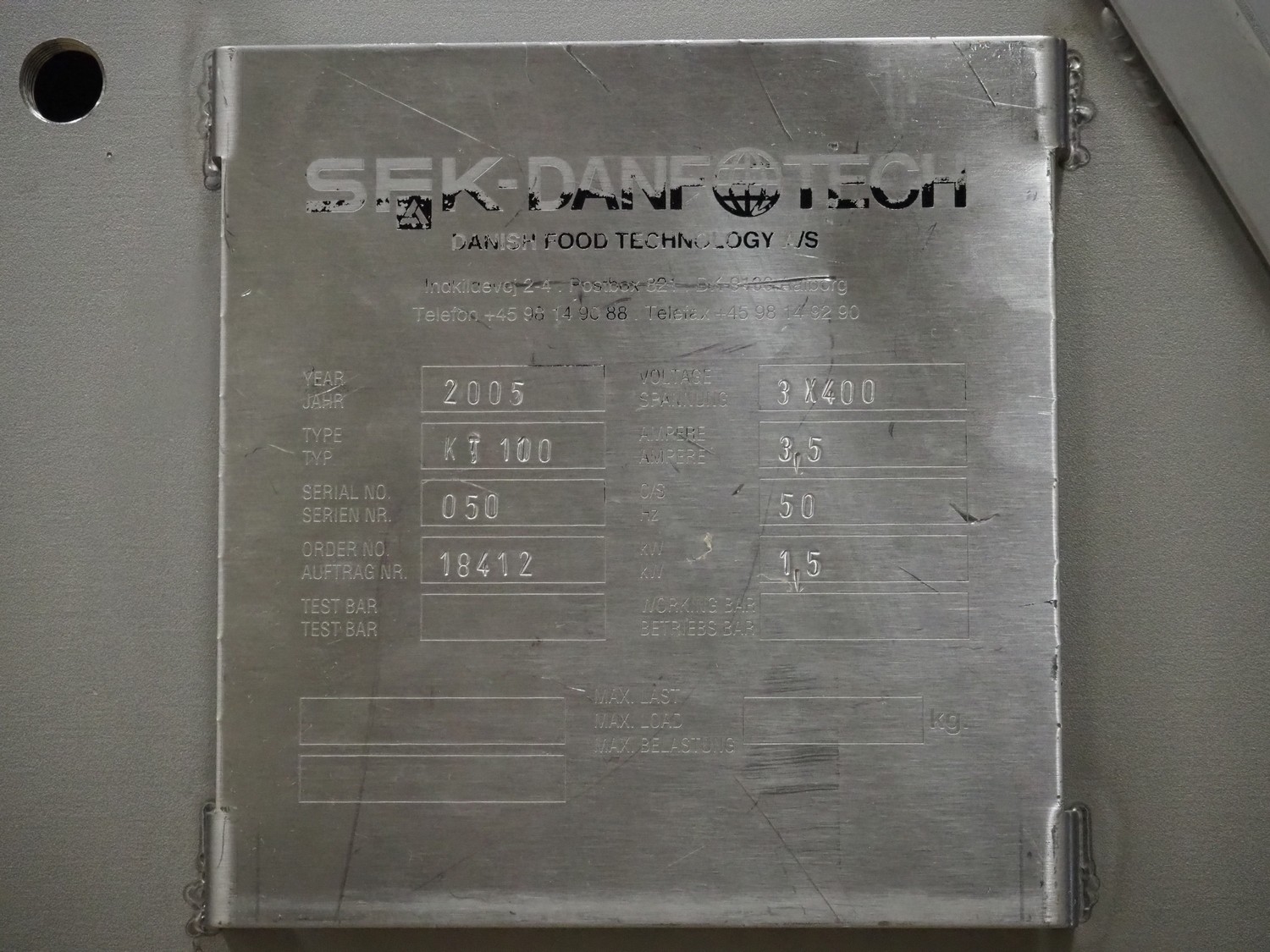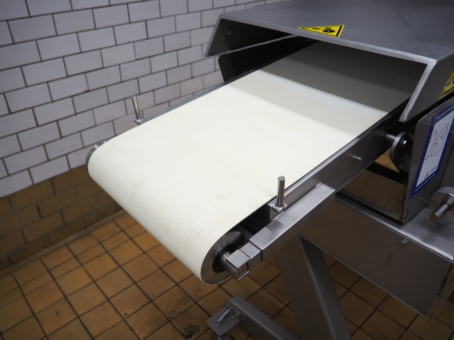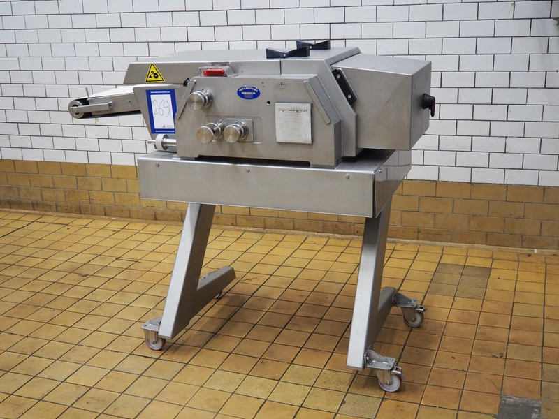 SFK-Danfotech mobile tenderizer, type: KT 100, serial number: 050, year of construction: 2005, 3x 400 V, 50 Hz, 3.5 A, 1.5 kW, belt width: 350 mm, working width: 390 mm, total dimensions: 1700 mm x 1000 mm x 1400 mm.