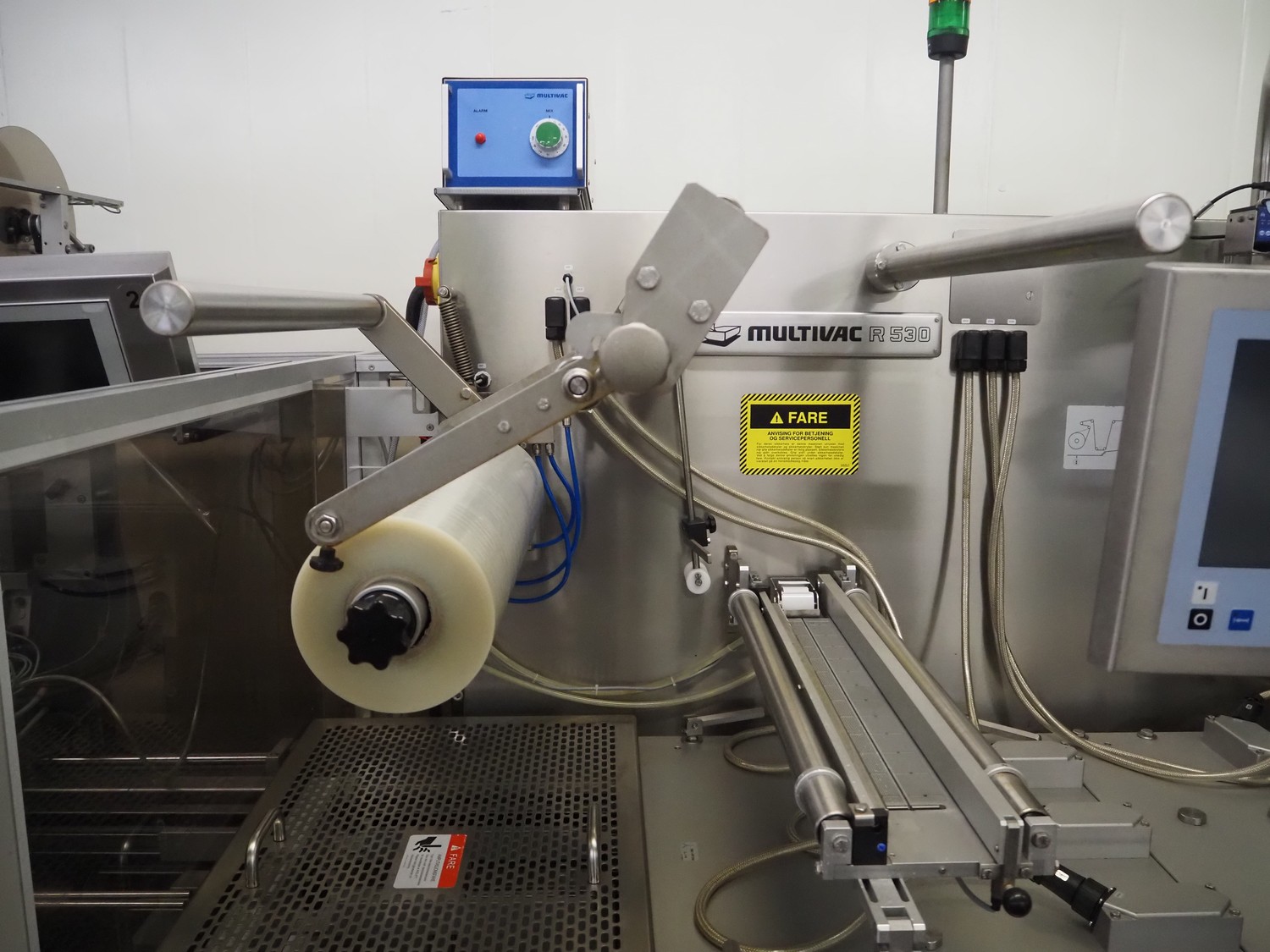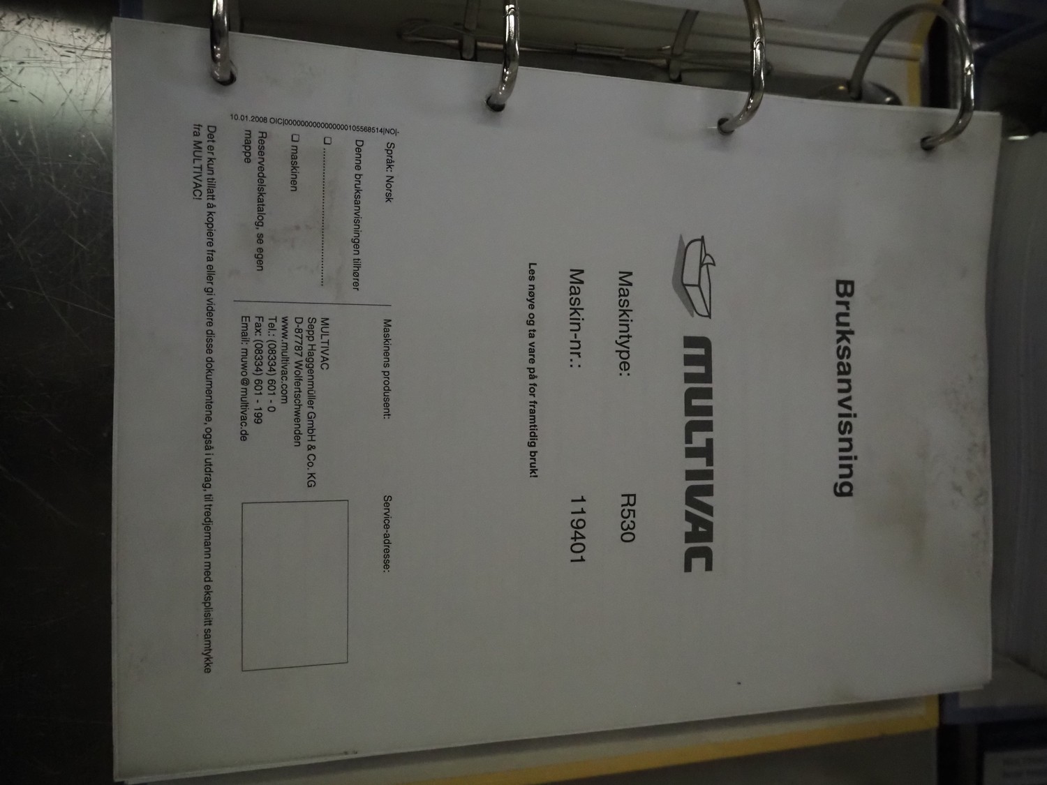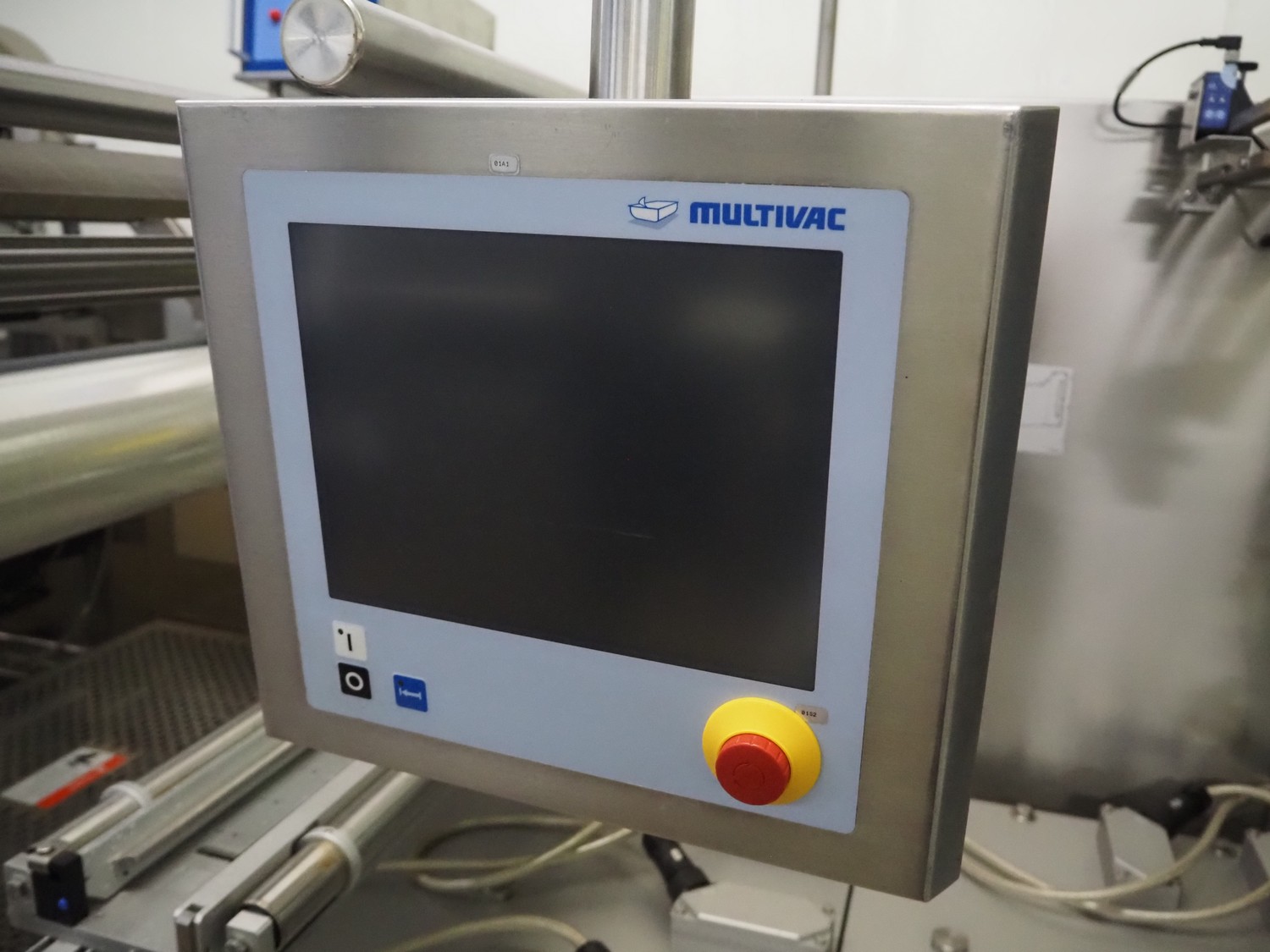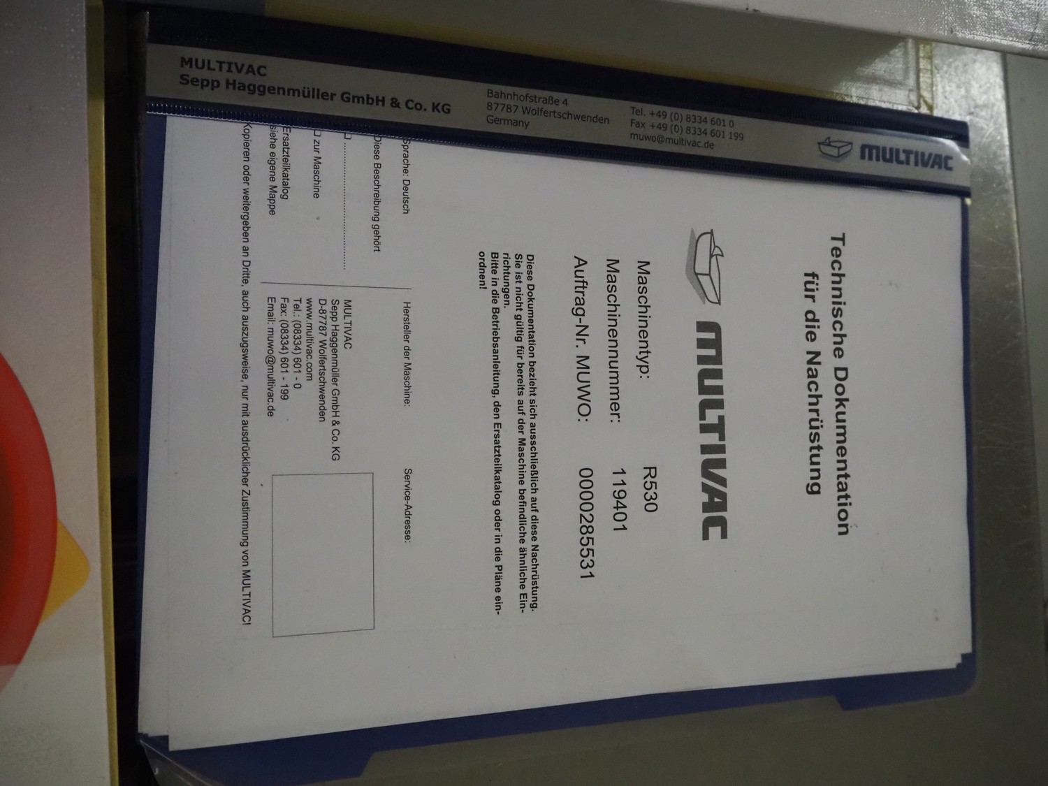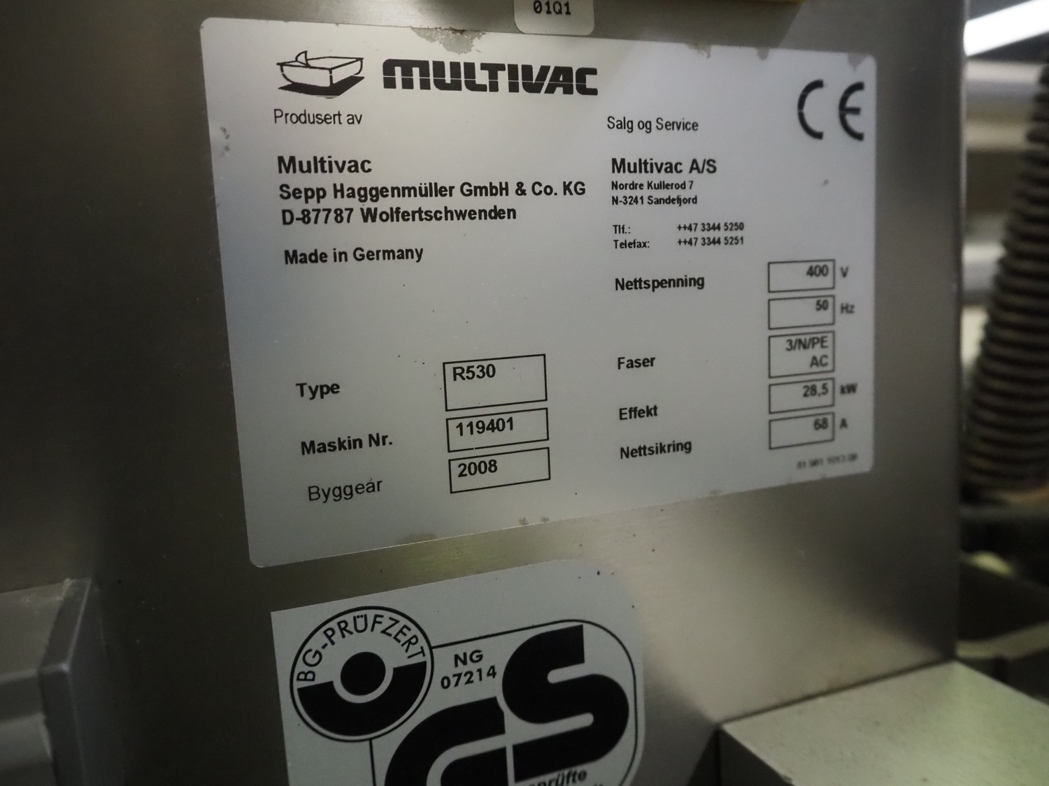 Multivac thermoformer, type: R530, number: 119401, year of construction: 2008, 400 V, 3 Ph, 50 Hz, 68 A, 28.5 kW, film width: 690 mm, dye: (12x) 165 mm x 130 mm, index: 600 mm, plastic outfeed belt, belt width: (3x) 140 mm, with 2 MR Etikettiertechnik labellers and Busch vacuum pump, total dimensions: 14150 mm x 1400 mm x 2600 mm. Including film roll holder, dimensions: 800 mm x 800 mm x 1930 mm.
