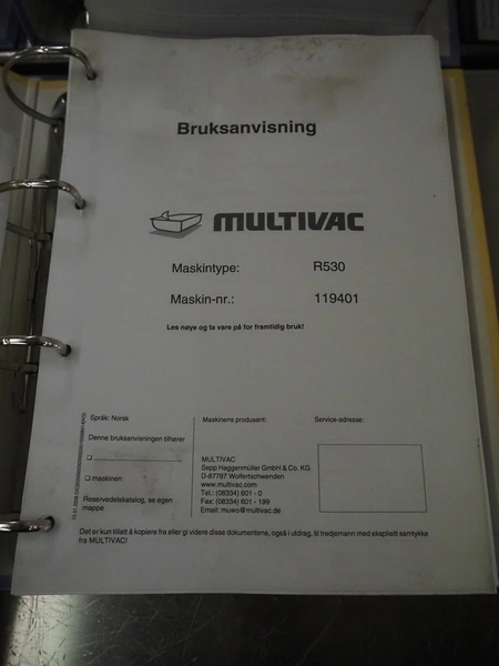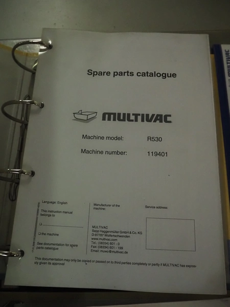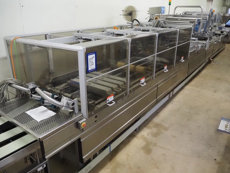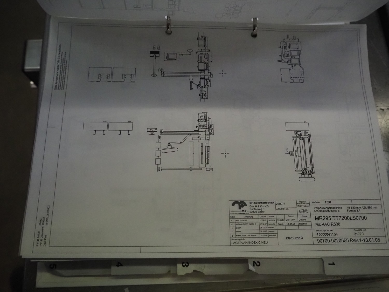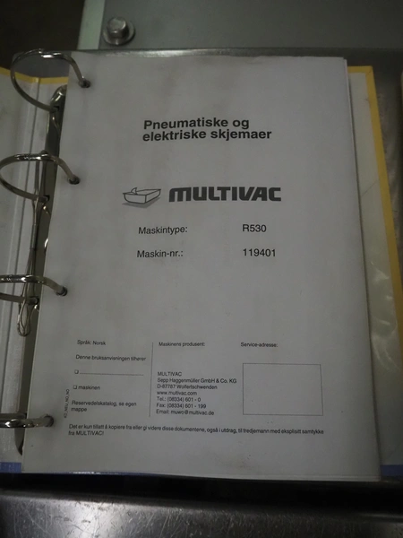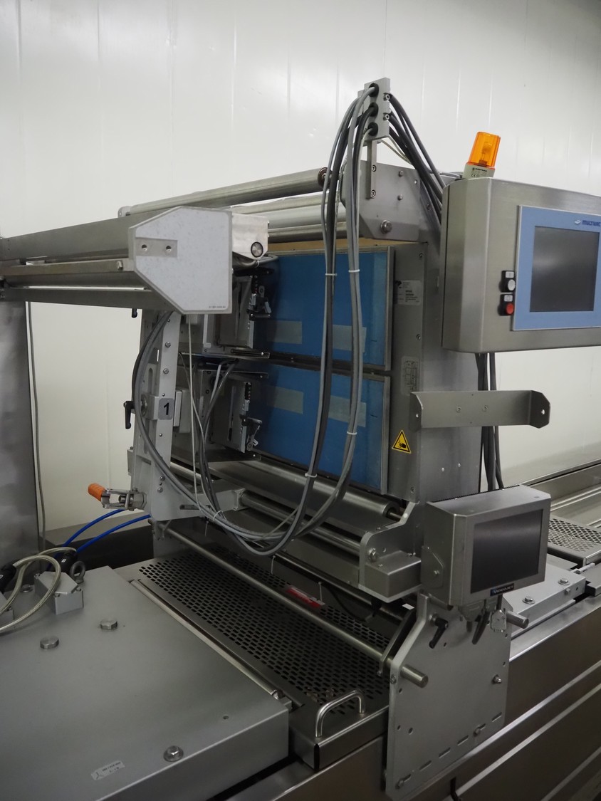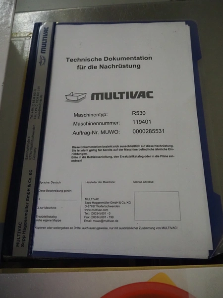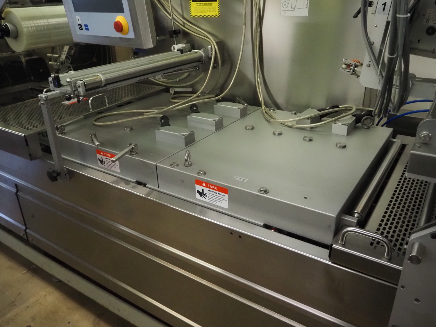 Multivac thermoformer, type: R530, number: 119401, year of construction: 2008, 400 V, 3 Ph, 50 Hz, 68 A, 28.5 kW, film width: 690 mm, dye: (12x) 165 mm x 130 mm, index: 600 mm, plastic outfeed belt, belt width: (3x) 140 mm, with 2 MR Etikettiertechnik labellers and Busch vacuum pump, total dimensions: 14150 mm x 1400 mm x 2600 mm. Including film roll holder, dimensions: 800 mm x 800 mm x 1930 mm.