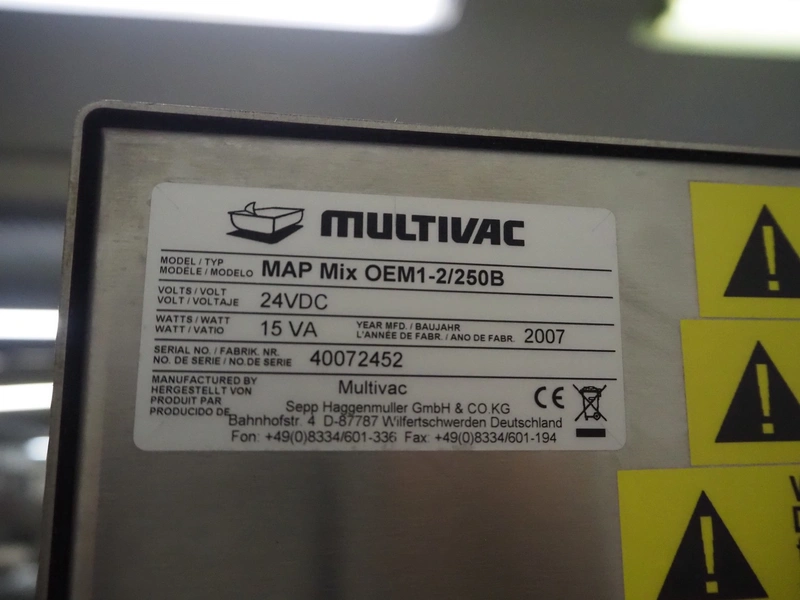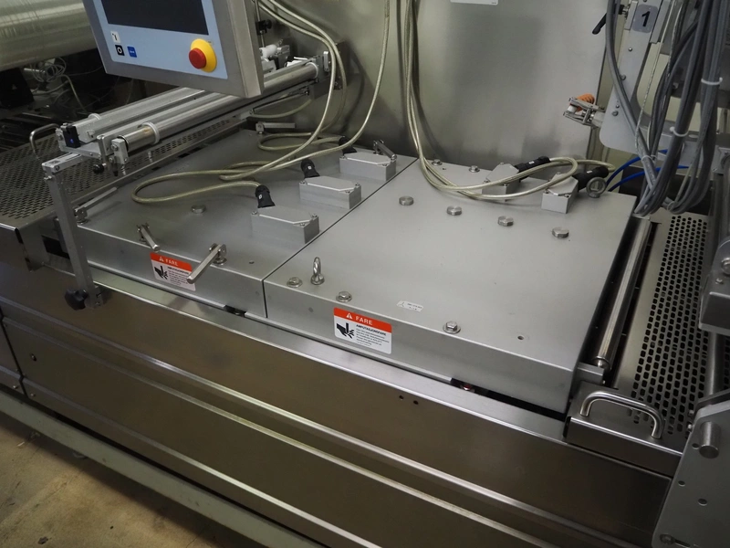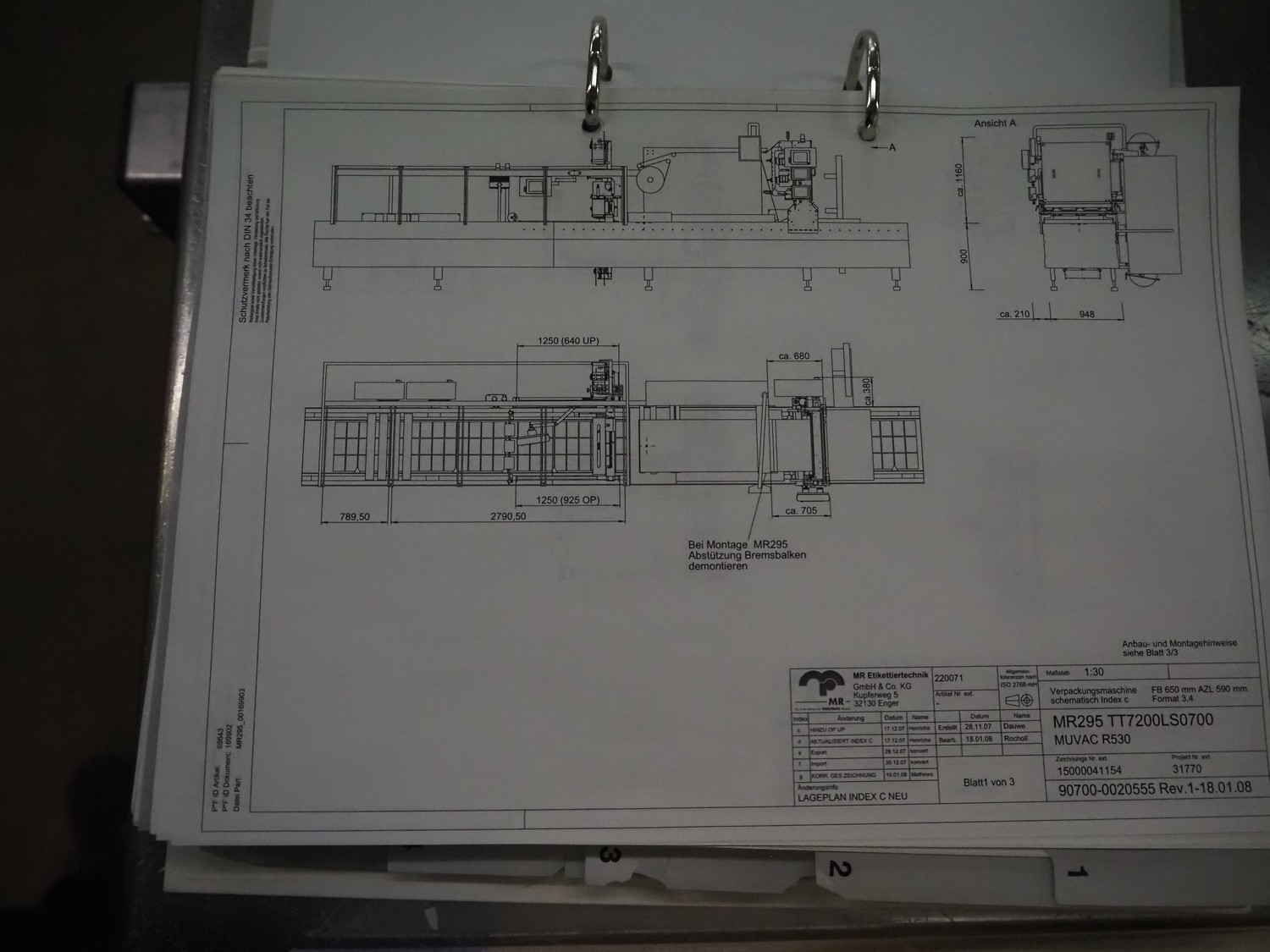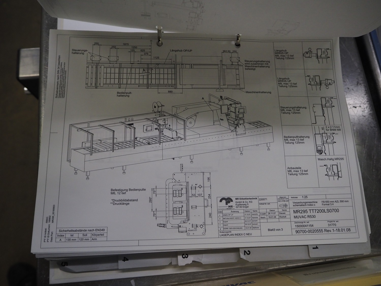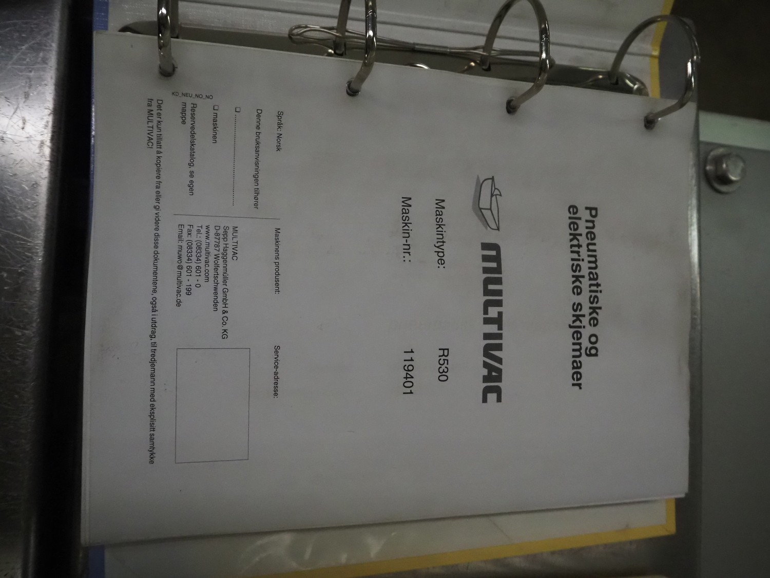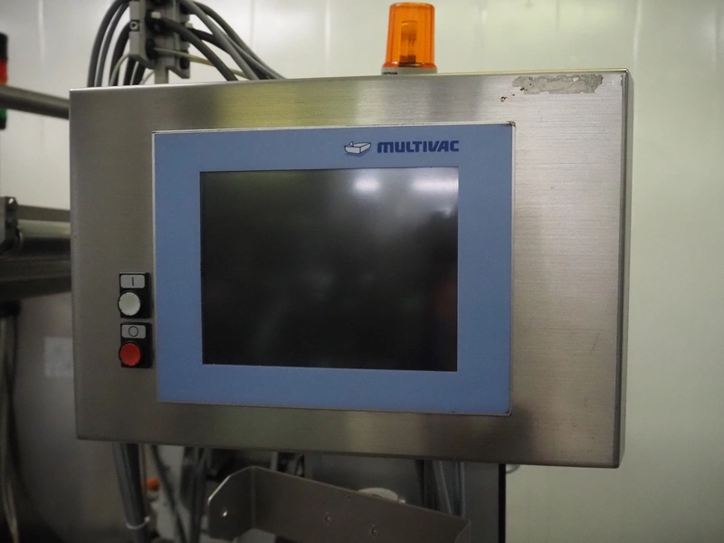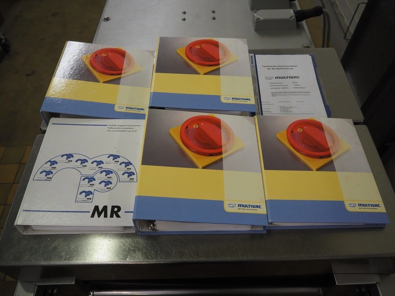 Multivac thermoformer, type: R530, number: 119401, year of construction: 2008, 400 V, 3 Ph, 50 Hz, 68 A, 28.5 kW, film width: 690 mm, dye: (12x) 165 mm x 130 mm, index: 600 mm, plastic outfeed belt, belt width: (3x) 140 mm, with 2 MR Etikettiertechnik labellers and Busch vacuum pump, total dimensions: 14150 mm x 1400 mm x 2600 mm. Including film roll holder, dimensions: 800 mm x 800 mm x 1930 mm.