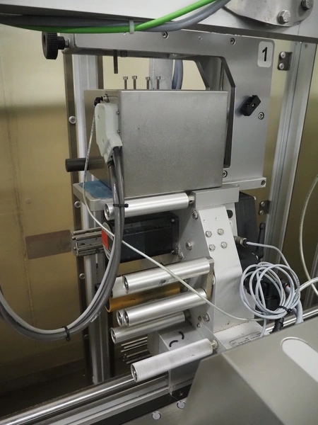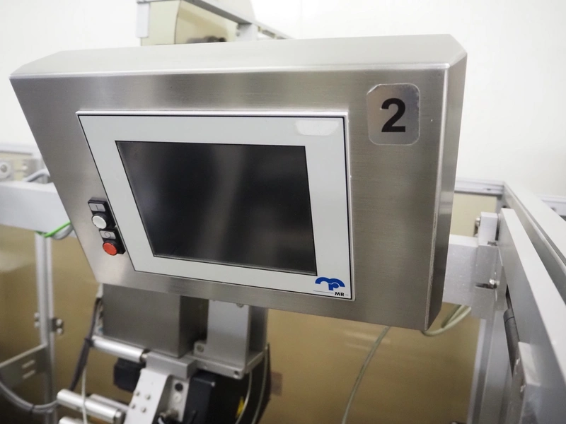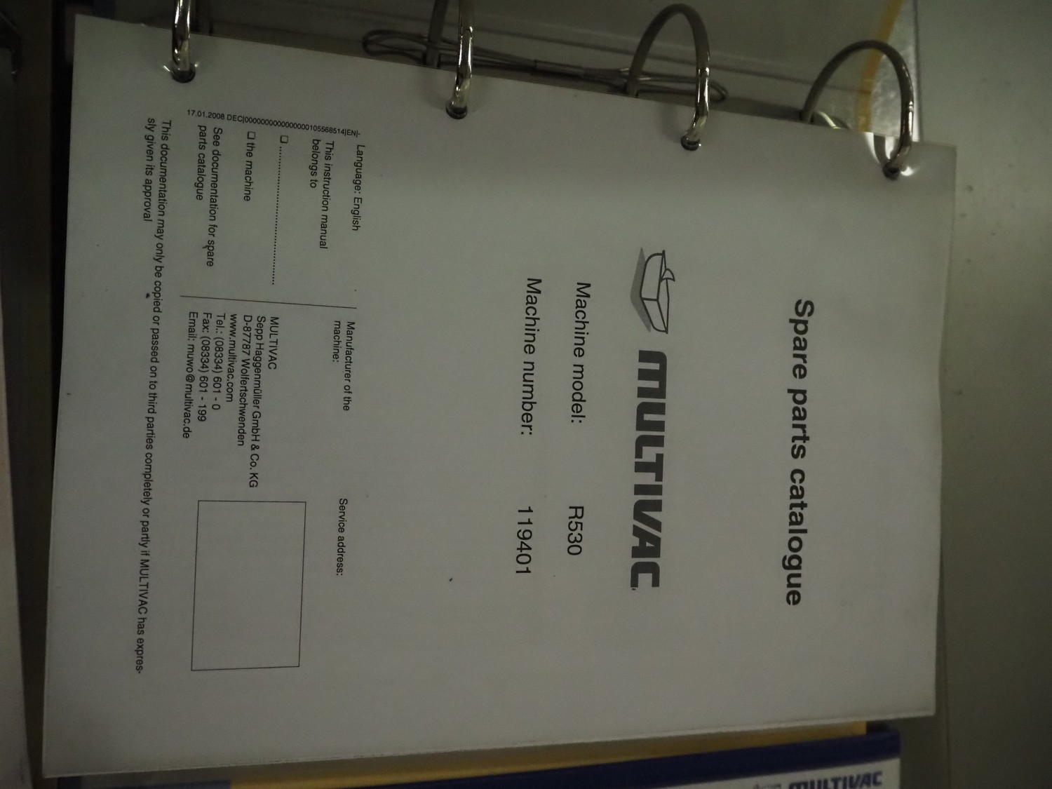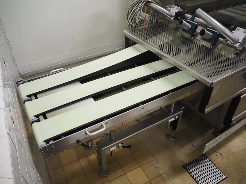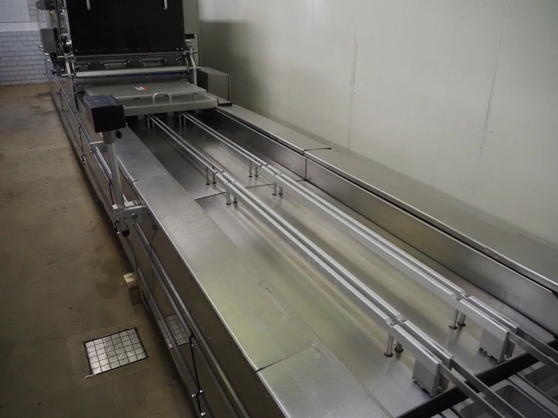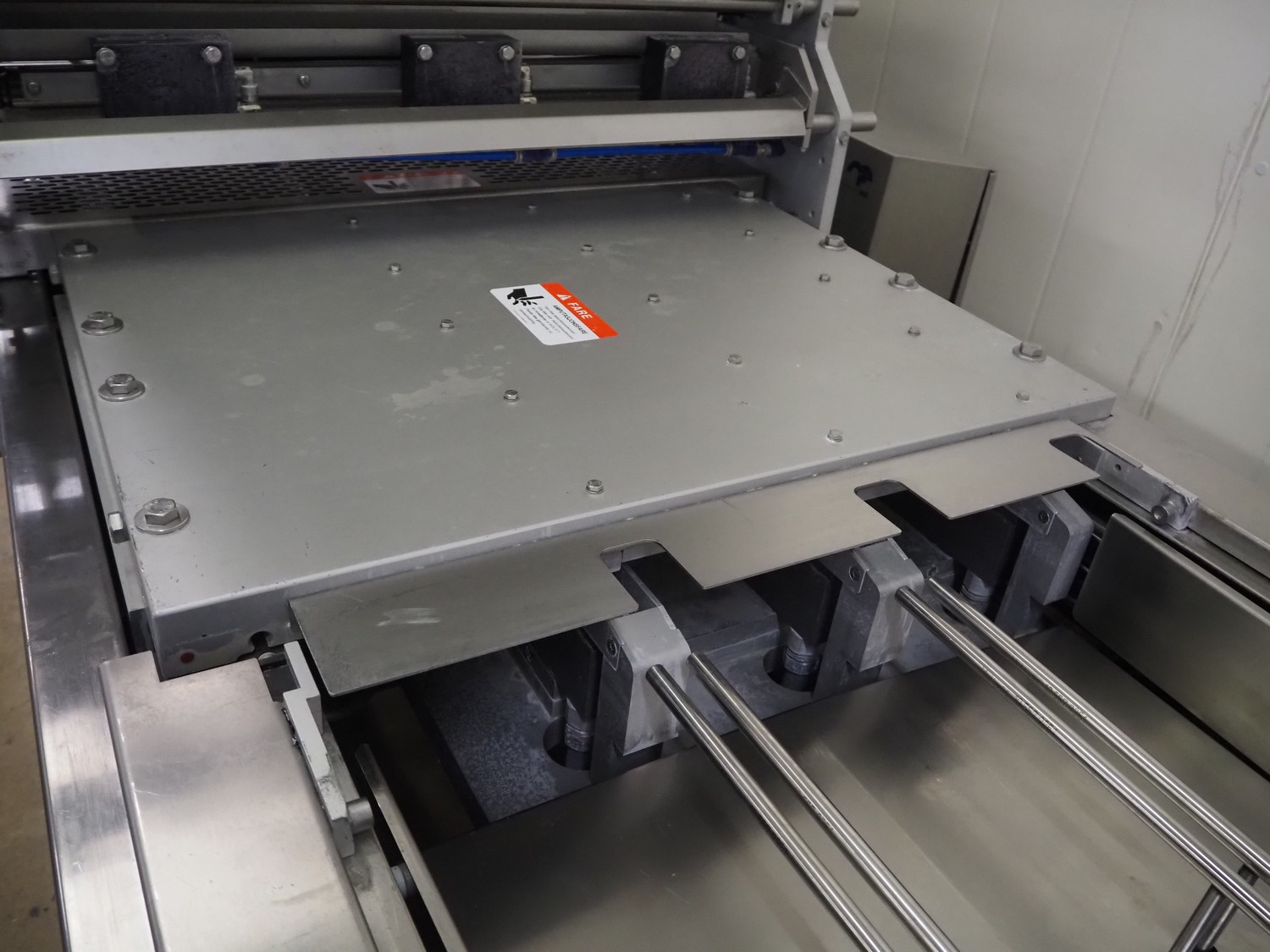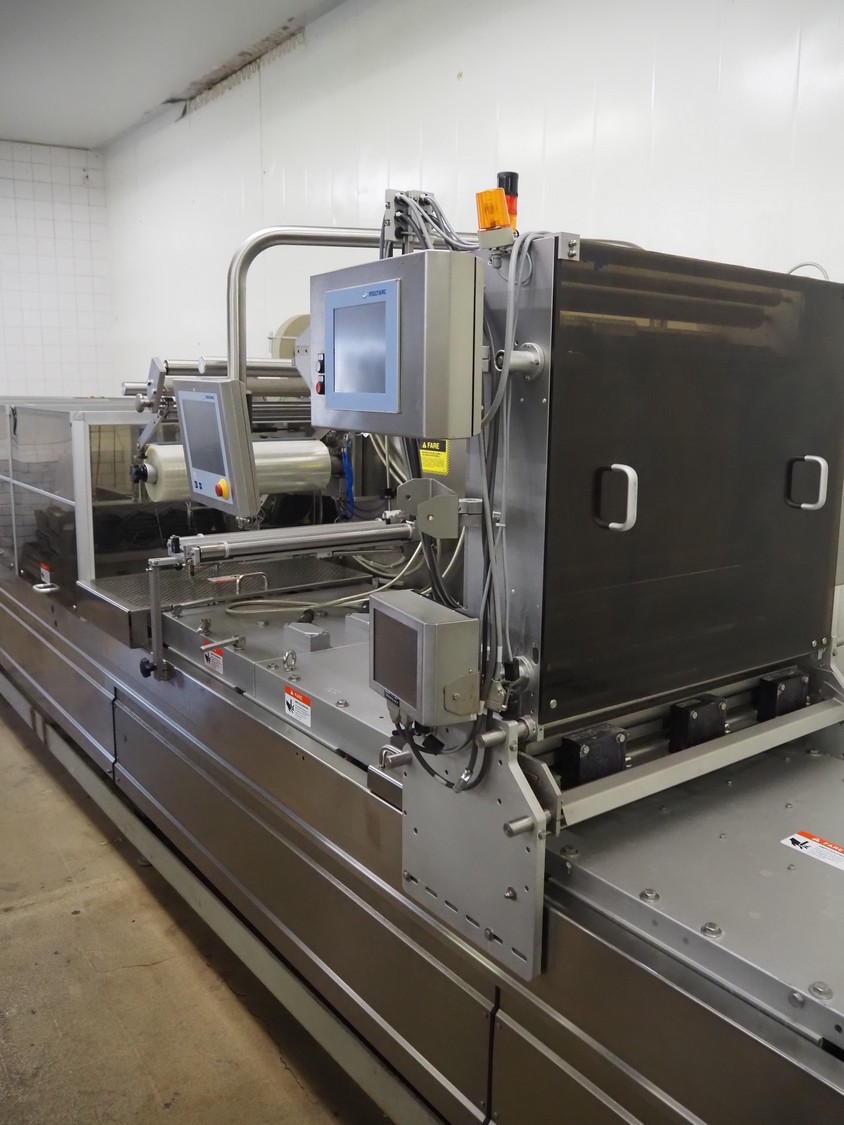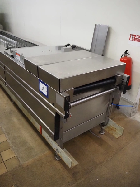 Multivac thermoformer, type: R530, number: 119401, year of construction: 2008, 400 V, 3 Ph, 50 Hz, 68 A, 28.5 kW, film width: 690 mm, dye: (12x) 165 mm x 130 mm, index: 600 mm, plastic outfeed belt, belt width: (3x) 140 mm, with 2 MR Etikettiertechnik labellers and Busch vacuum pump, total dimensions: 14150 mm x 1400 mm x 2600 mm. Including film roll holder, dimensions: 800 mm x 800 mm x 1930 mm.