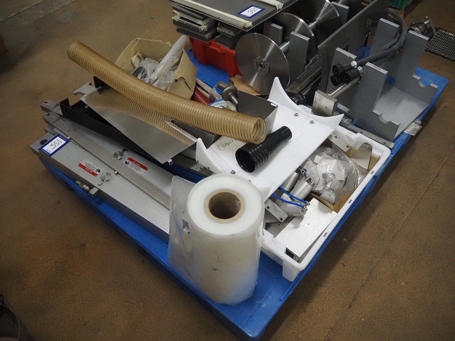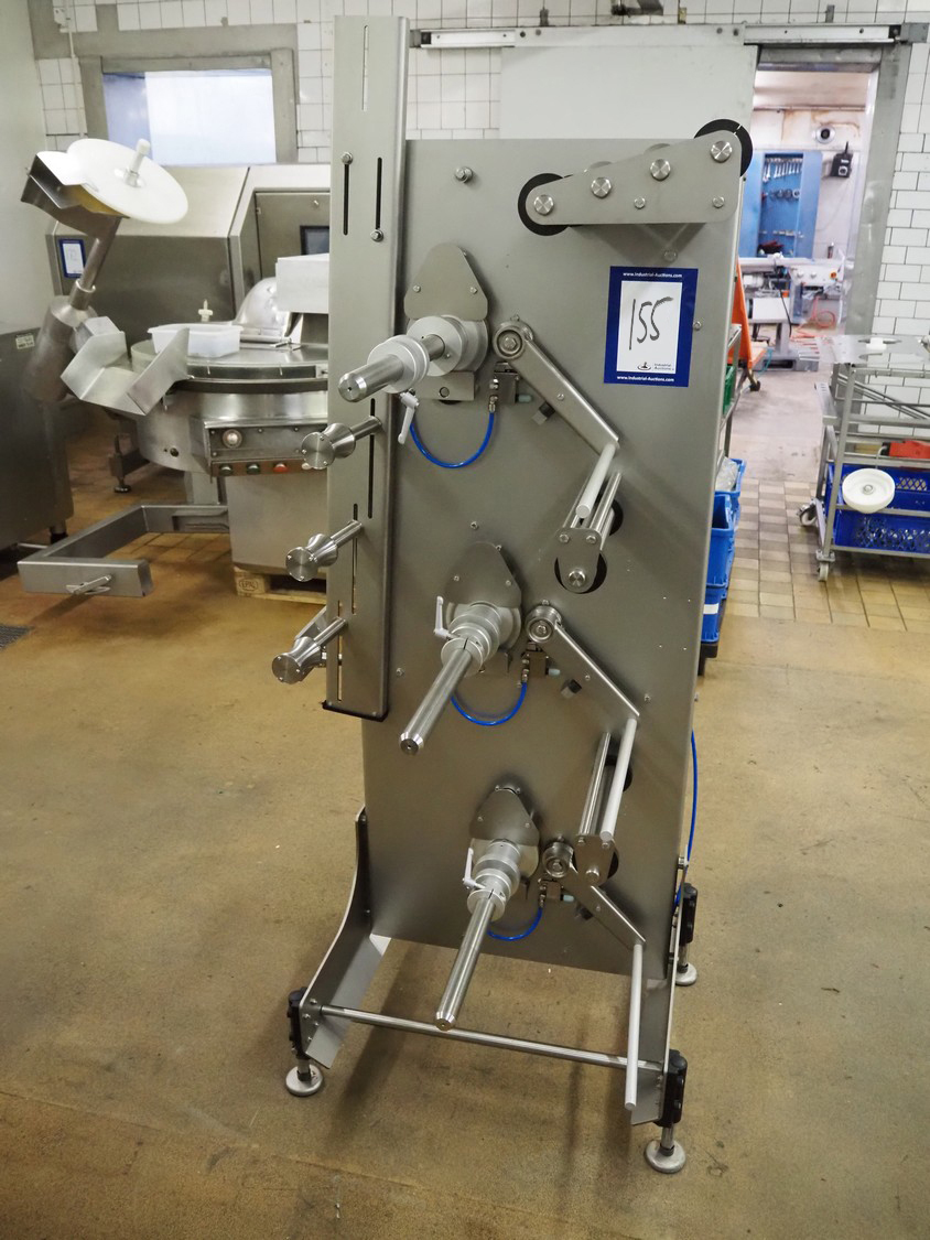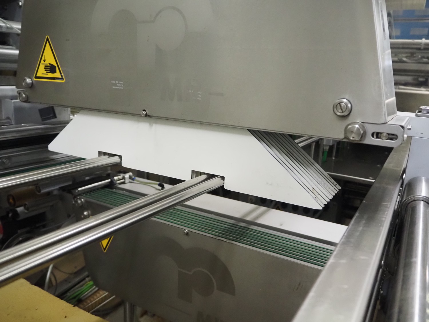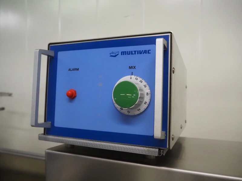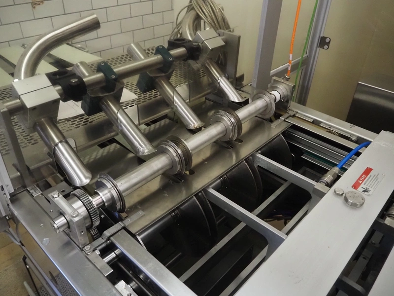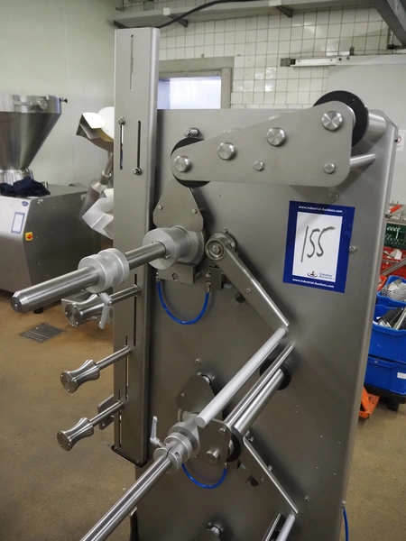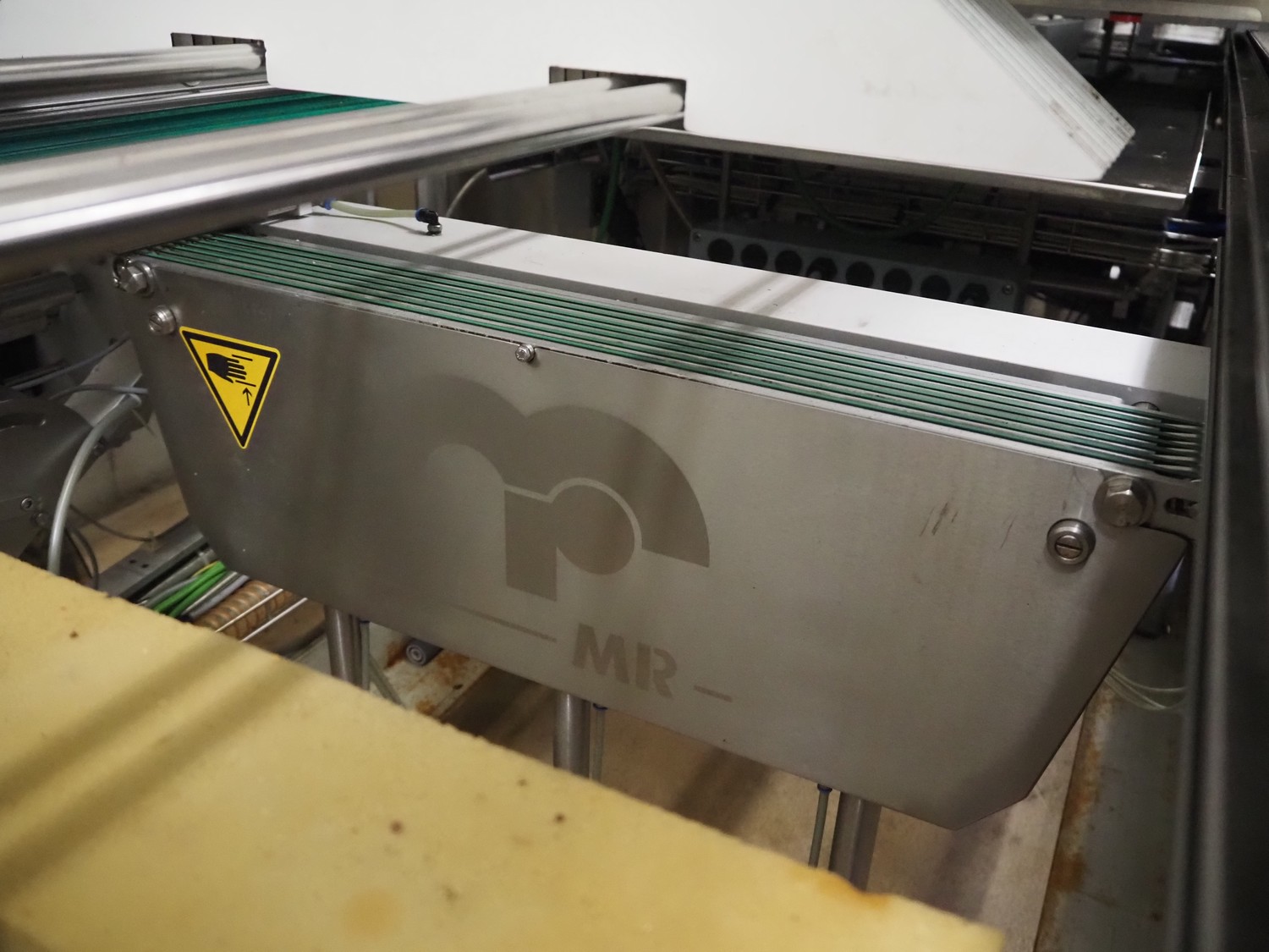 Multivac thermoformer, type: R530, number: 119401, year of construction: 2008, 400 V, 3 Ph, 50 Hz, 68 A, 28.5 kW, film width: 690 mm, dye: (12x) 165 mm x 130 mm, index: 600 mm, plastic outfeed belt, belt width: (3x) 140 mm, with 2 MR Etikettiertechnik labellers and Busch vacuum pump, total dimensions: 14150 mm x 1400 mm x 2600 mm. Including film roll holder, dimensions: 800 mm x 800 mm x 1930 mm.