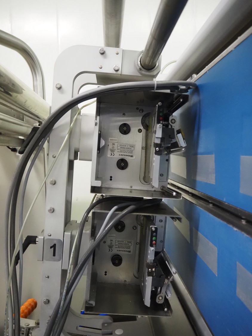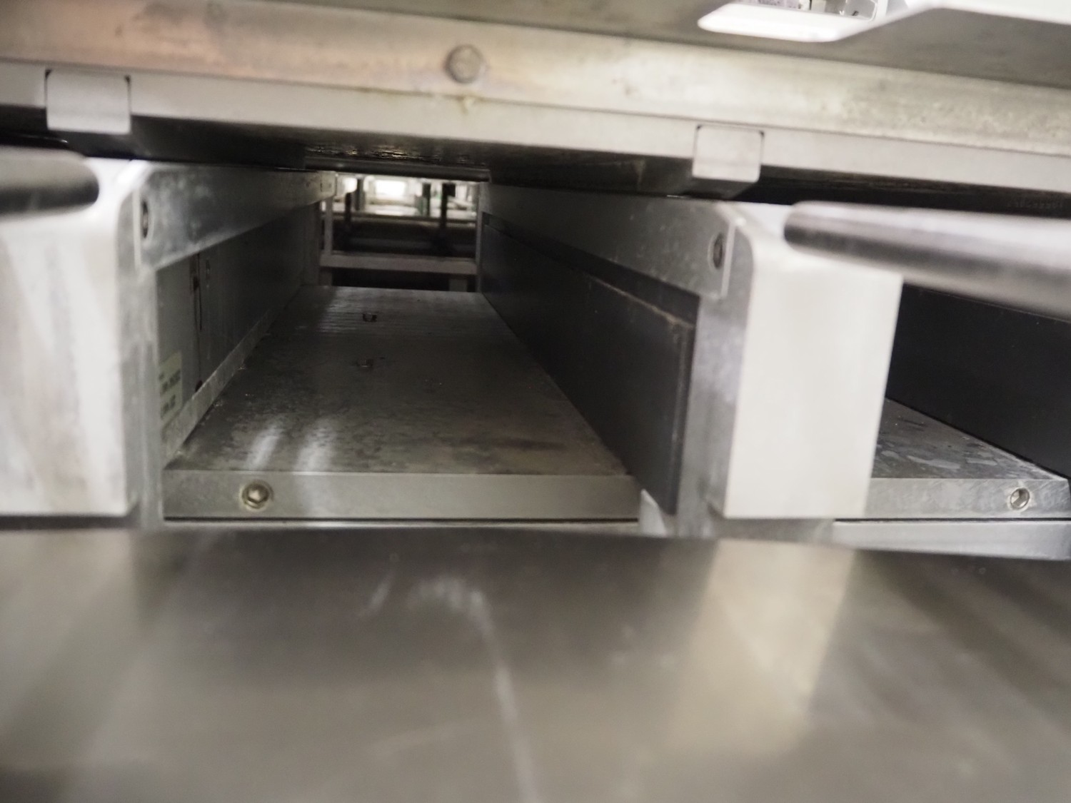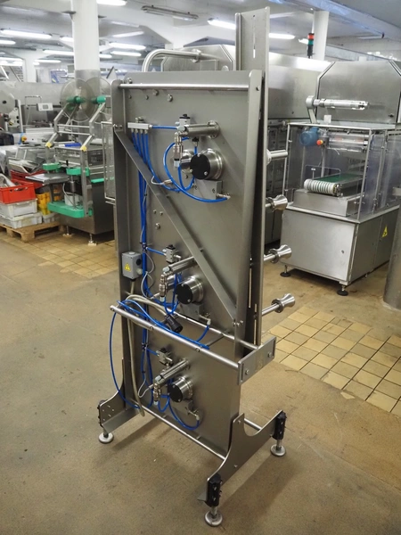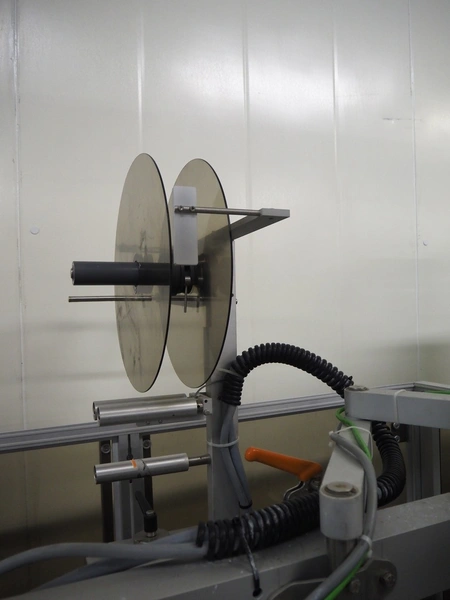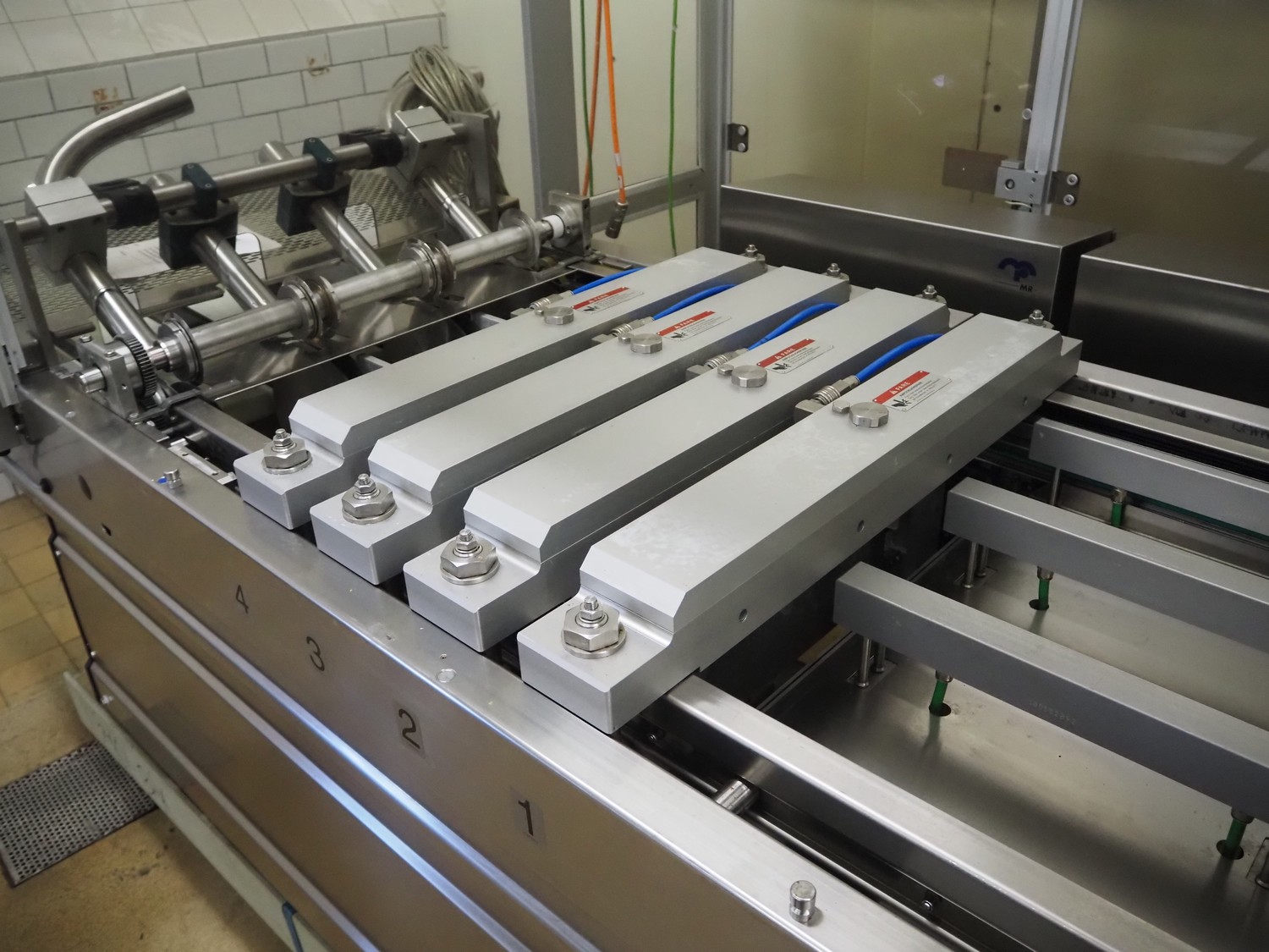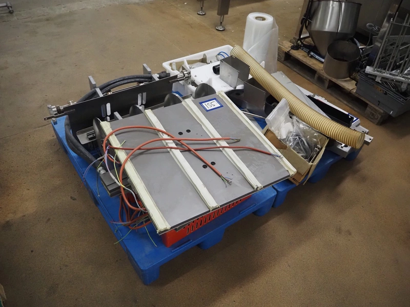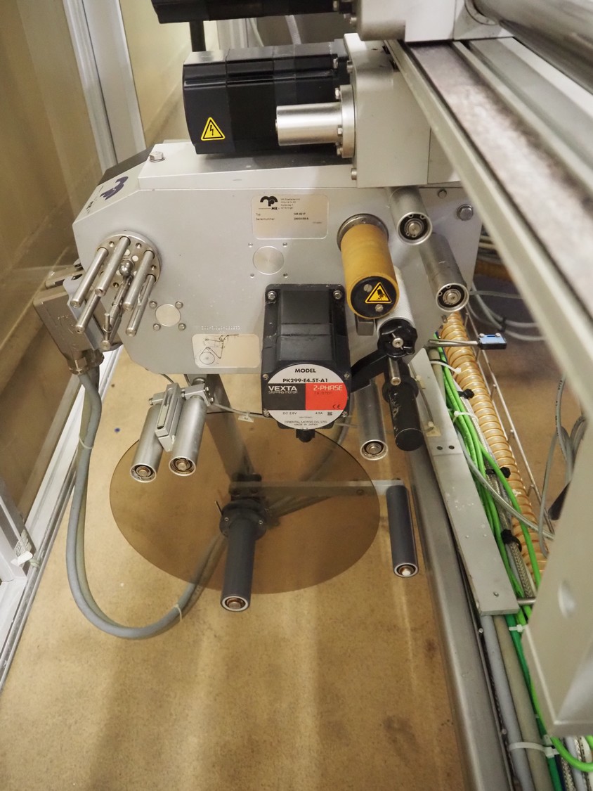 Multivac thermoformer, type: R530, number: 119401, year of construction: 2008, 400 V, 3 Ph, 50 Hz, 68 A, 28.5 kW, film width: 690 mm, dye: (12x) 165 mm x 130 mm, index: 600 mm, plastic outfeed belt, belt width: (3x) 140 mm, with 2 MR Etikettiertechnik labellers and Busch vacuum pump, total dimensions: 14150 mm x 1400 mm x 2600 mm. Including film roll holder, dimensions: 800 mm x 800 mm x 1930 mm.