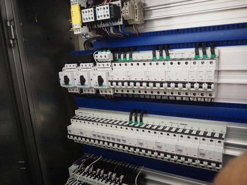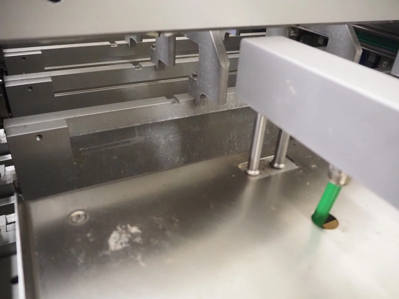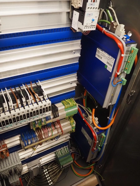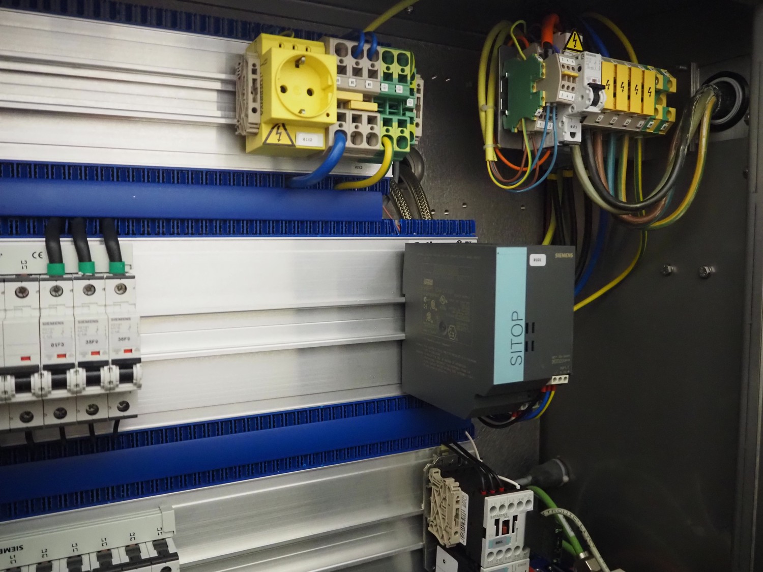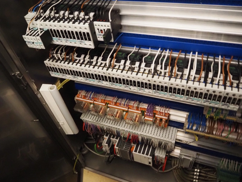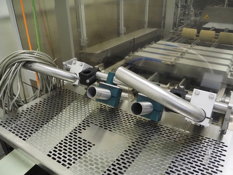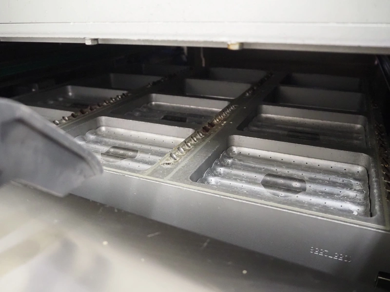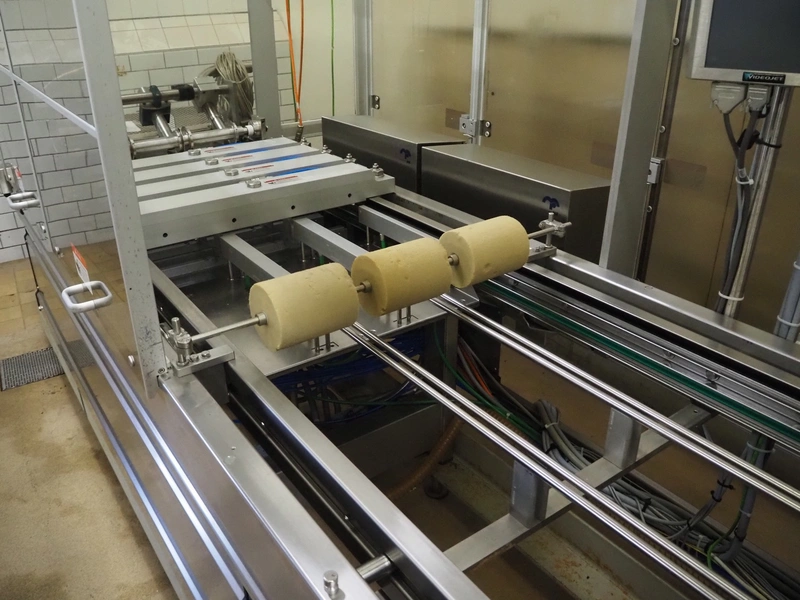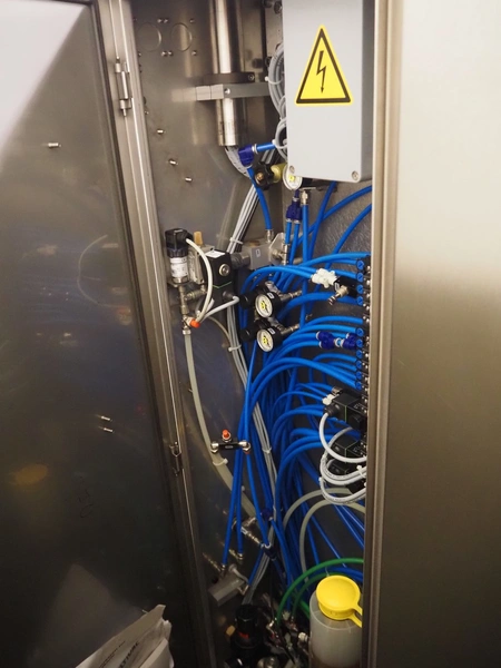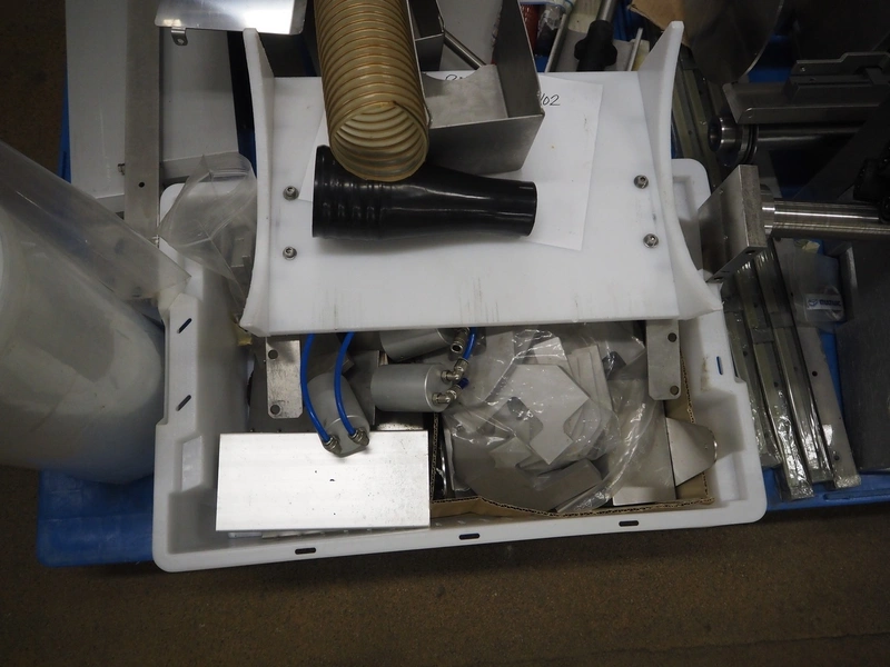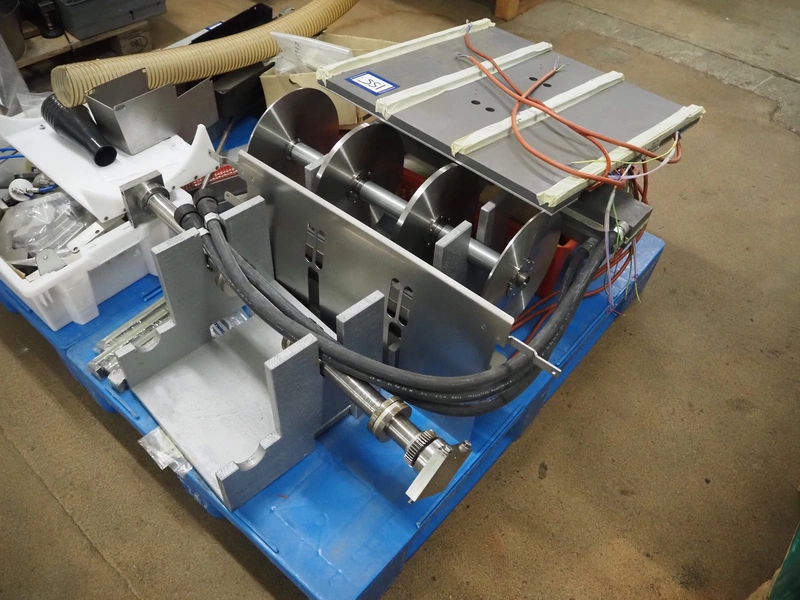 Multivac thermoformer, type: R530, number: 119401, year of construction: 2008, 400 V, 3 Ph, 50 Hz, 68 A, 28.5 kW, film width: 690 mm, dye: (12x) 165 mm x 130 mm, index: 600 mm, plastic outfeed belt, belt width: (3x) 140 mm, with 2 MR Etikettiertechnik labellers and Busch vacuum pump, total dimensions: 14150 mm x 1400 mm x 2600 mm. Including film roll holder, dimensions: 800 mm x 800 mm x 1930 mm.