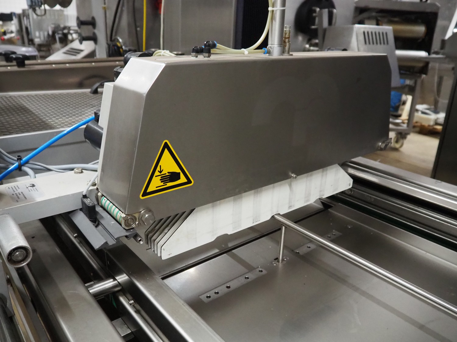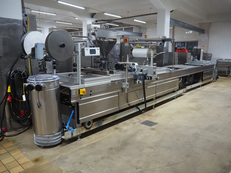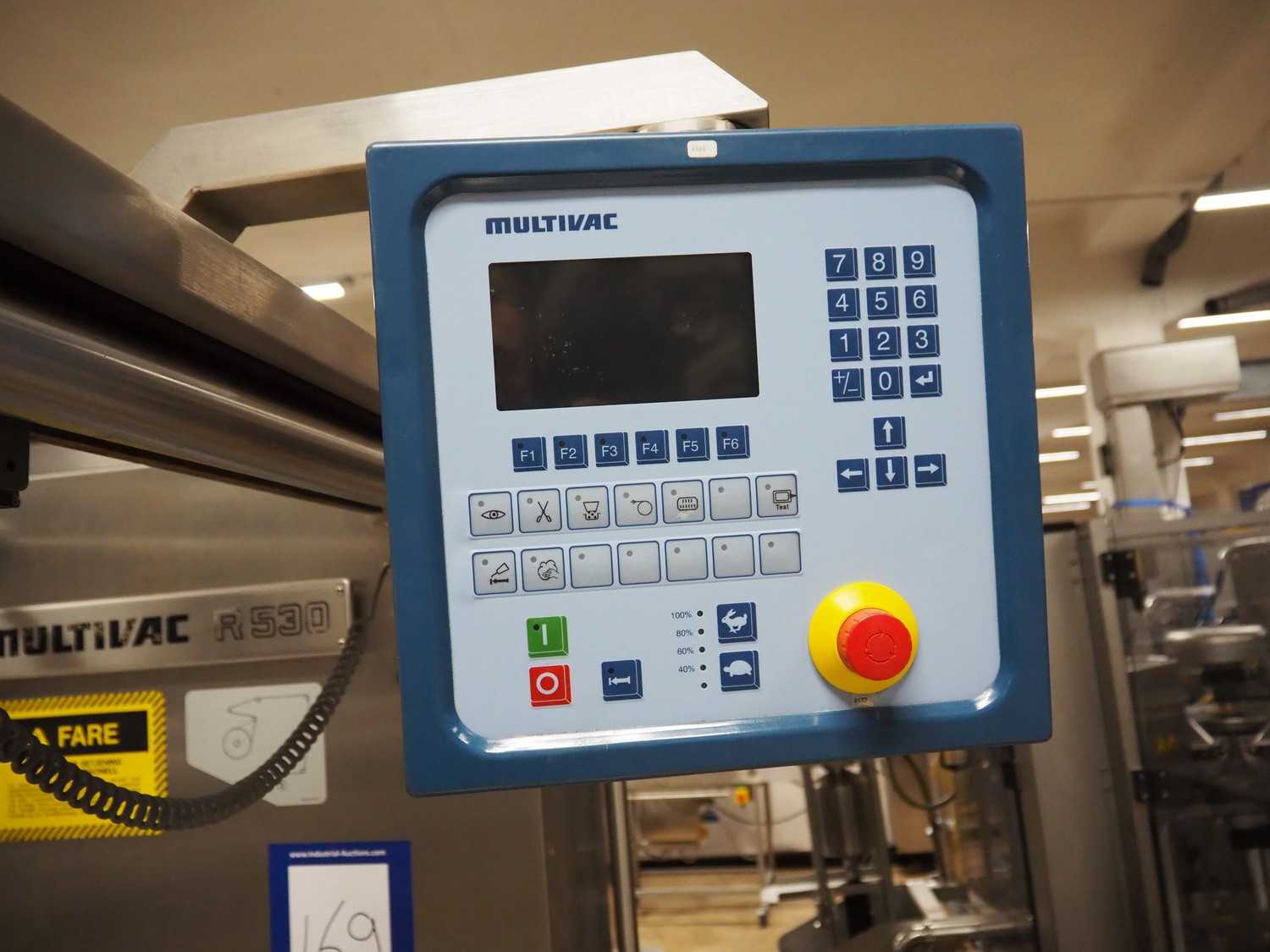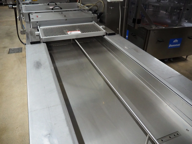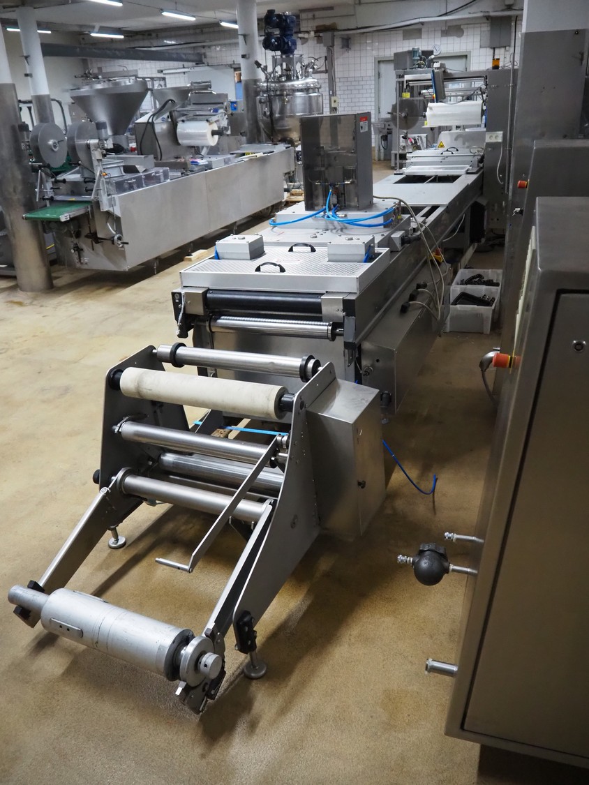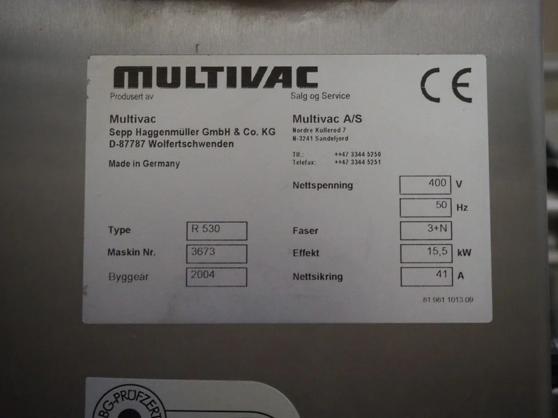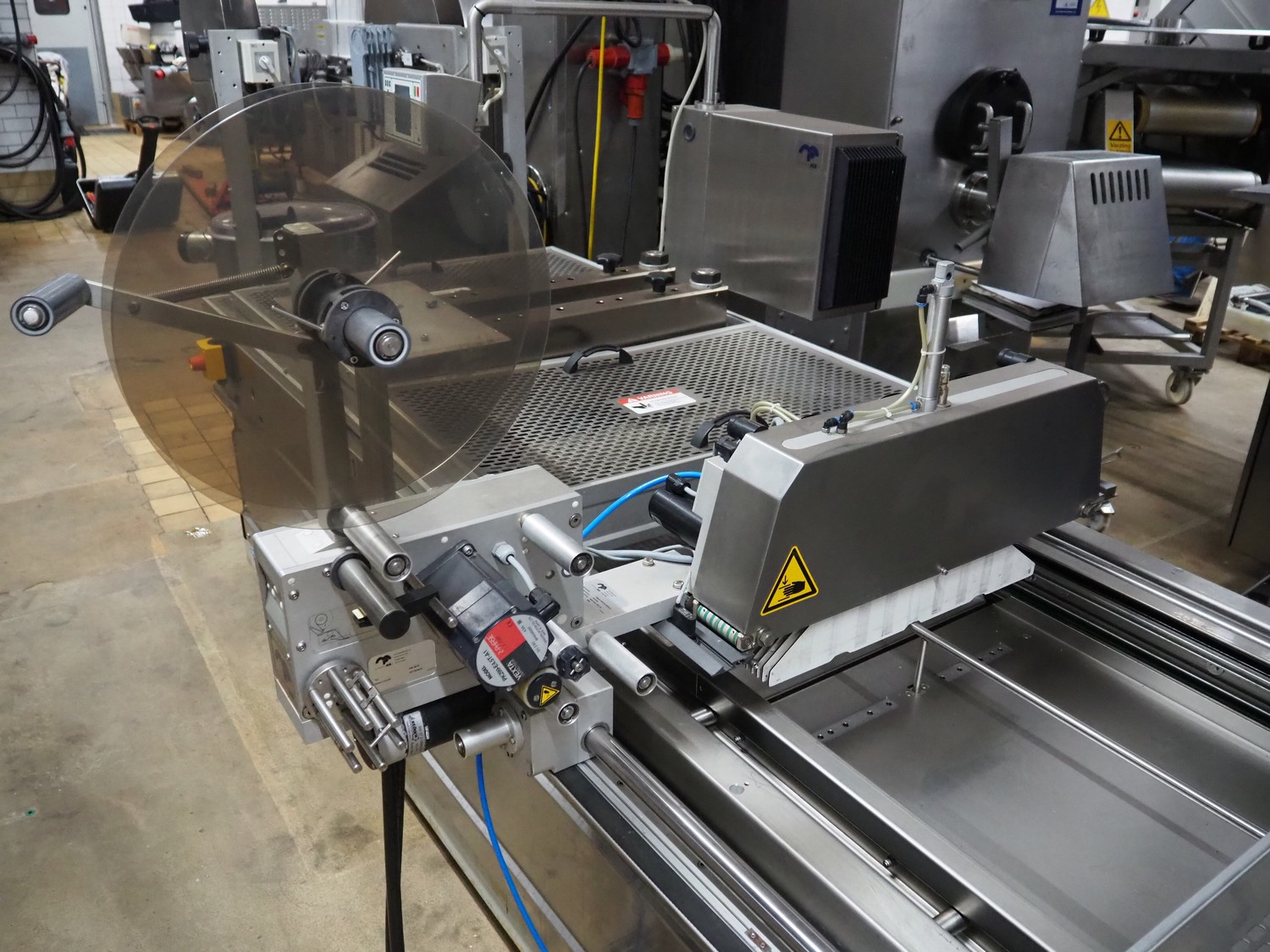 Multivac thermoformer, type: R530, number: 3673, year of construction: 2004, 400 V, 3 Ph, 50 Hz, 41 A, 15.5 kW, film width: 622 mm, dye: (2x) 367 mm x 265 mm, MR Etikettiertechnik labeller and 2 Busch vacuum pumps, type: (1x) WV 1000 B 001 KDRO, year of construction: 2003, total dimensions: 10200 mm x 1250 mm x 2000 mm. Including film unwinding device, dimensions: 1500 mm x 1500 mm x 1800 mm.