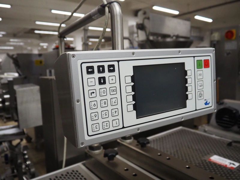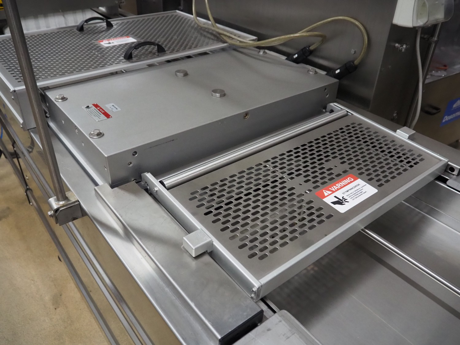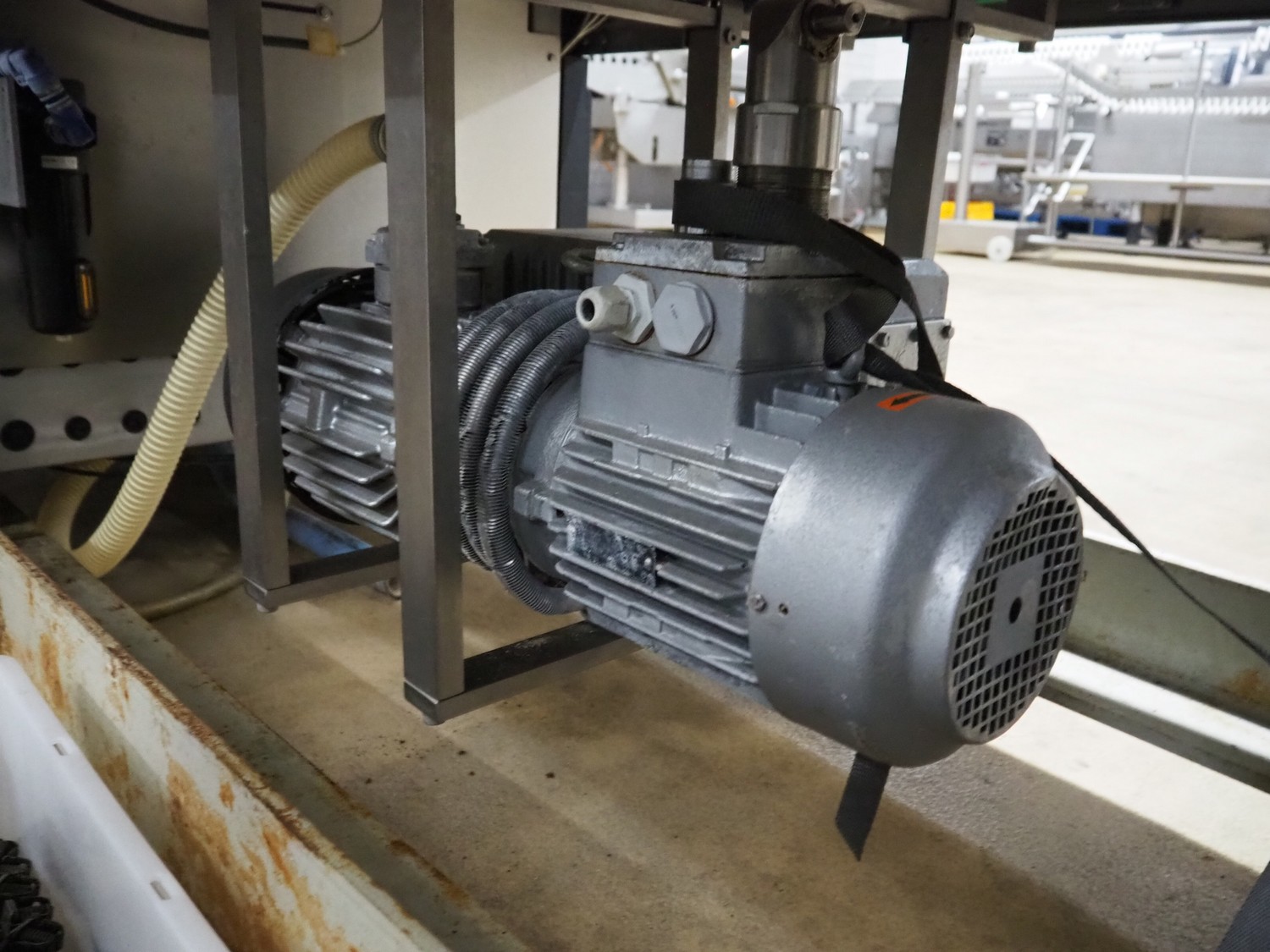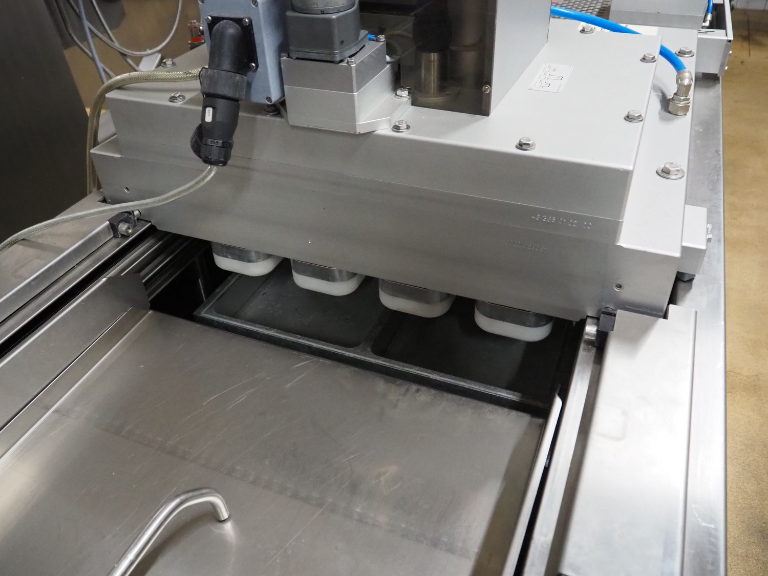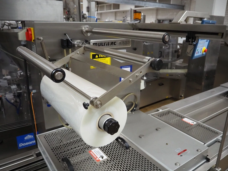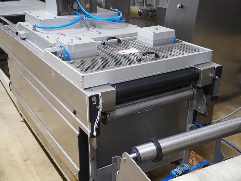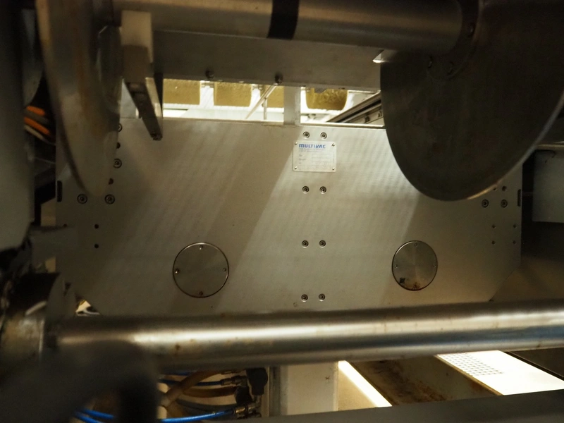 Multivac thermoformer, type: R530, number: 3673, year of construction: 2004, 400 V, 3 Ph, 50 Hz, 41 A, 15.5 kW, film width: 622 mm, dye: (2x) 367 mm x 265 mm, MR Etikettiertechnik labeller and 2 Busch vacuum pumps, type: (1x) WV 1000 B 001 KDRO, year of construction: 2003, total dimensions: 10200 mm x 1250 mm x 2000 mm. Including film unwinding device, dimensions: 1500 mm x 1500 mm x 1800 mm.