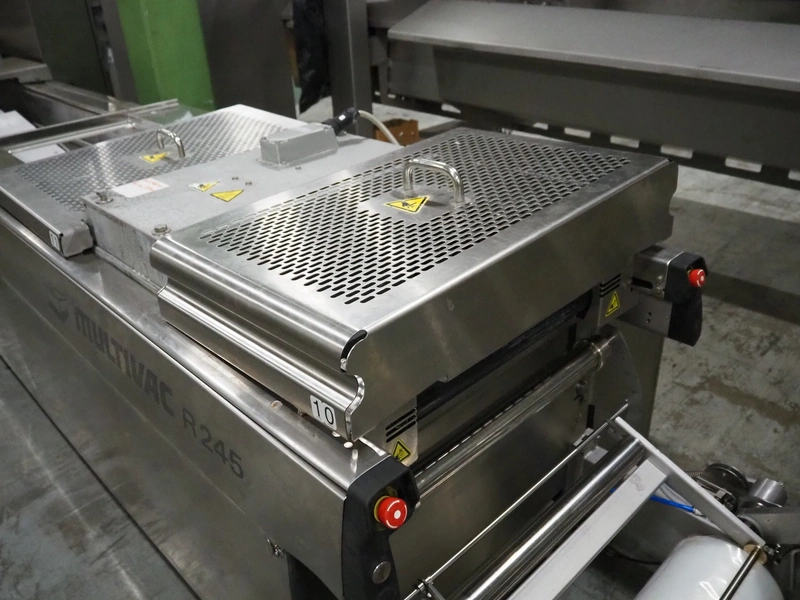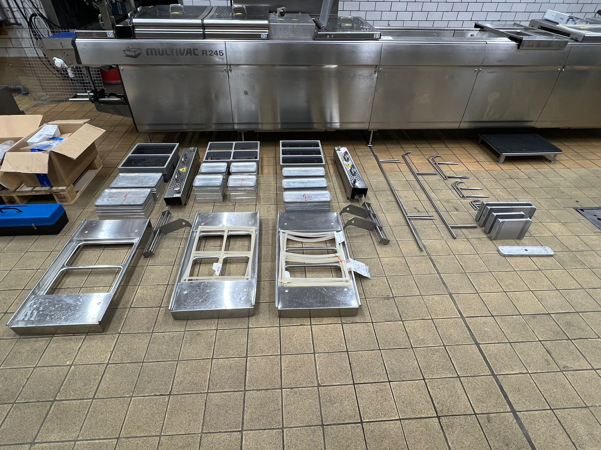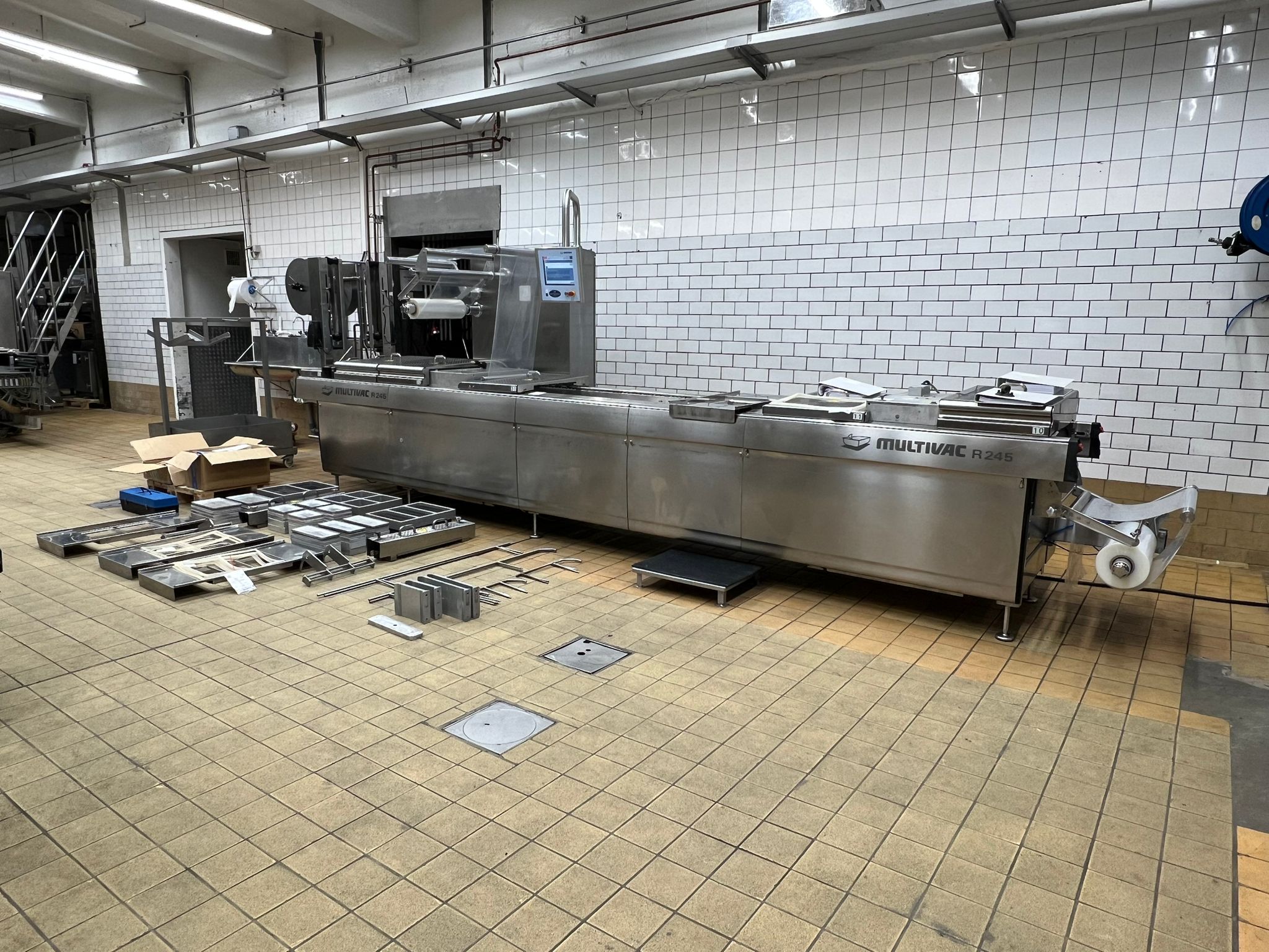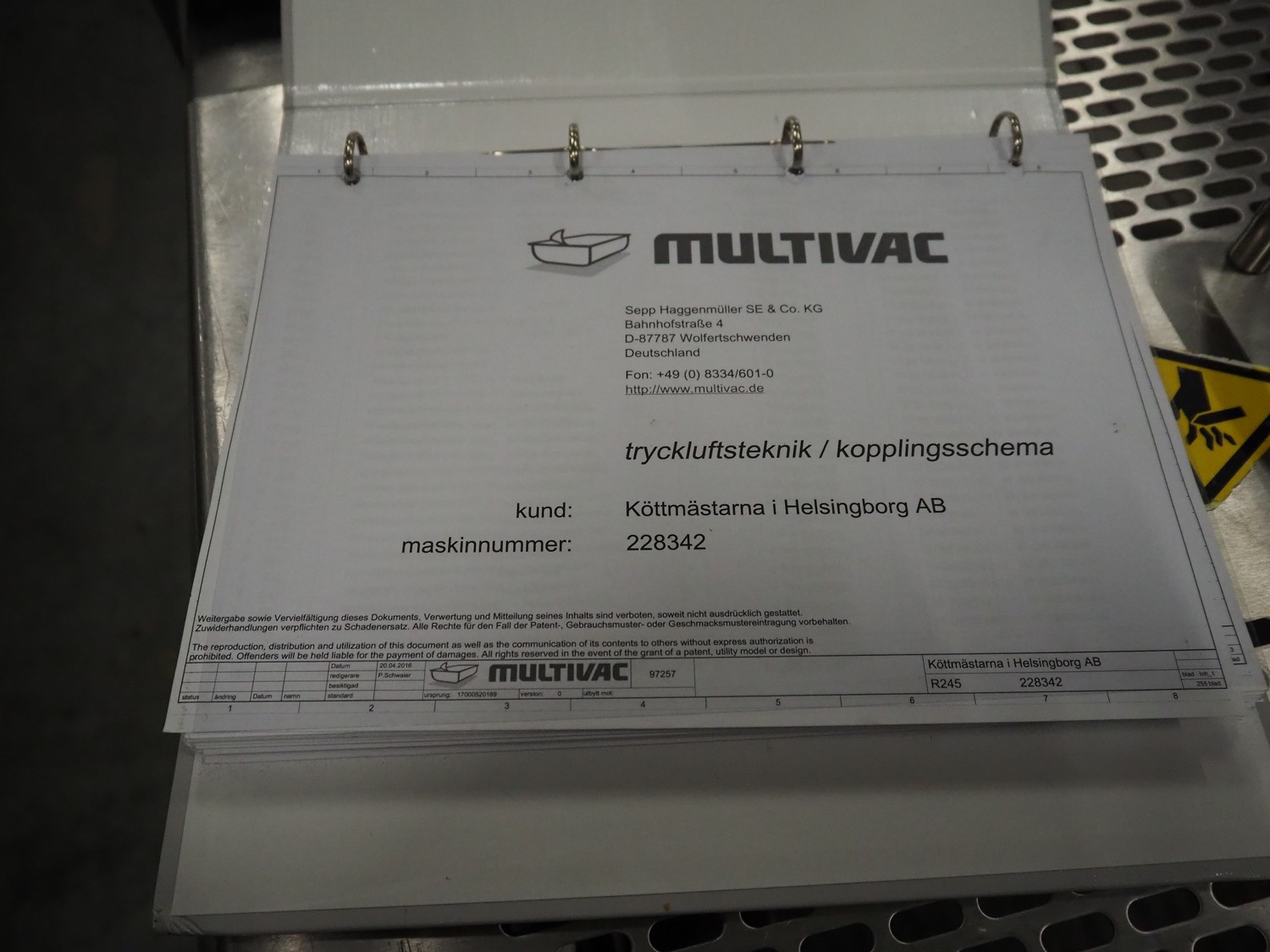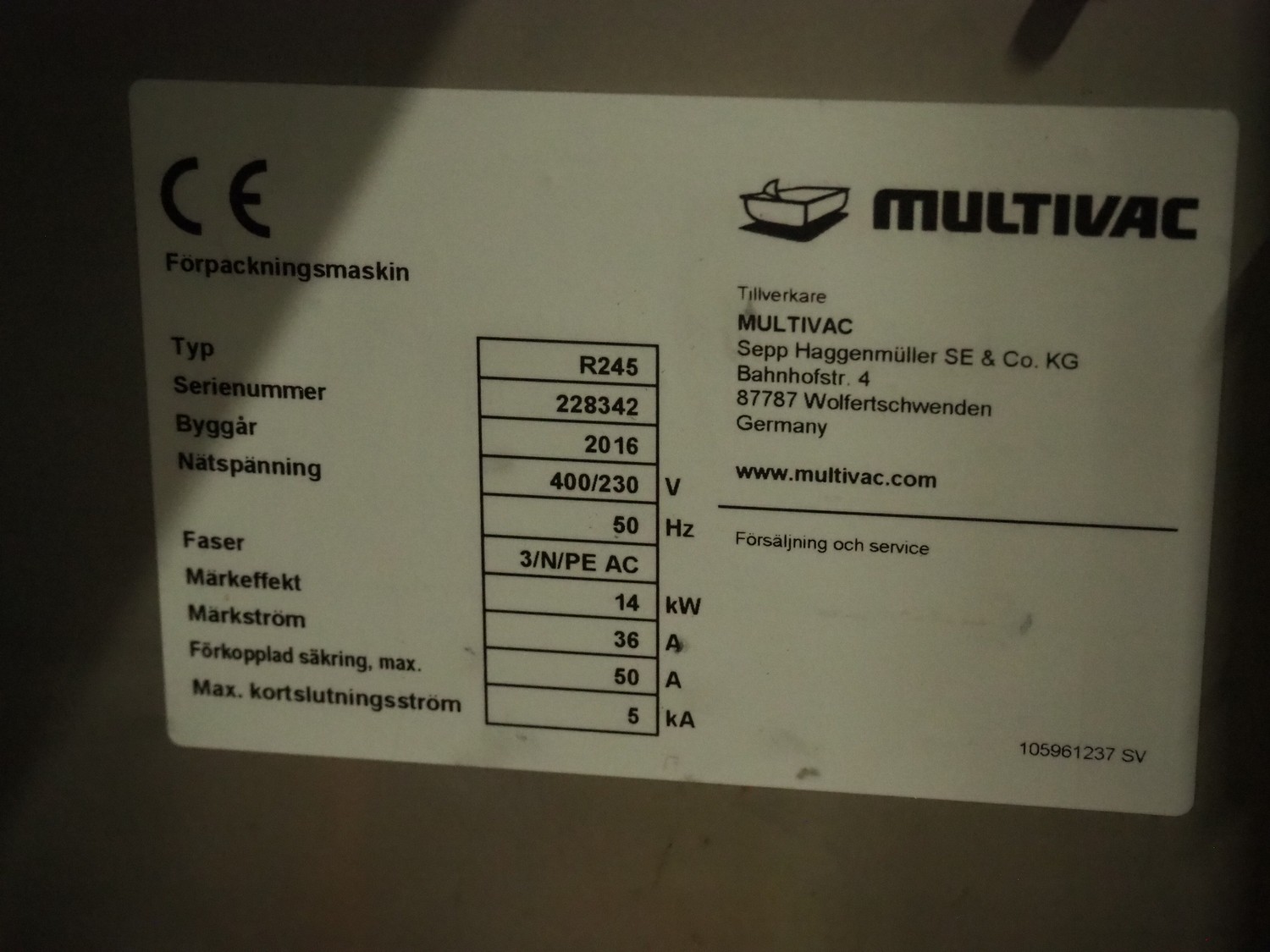 Multivac thermoformer, type: R245, serial number: 228342, year of construction: 2016, 400/230 V, 3 Ph, 50 Hz, 36/50 A, 14 kW, film width: 460 mm, dye: 322 mm x 425 mm, plastic mesh outfeed belt, belt width: 430 mm, Busch vacuum pump, type: RA 0100 F 503, capacity: 100 m³ per hour, total dimensions: 6400 mm x 1150 mm x 2350 mm, s/s trolley with parts, dimensions dye: (3x) 332 mm x 131mm, (2x) 332 mm x 205 mm, dimensions trolley: 1000 mm x 800 mm x 1400 mm.