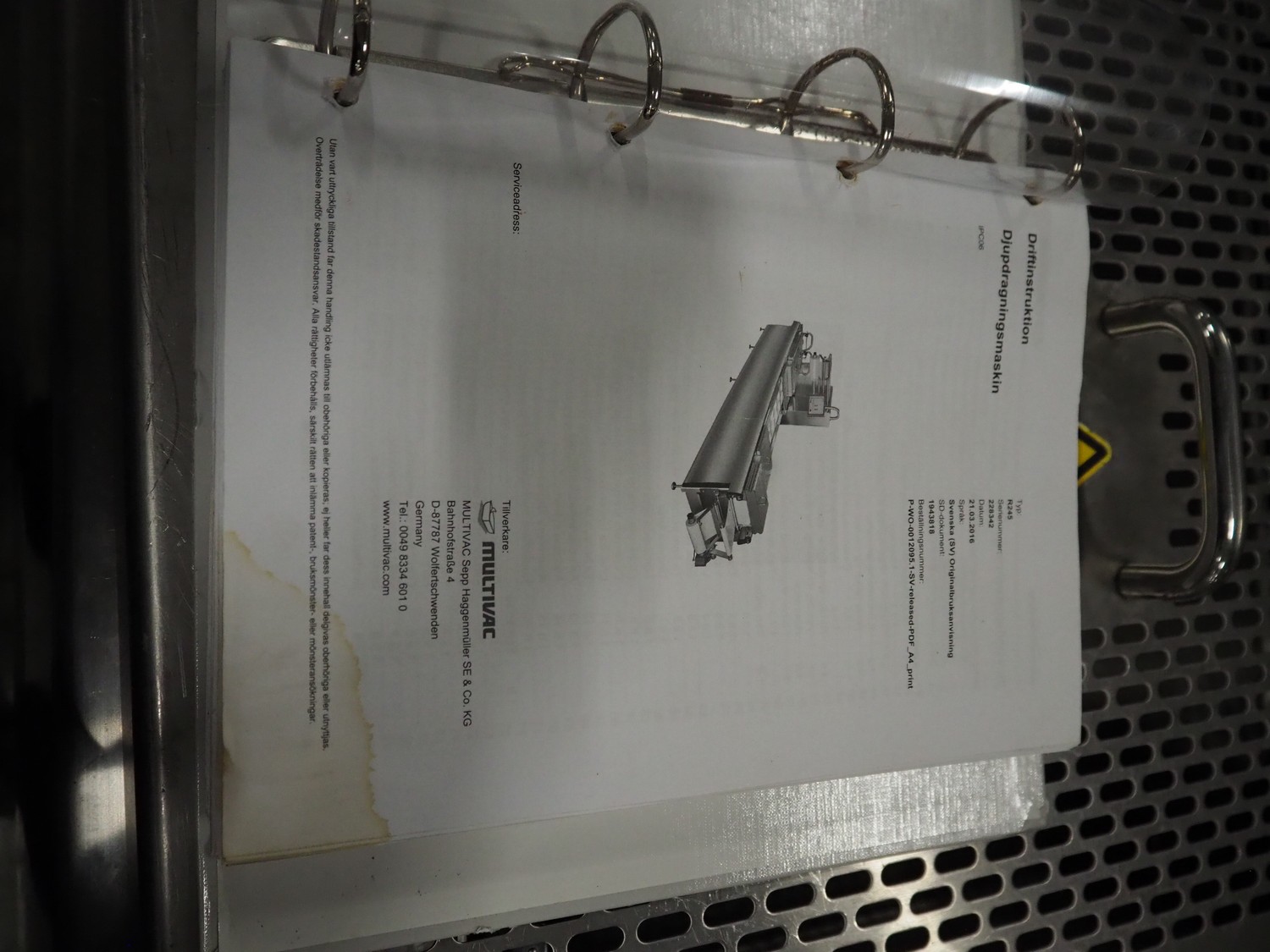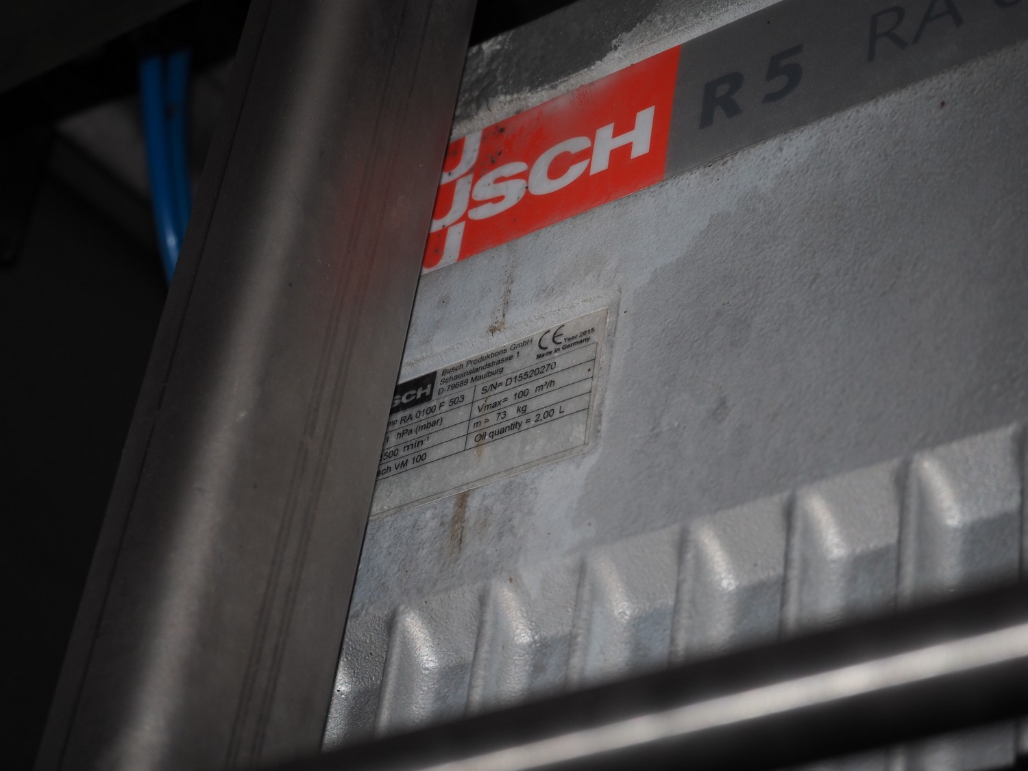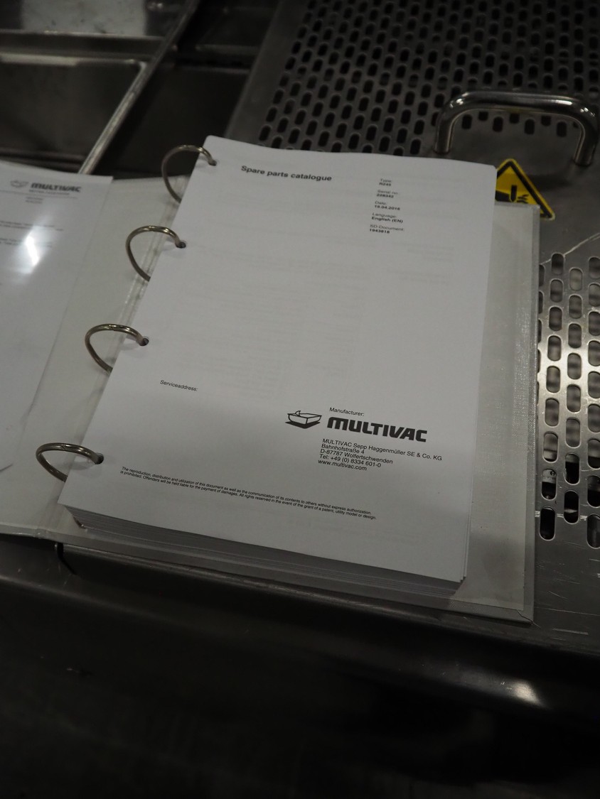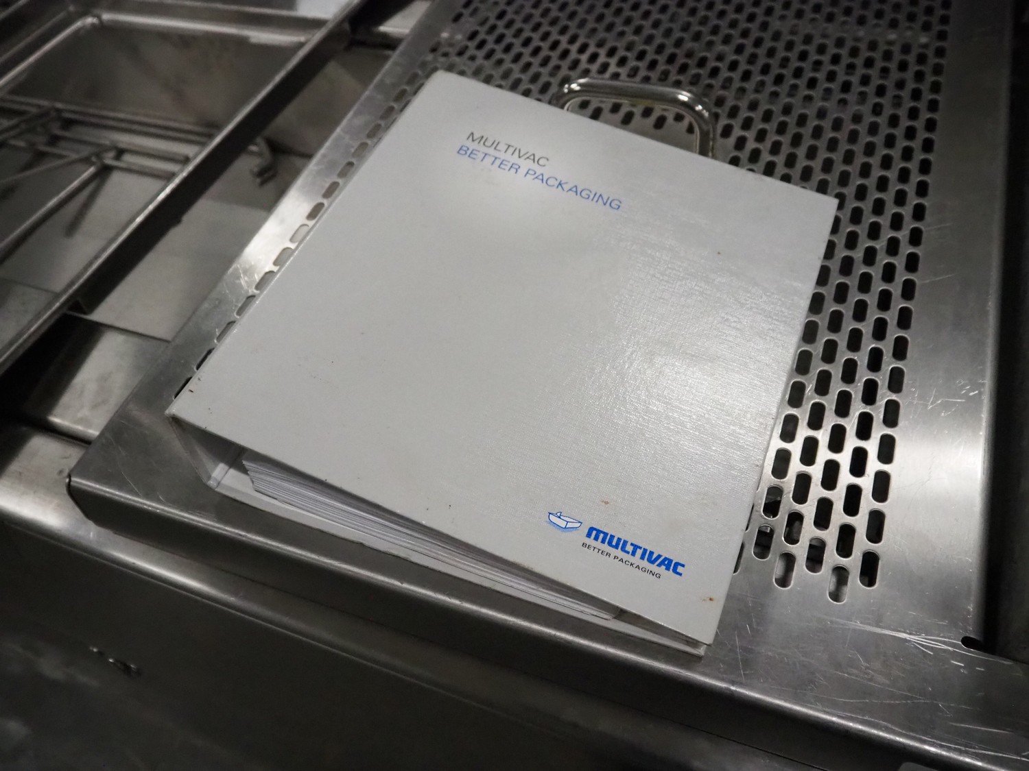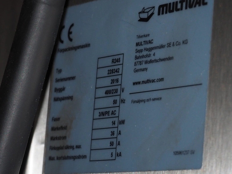 Multivac thermoformer, type: R245, serial number: 228342, year of construction: 2016, 400/230 V, 3 Ph, 50 Hz, 36/50 A, 14 kW, film width: 460 mm, dye: 322 mm x 425 mm, plastic mesh outfeed belt, belt width: 430 mm, Busch vacuum pump, type: RA 0100 F 503, capacity: 100 m³ per hour, total dimensions: 6400 mm x 1150 mm x 2350 mm, s/s trolley with parts, dimensions dye: (3x) 332 mm x 131mm, (2x) 332 mm x 205 mm, dimensions trolley: 1000 mm x 800 mm x 1400 mm.