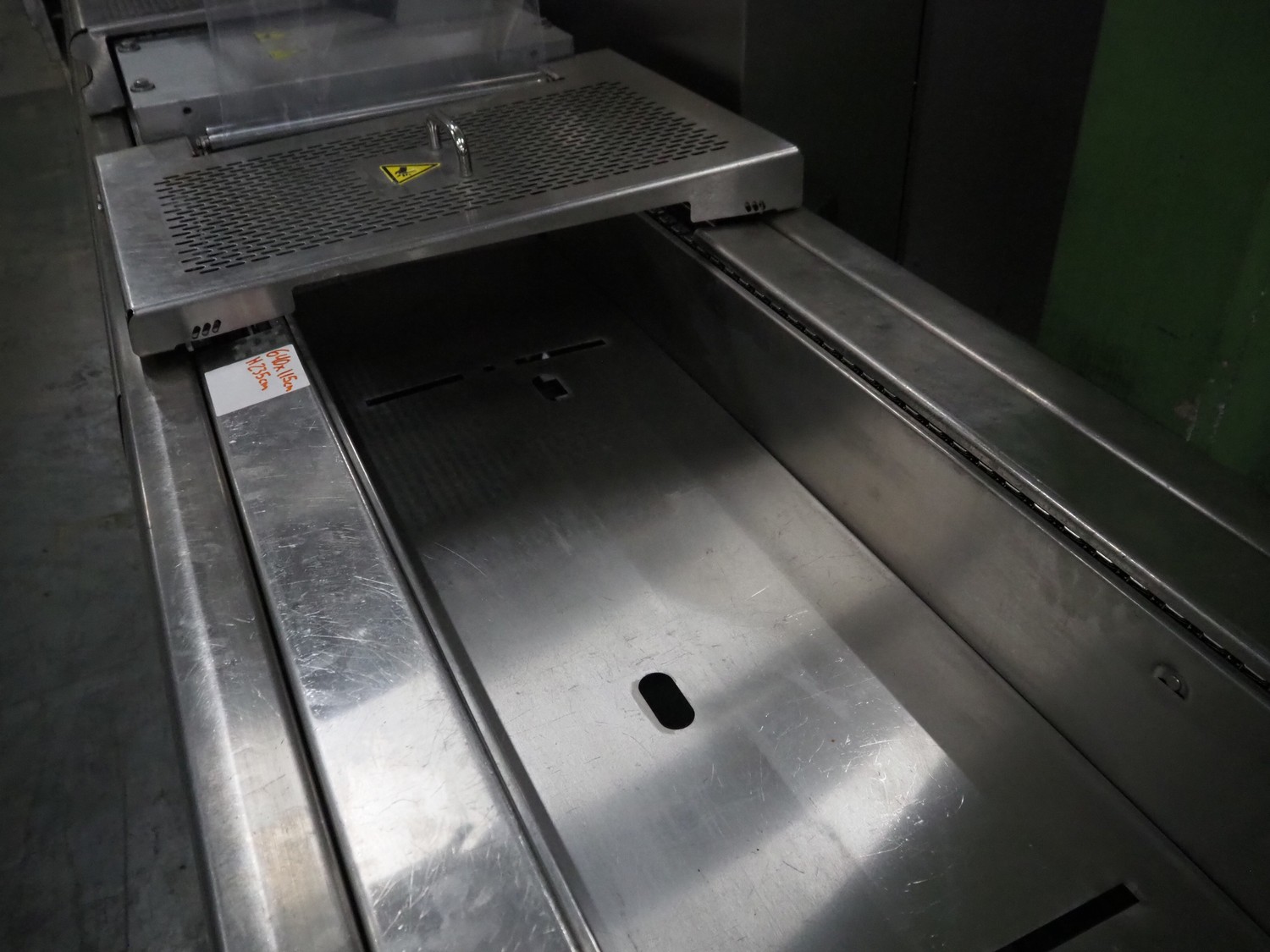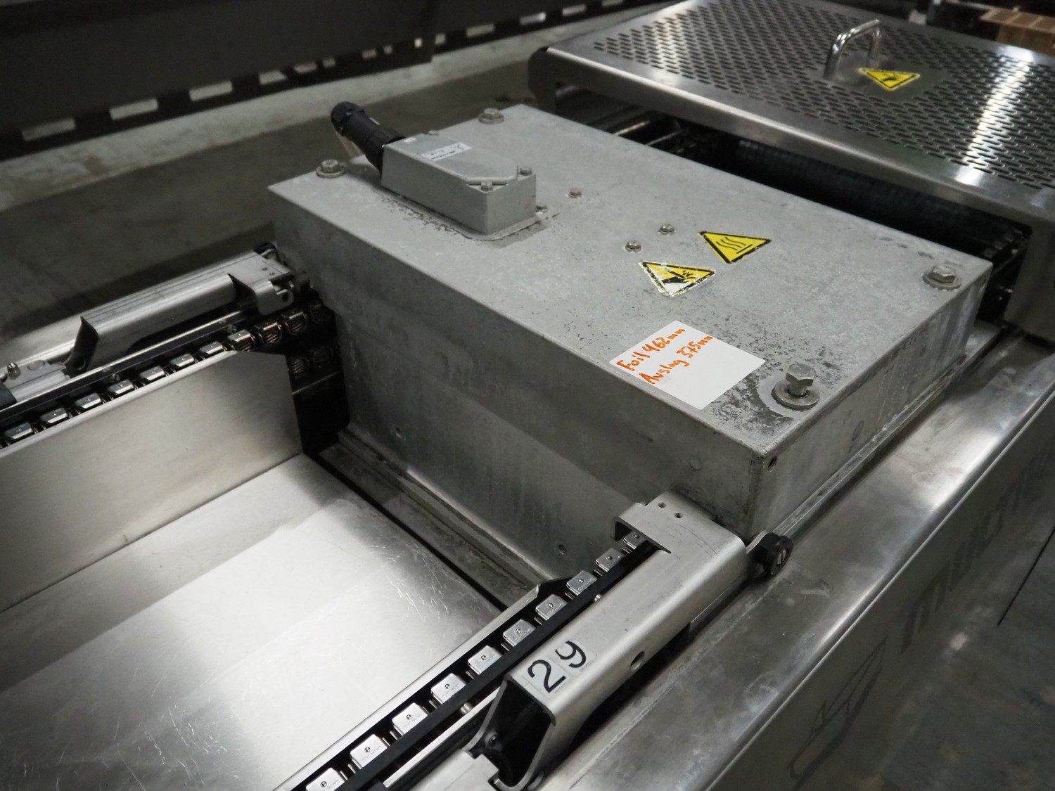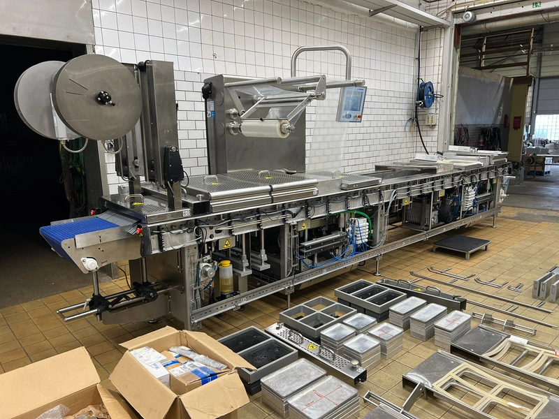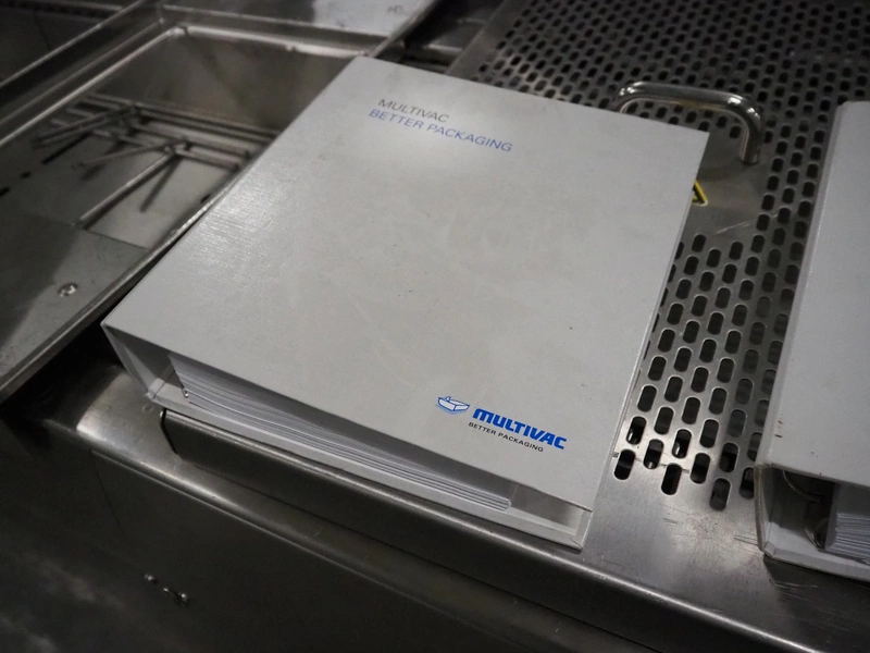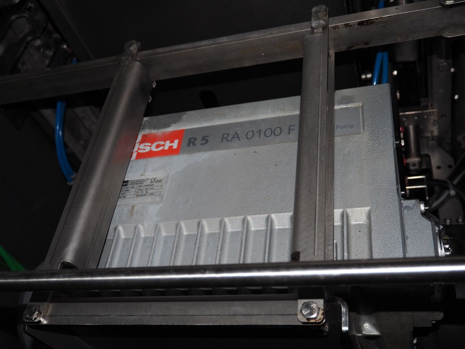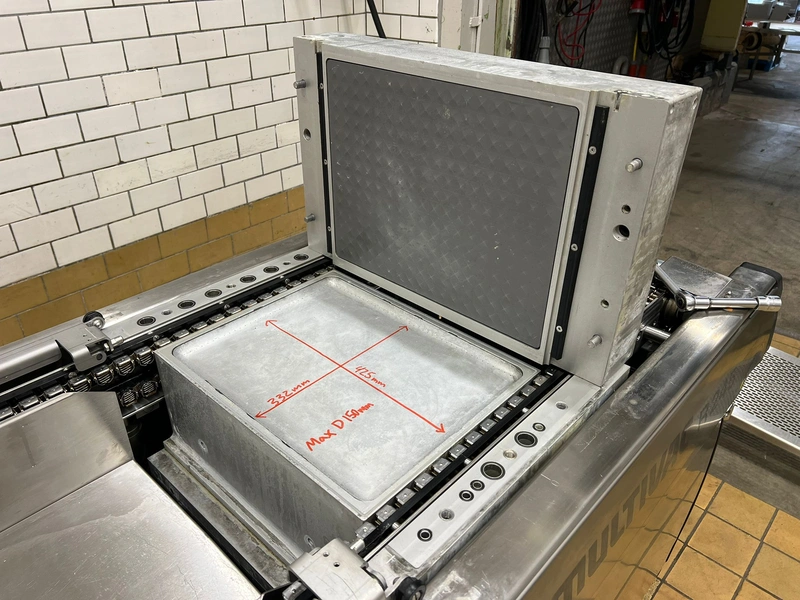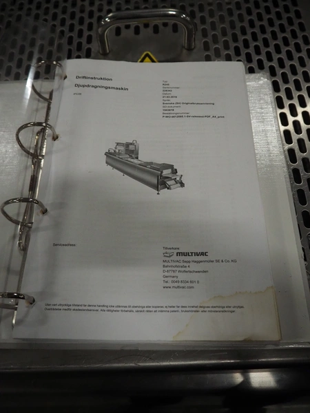 Multivac thermoformer, type: R245, serial number: 228342, year of construction: 2016, 400/230 V, 3 Ph, 50 Hz, 36/50 A, 14 kW, film width: 460 mm, dye: 322 mm x 425 mm, plastic mesh outfeed belt, belt width: 430 mm, Busch vacuum pump, type: RA 0100 F 503, capacity: 100 m³ per hour, total dimensions: 6400 mm x 1150 mm x 2350 mm, s/s trolley with parts, dimensions dye: (3x) 332 mm x 131mm, (2x) 332 mm x 205 mm, dimensions trolley: 1000 mm x 800 mm x 1400 mm.